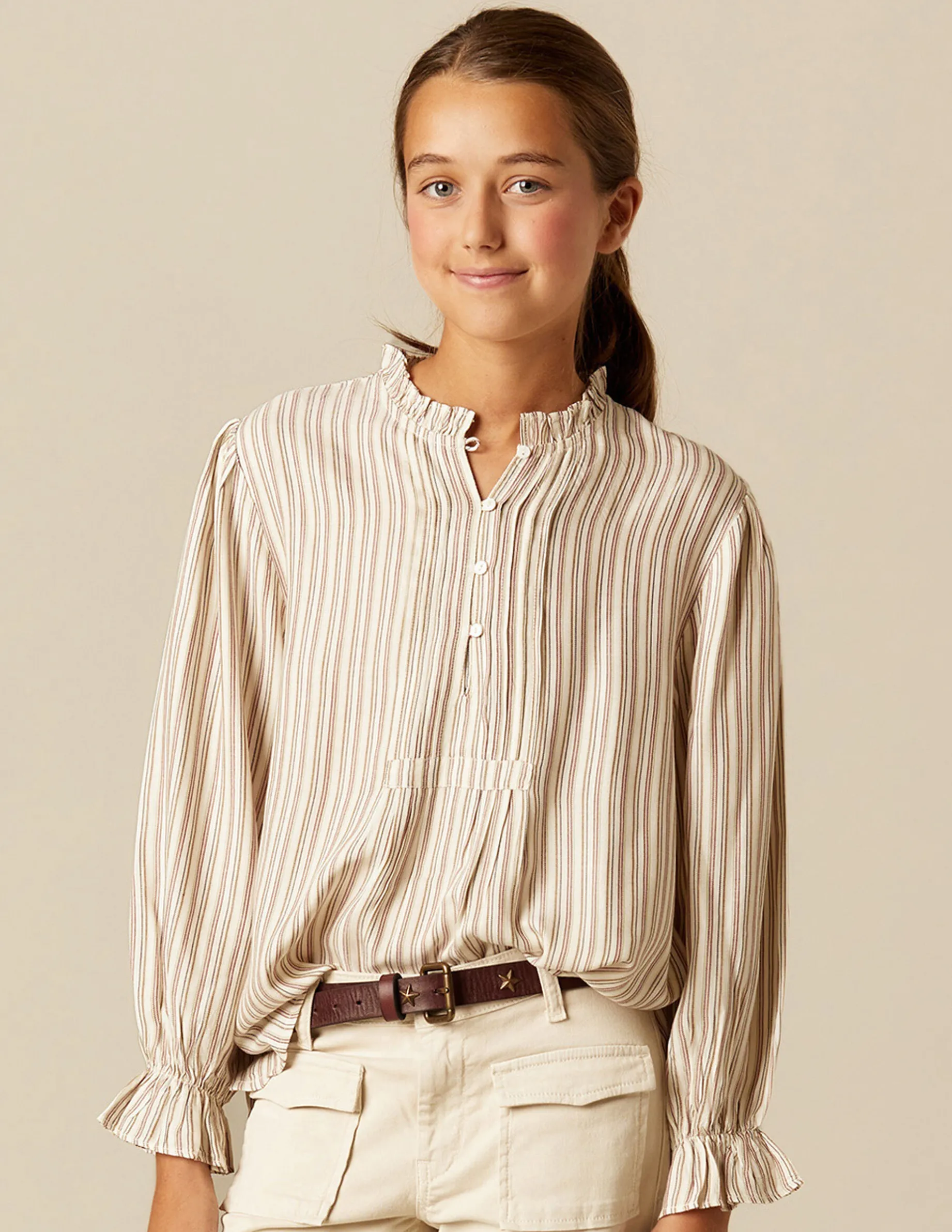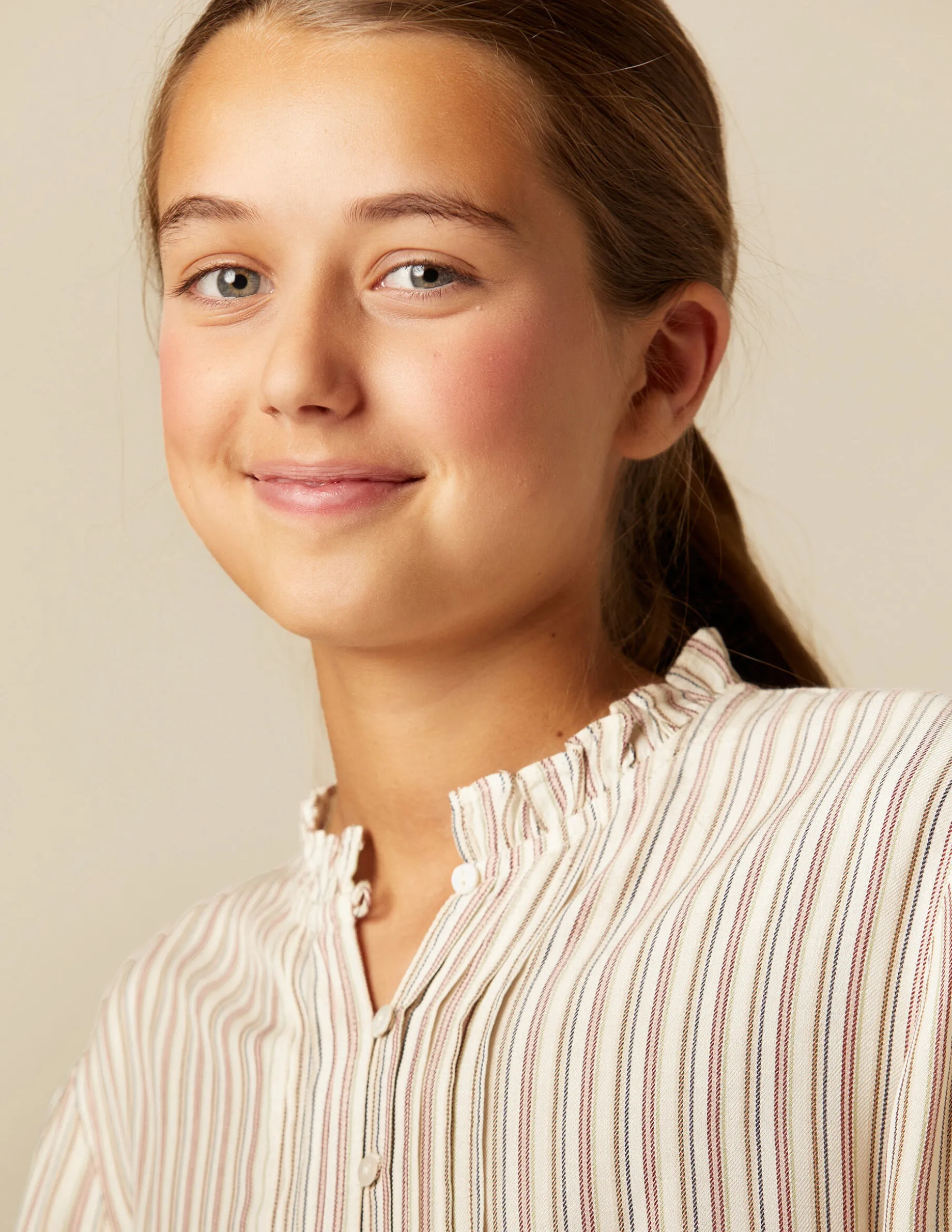 Camisa cruda de teen, con rayas en colorido de la colección. Patrón con cuello perkins, jaretas y botones hasta la altura del pecho. Manga larga.