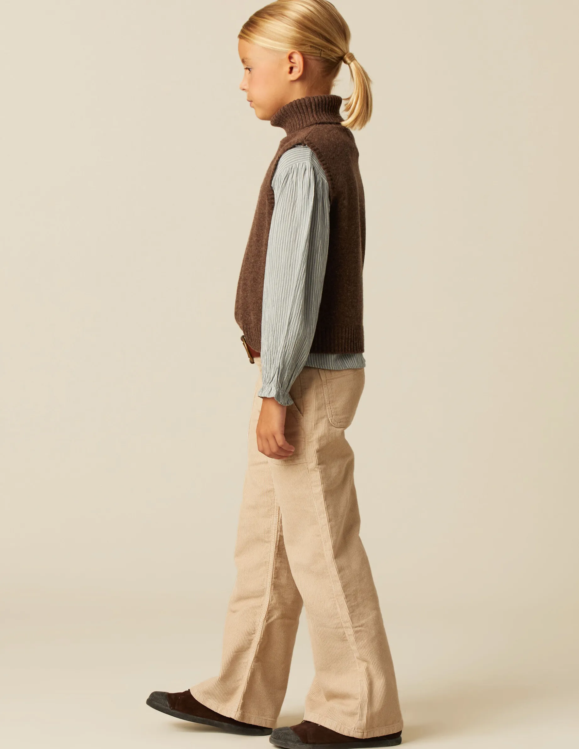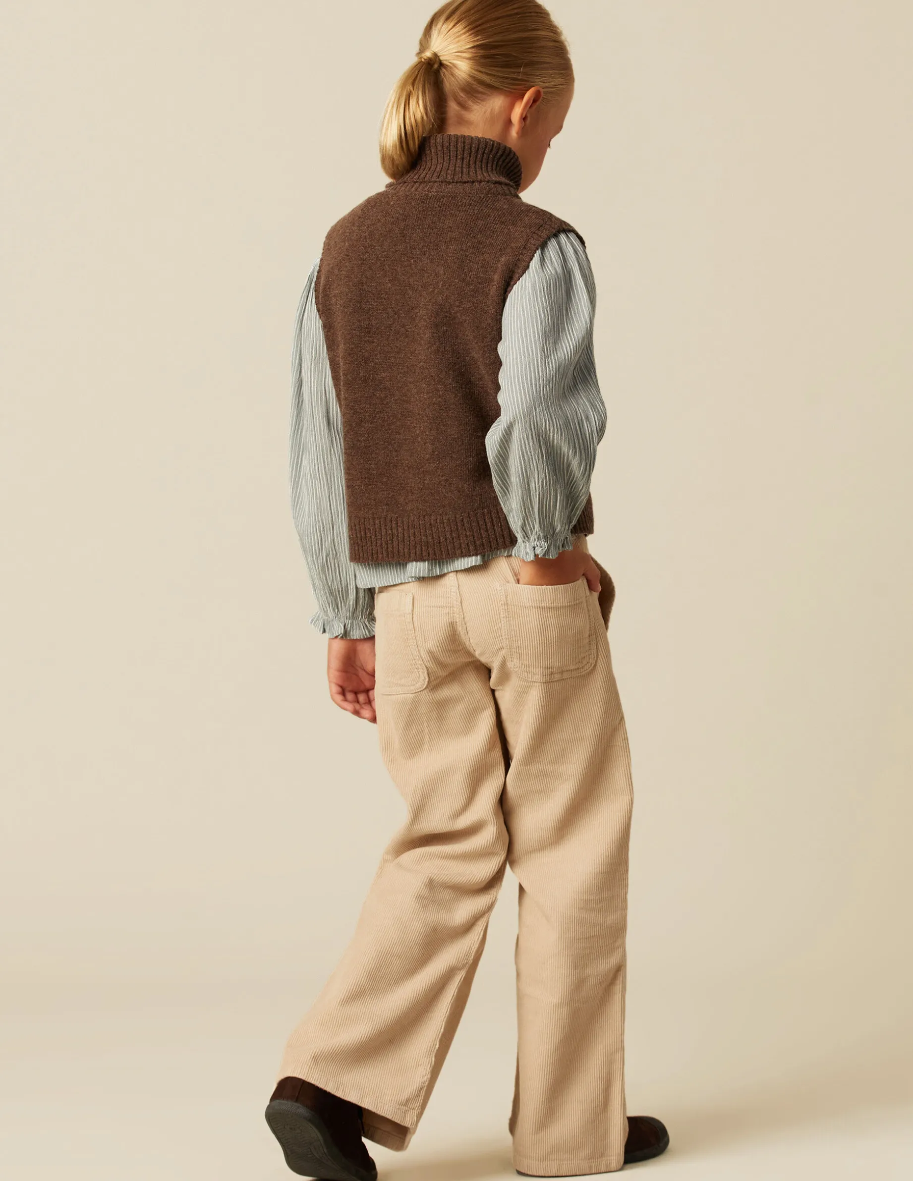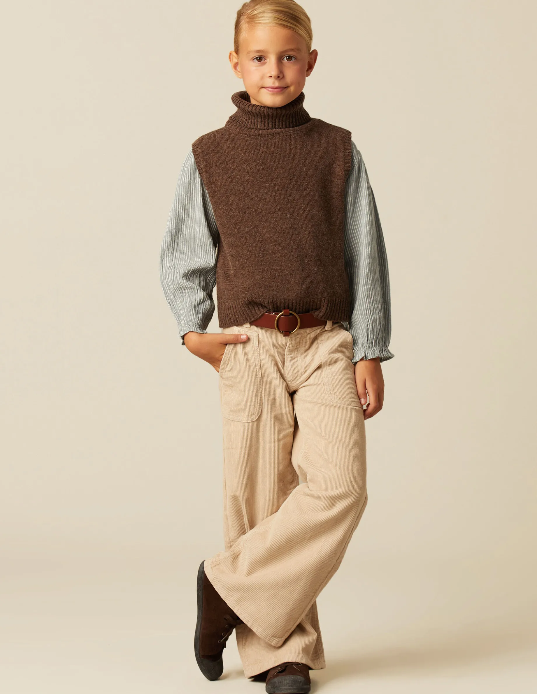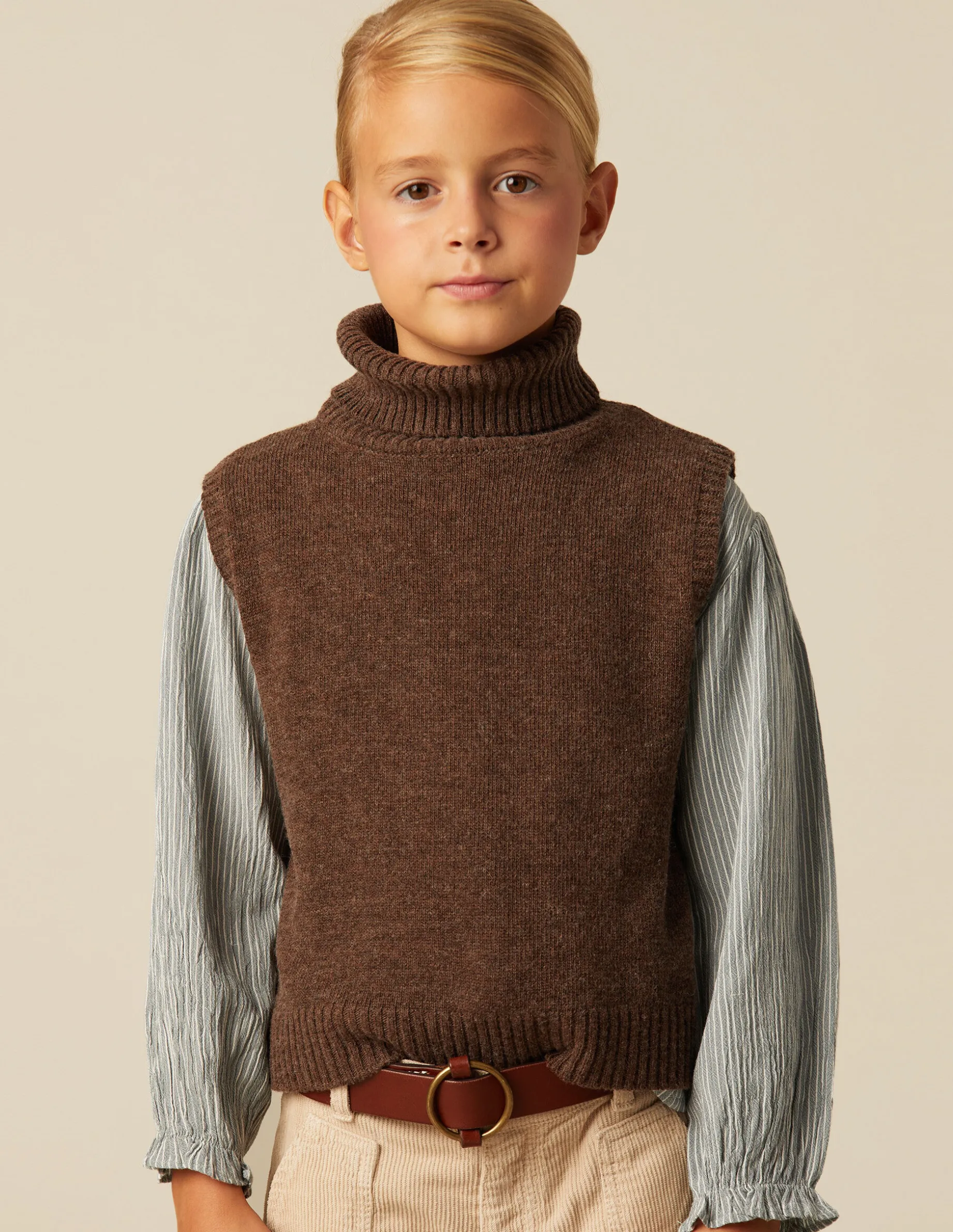 Chaleco de cuello vuelto en punto marrón oscuro.