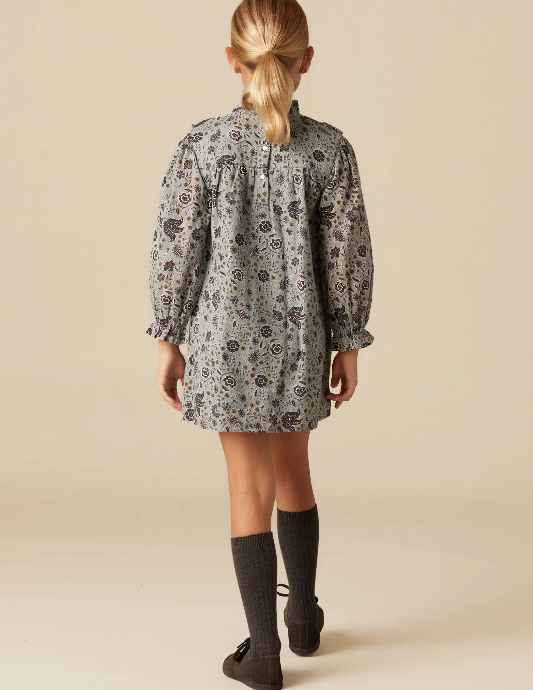 Vestido corto de niña, en estampado de la colección. Patrón con manga larga, rematada en puño, y detalle de jaretas en el pecho.