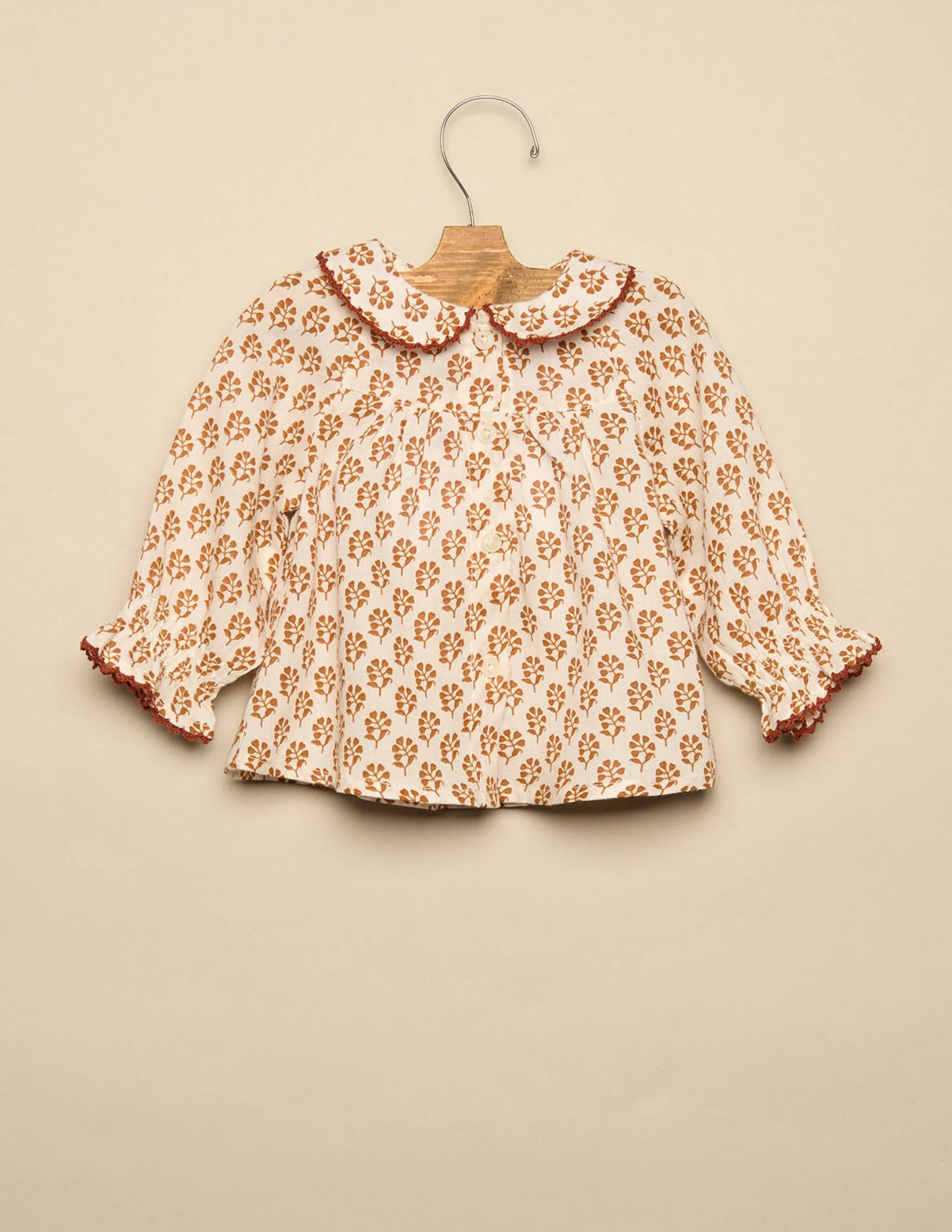 Camisa de bebé, en print de la colección. Patrón con cuello lunas, con detalle de stitching a contraste. Manga larga rematada con volante. Cierre frontal.