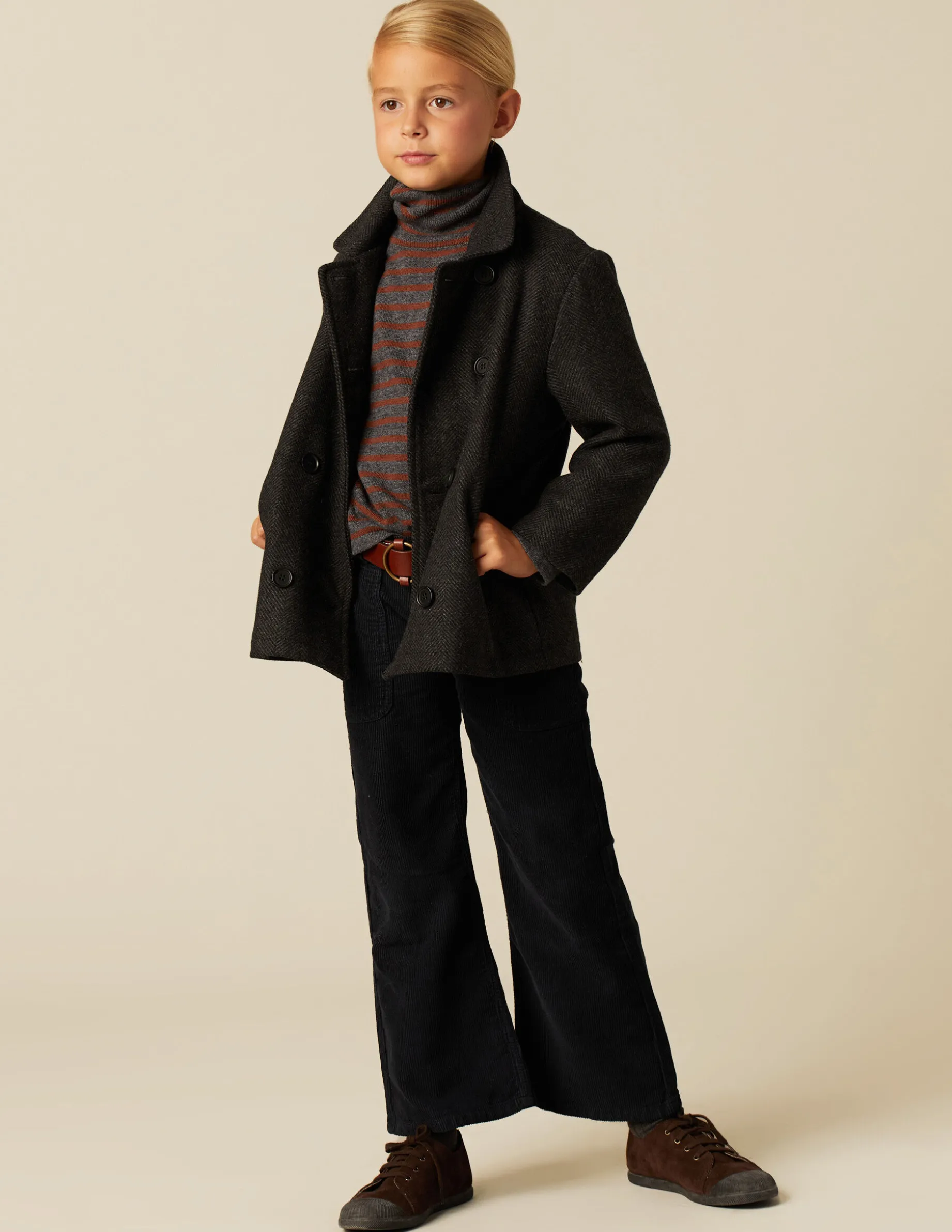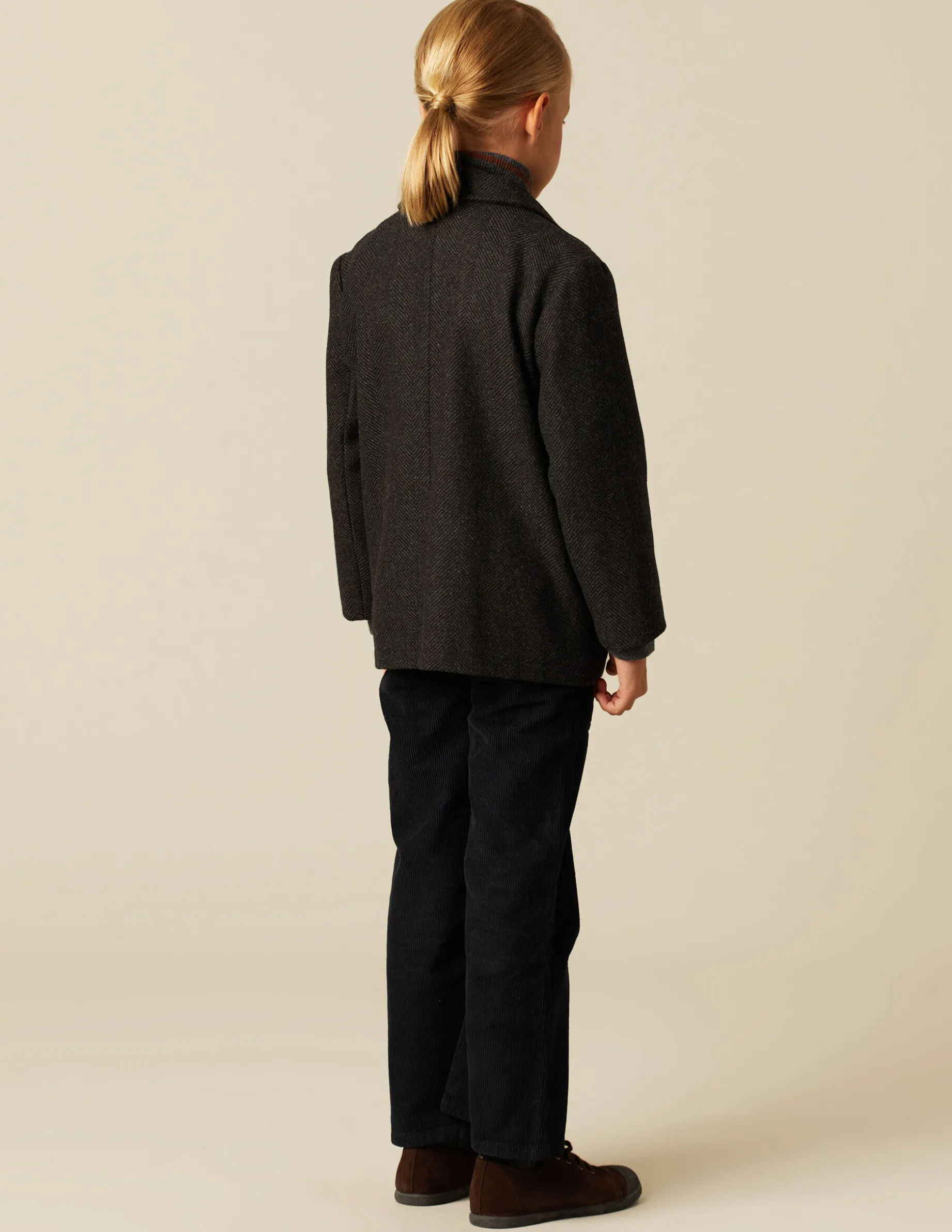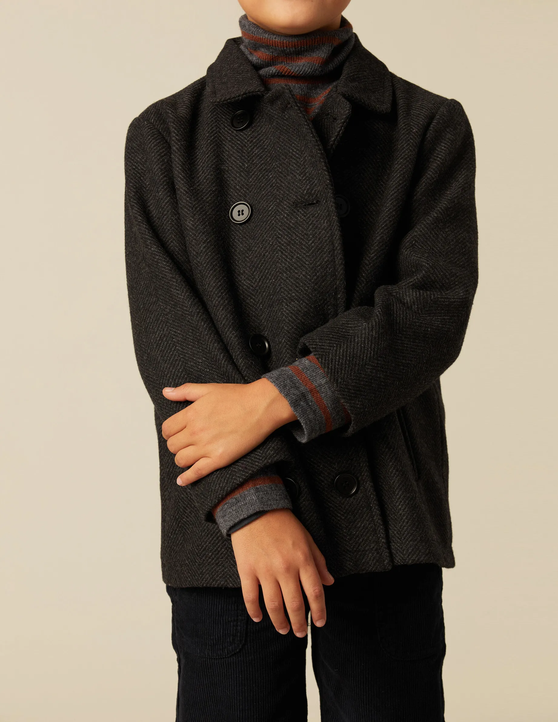 Abrigo cruzado en tejido espiga gris. Cierre con botonadura en delantero.