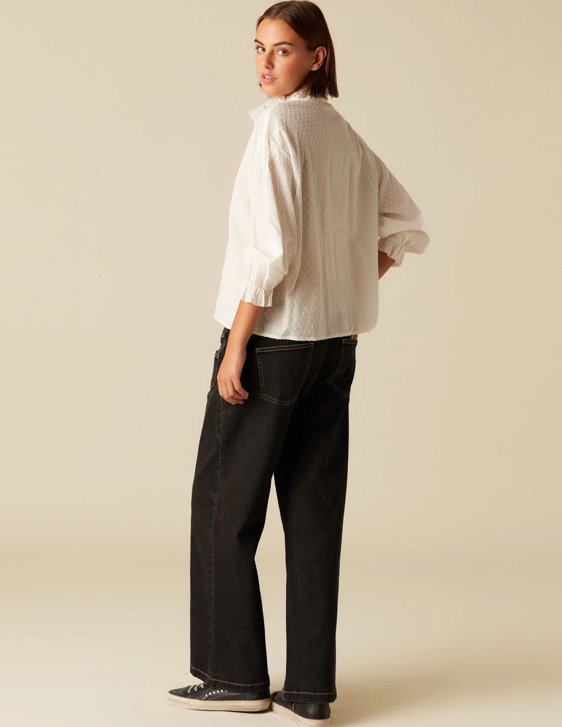 Camisa de chica cruda, en tejido con textura. Patrón con cuello perkins, manga larga y cierre con botones por delante.