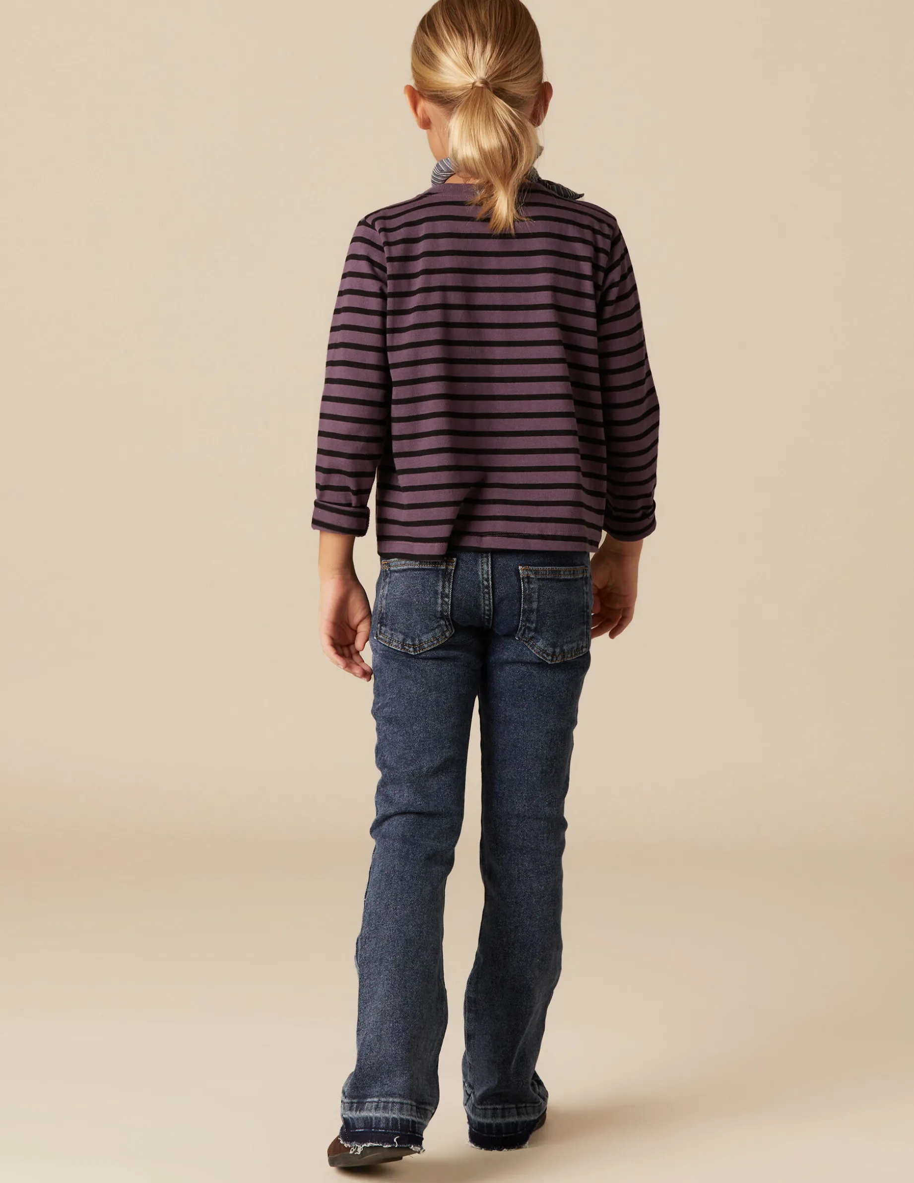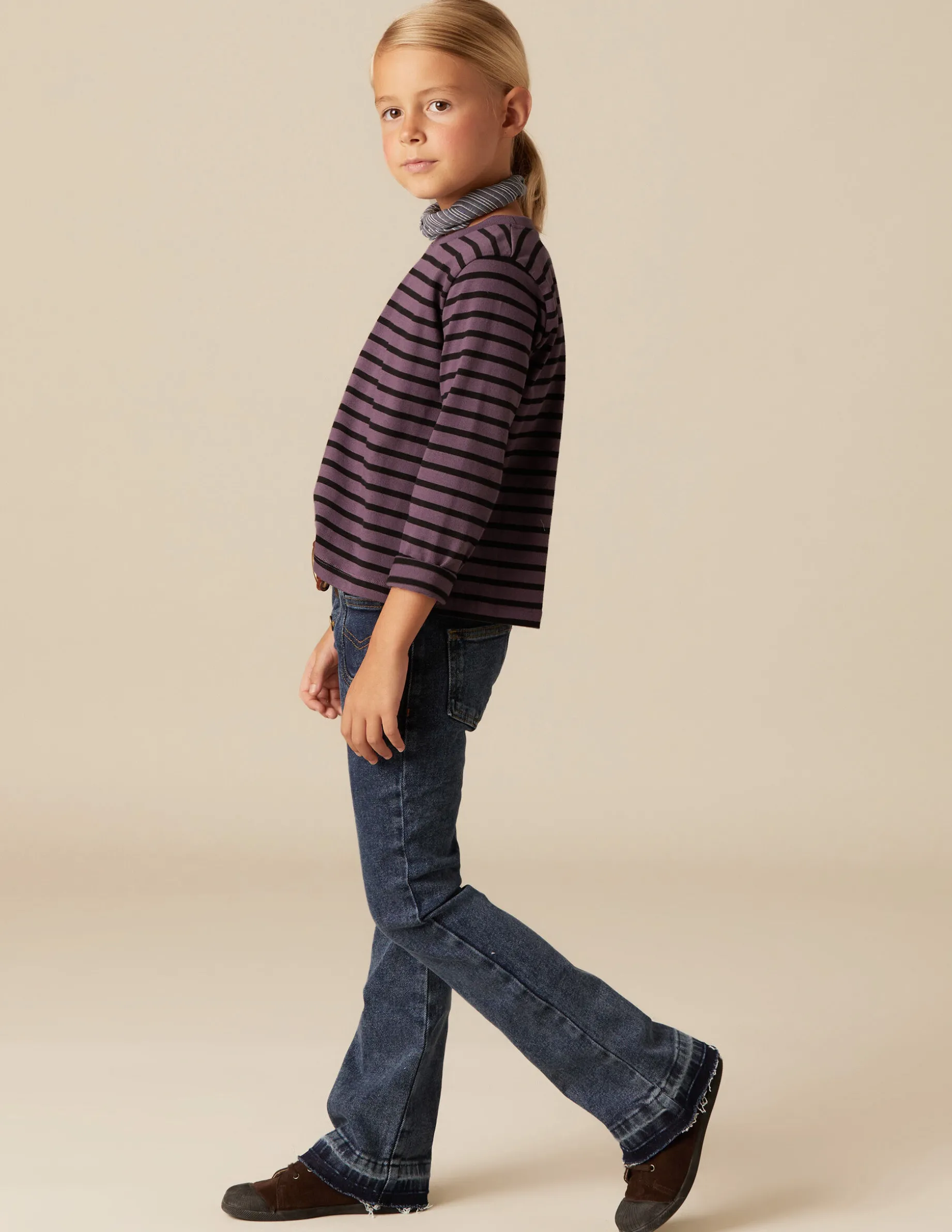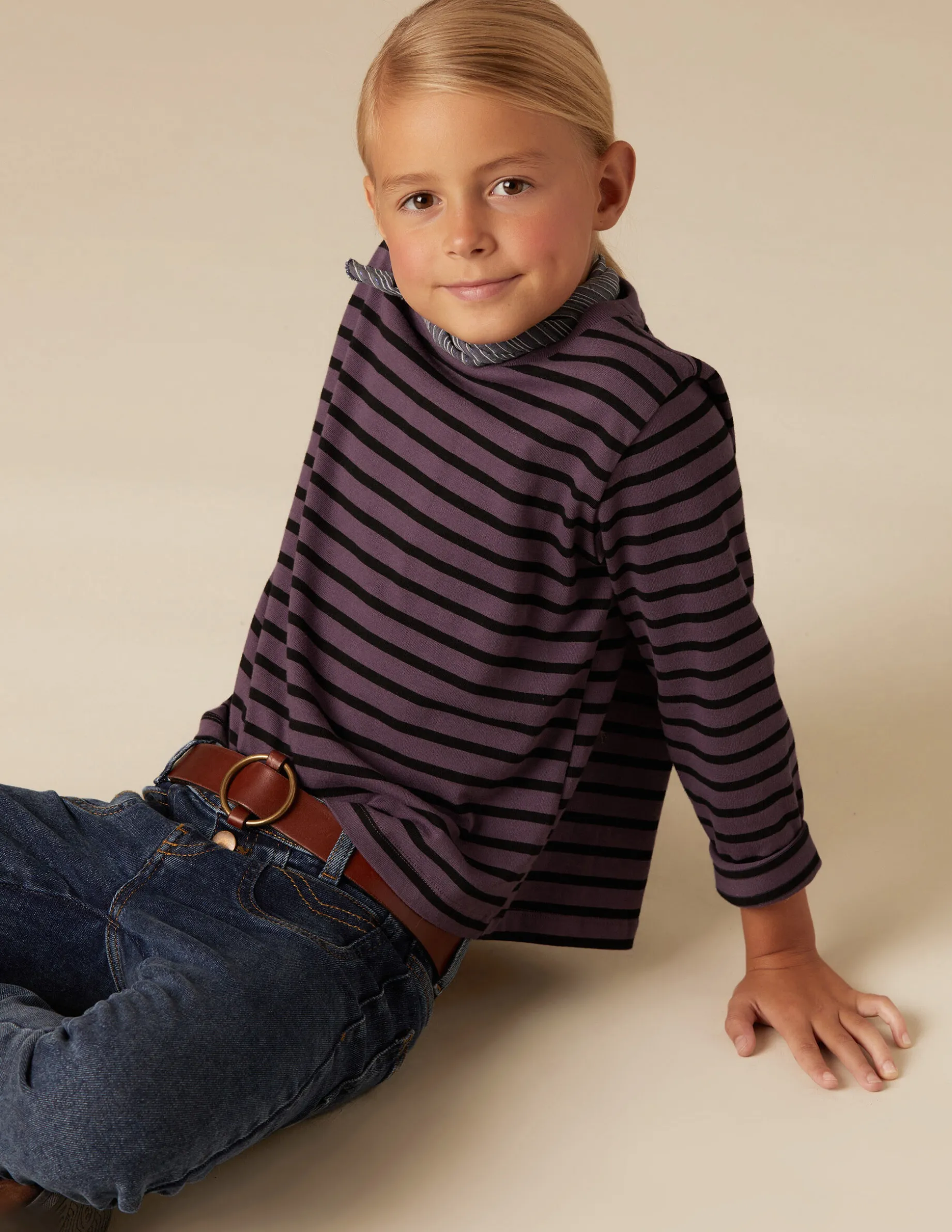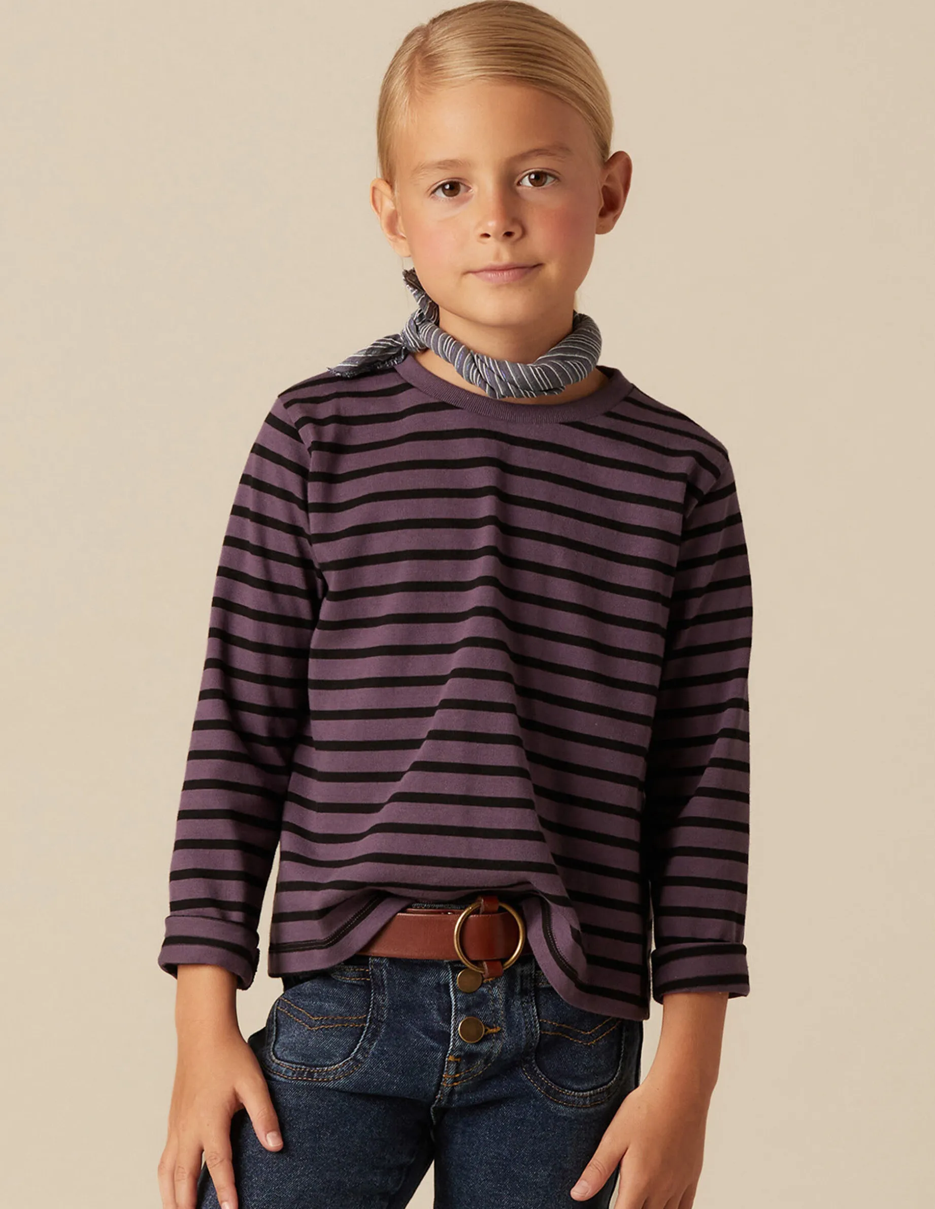 Camiseta de niña, en color de la colección con rayas grandes antracita. Patrón con cuello redondo y manga larga. Parte de los beneficios recibidos se destinan a la Fundación a la Par, con la que Nícoli colabora desde hace años.