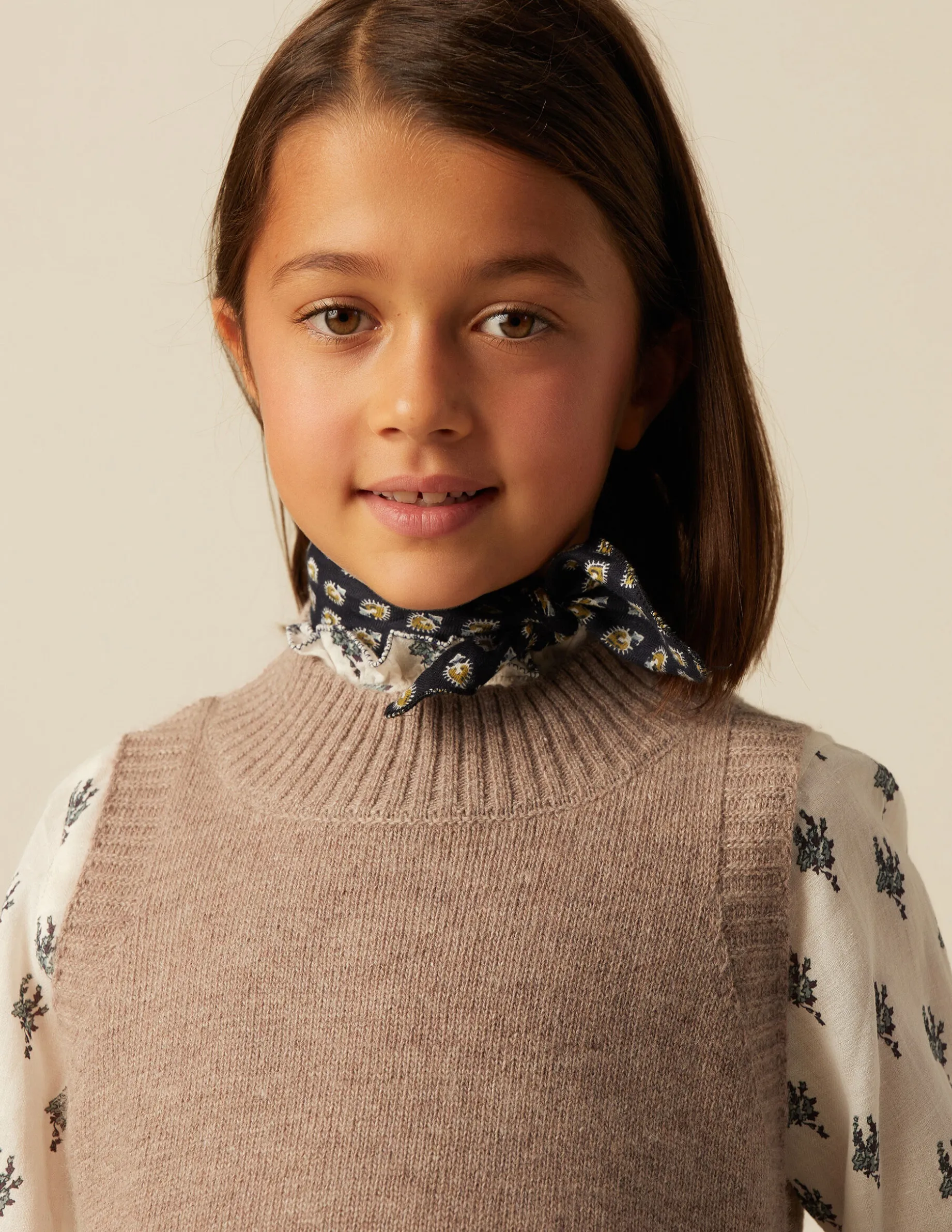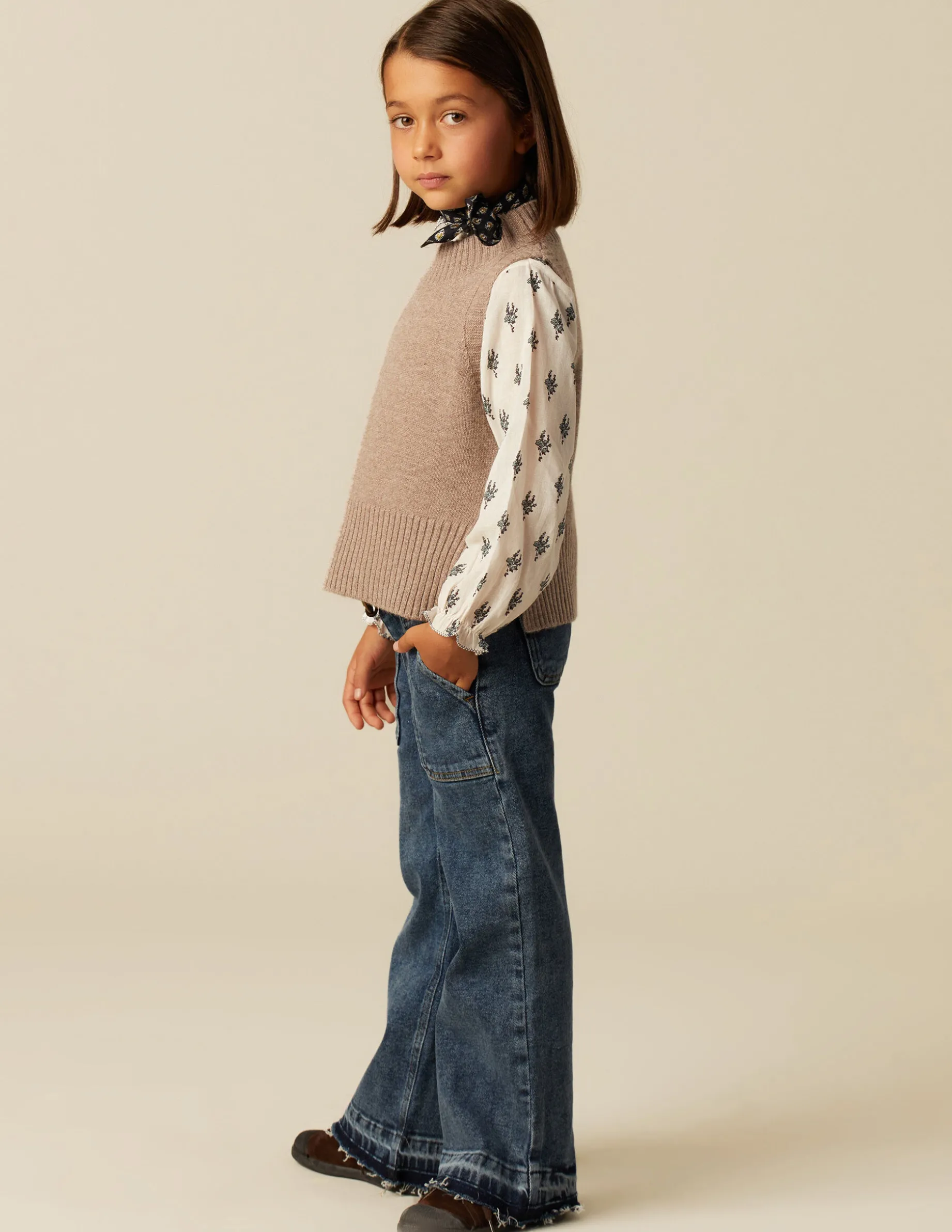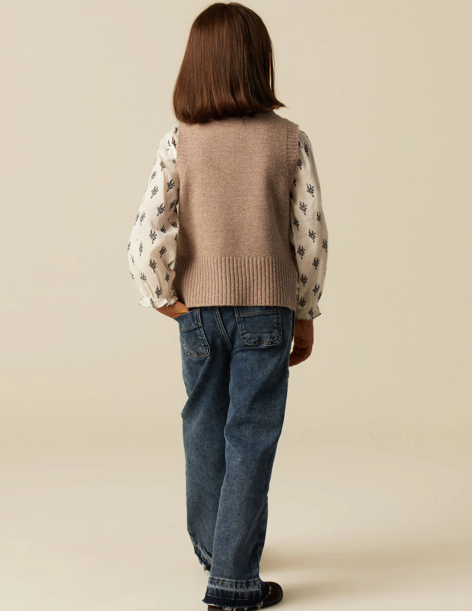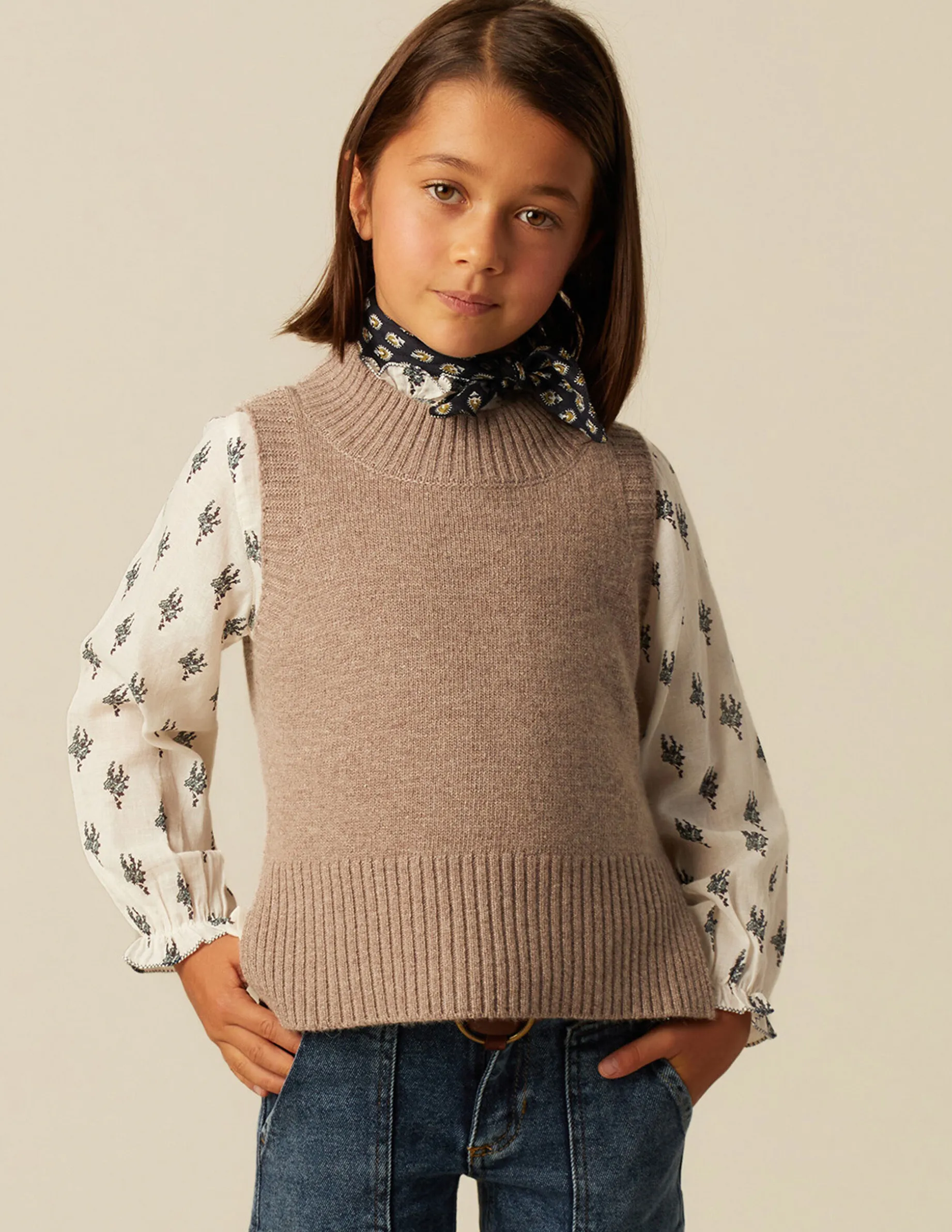 Chaleco cuello redondo marrón jaspeado. Acabados en canalé.