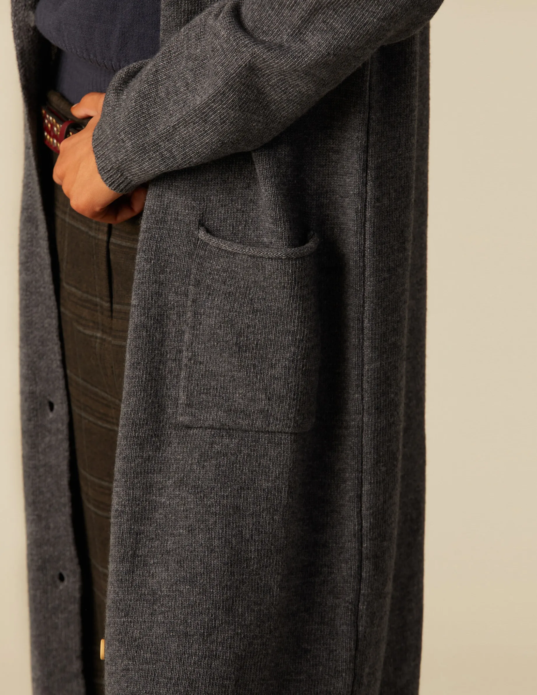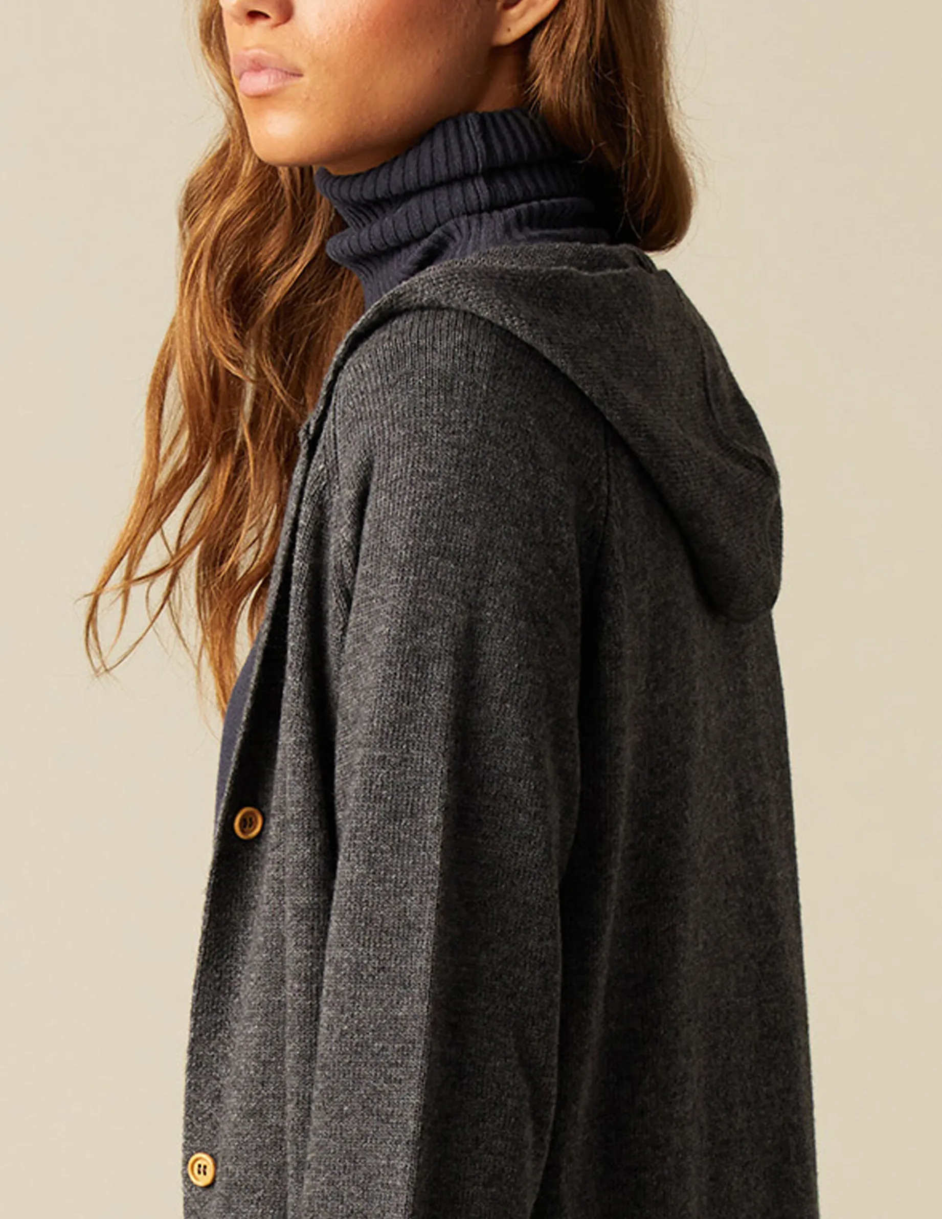 Chaqueta larga de manga larga. Detalle capucha y bolsillos delanteros.