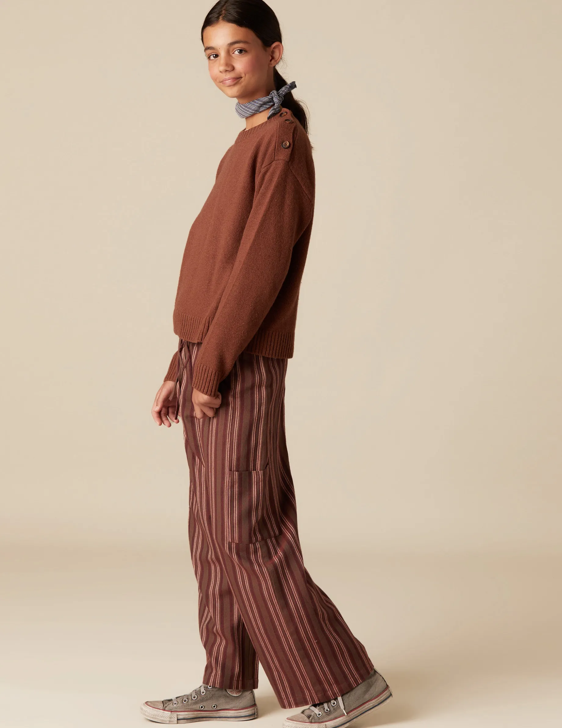 Jersey con acabados en canalé color marrón. Detalle de botones en hombro.