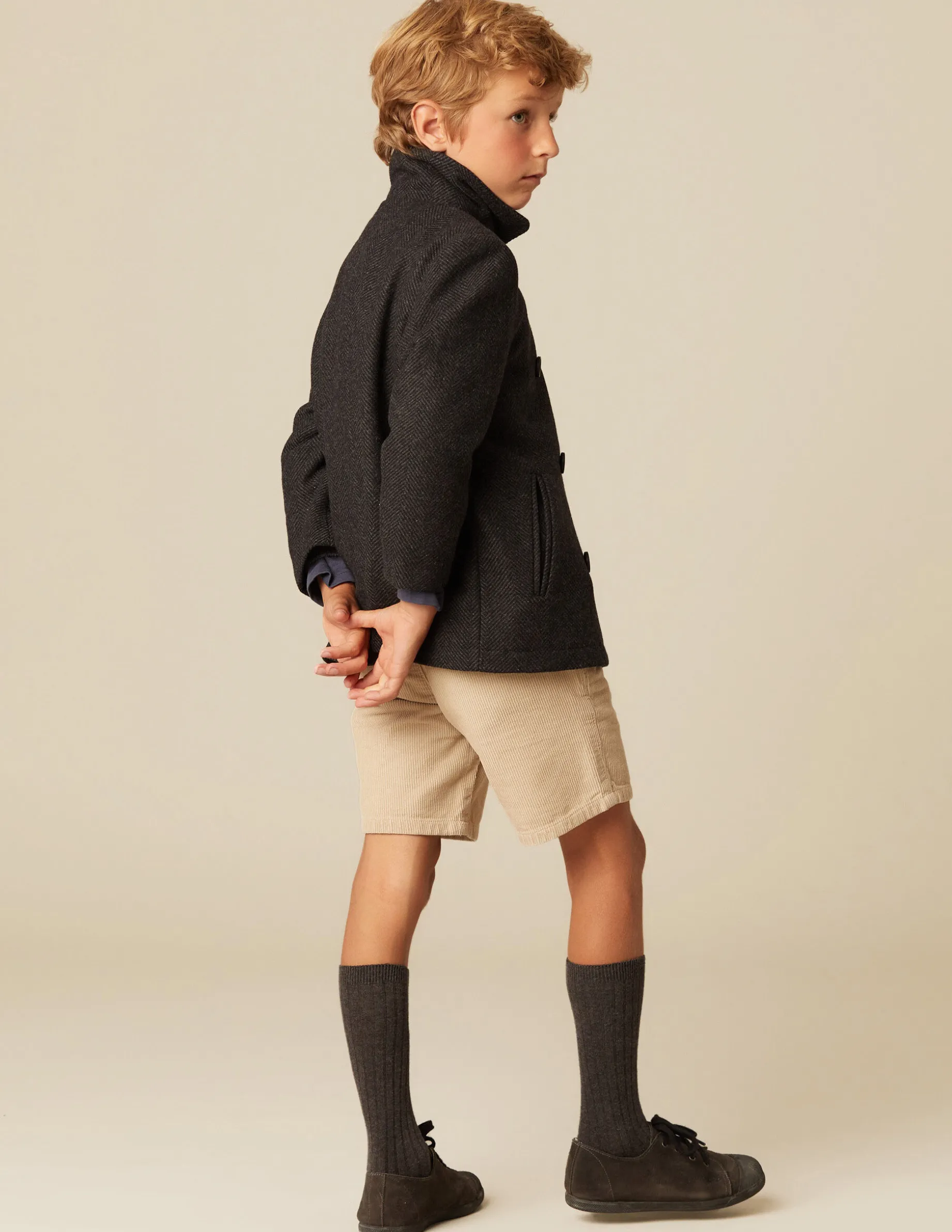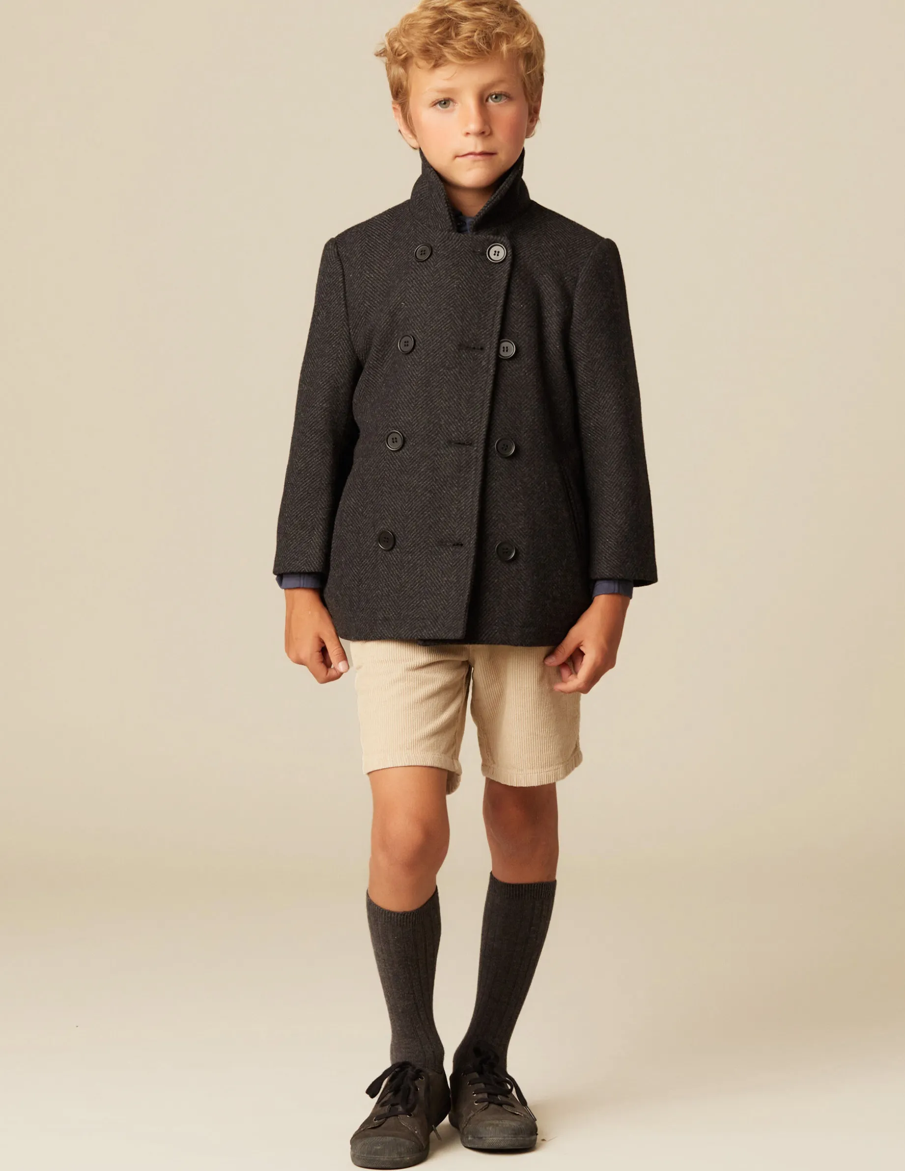 Abrigo cruzado en tejido espiga gris. Cierre con botonadura en delantero.