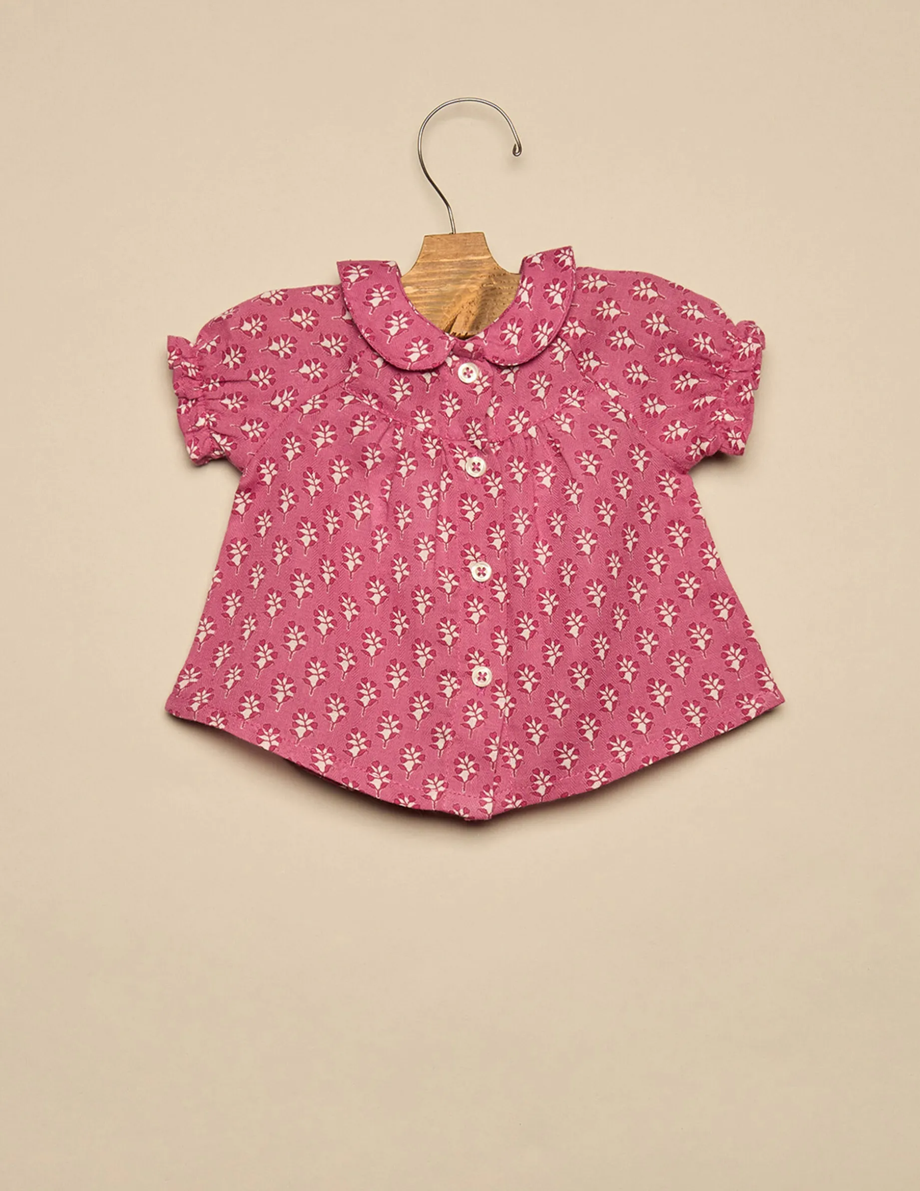 Camisa de bebé, en estampado de la colección, disponible en dos colores, con base de algodón. Patrón cuello lunitas y manga corta farol.