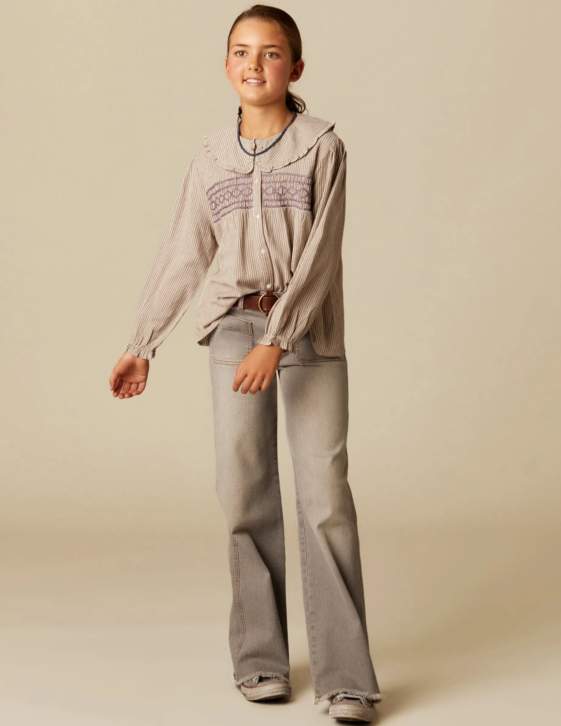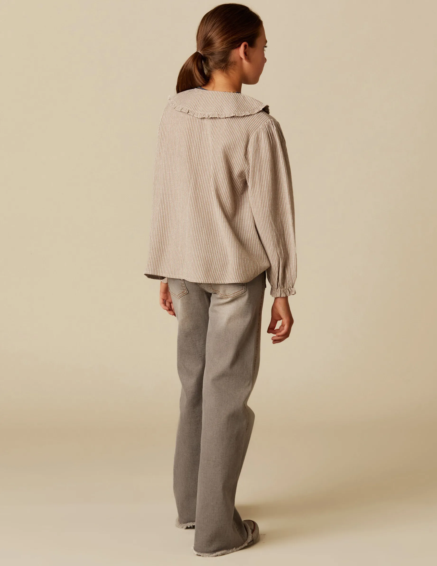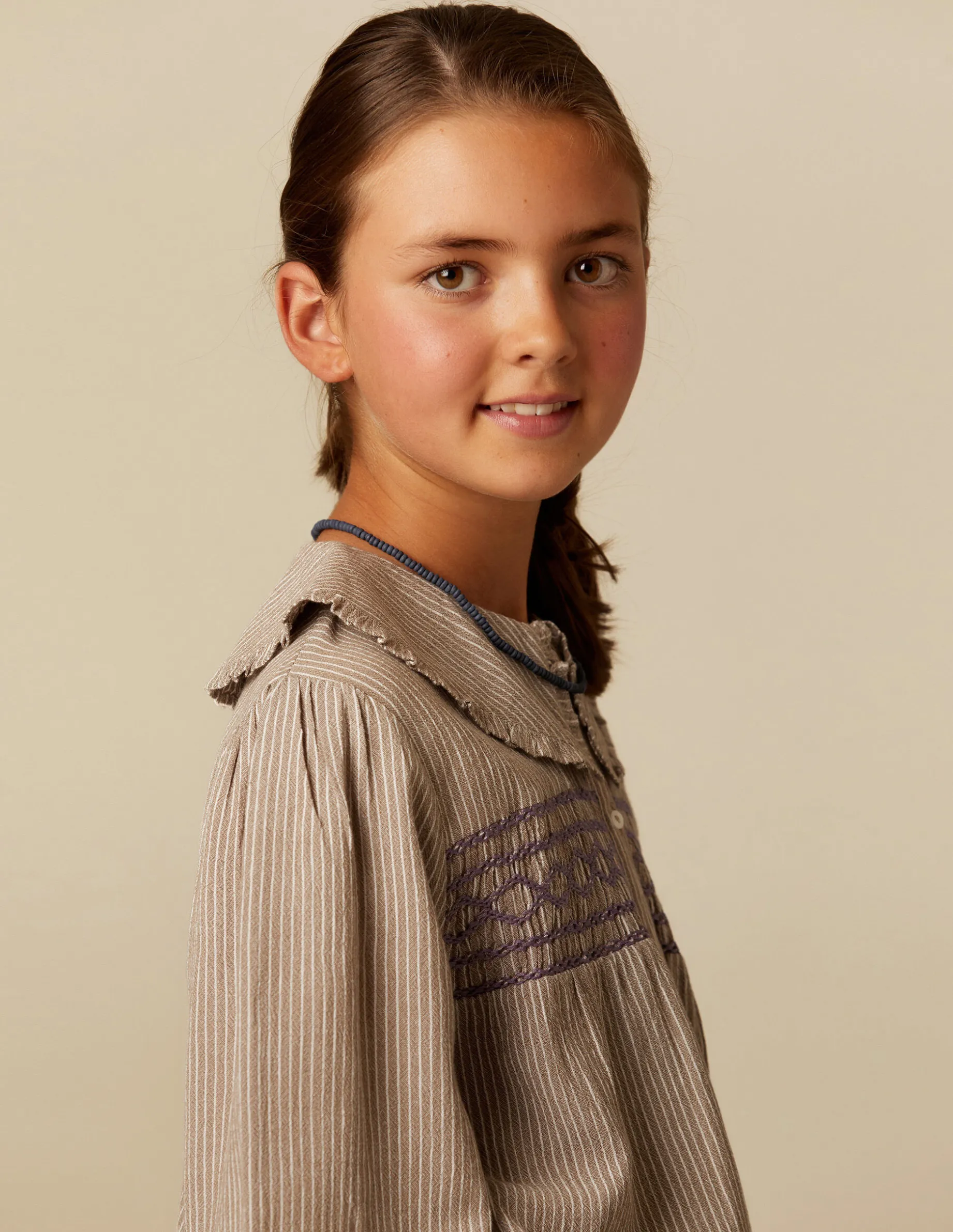 Camisa de teen en tejido de rayas de algodón. Patrón con cuello grande, manga larga y cierre delantero con botones. Detalle de nidos en la zona del peco.