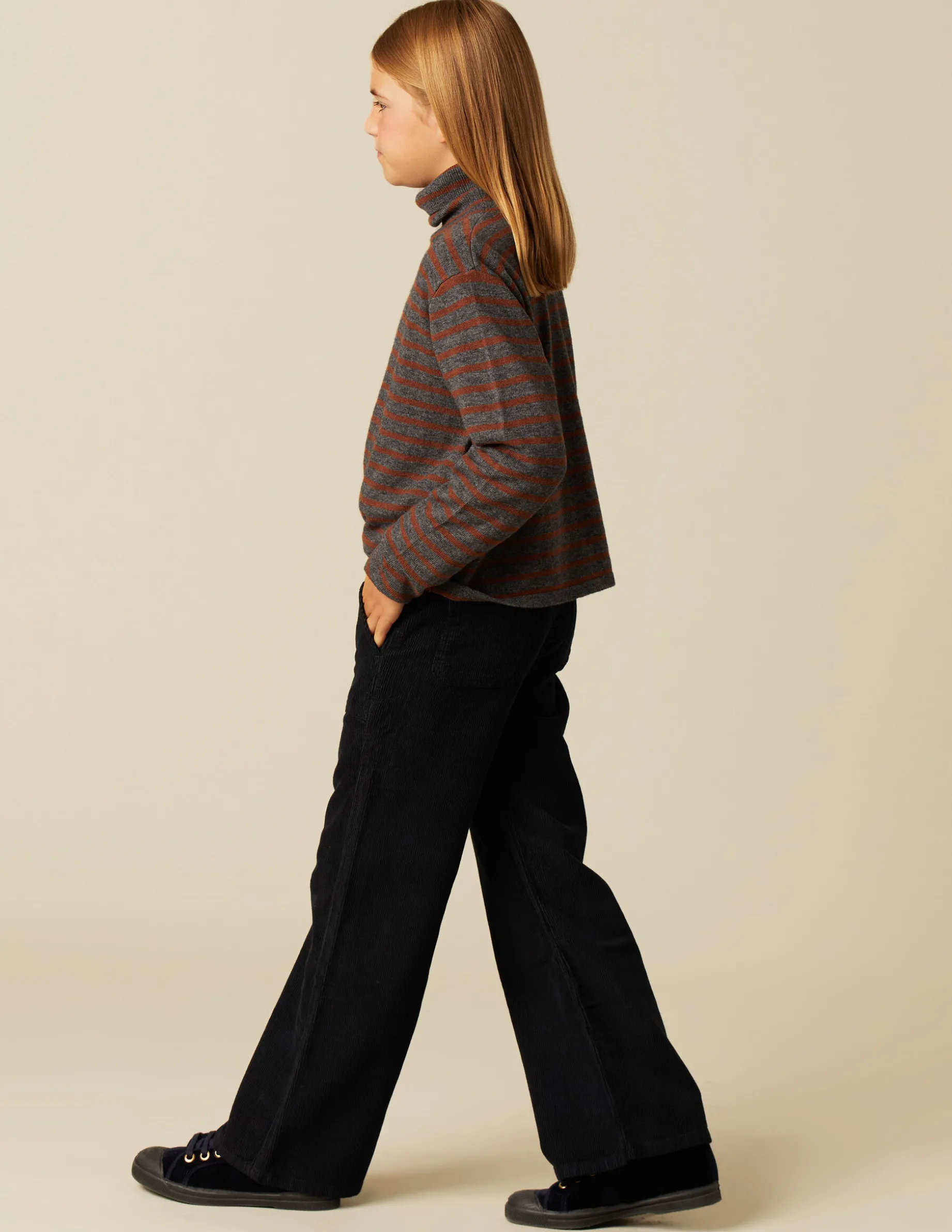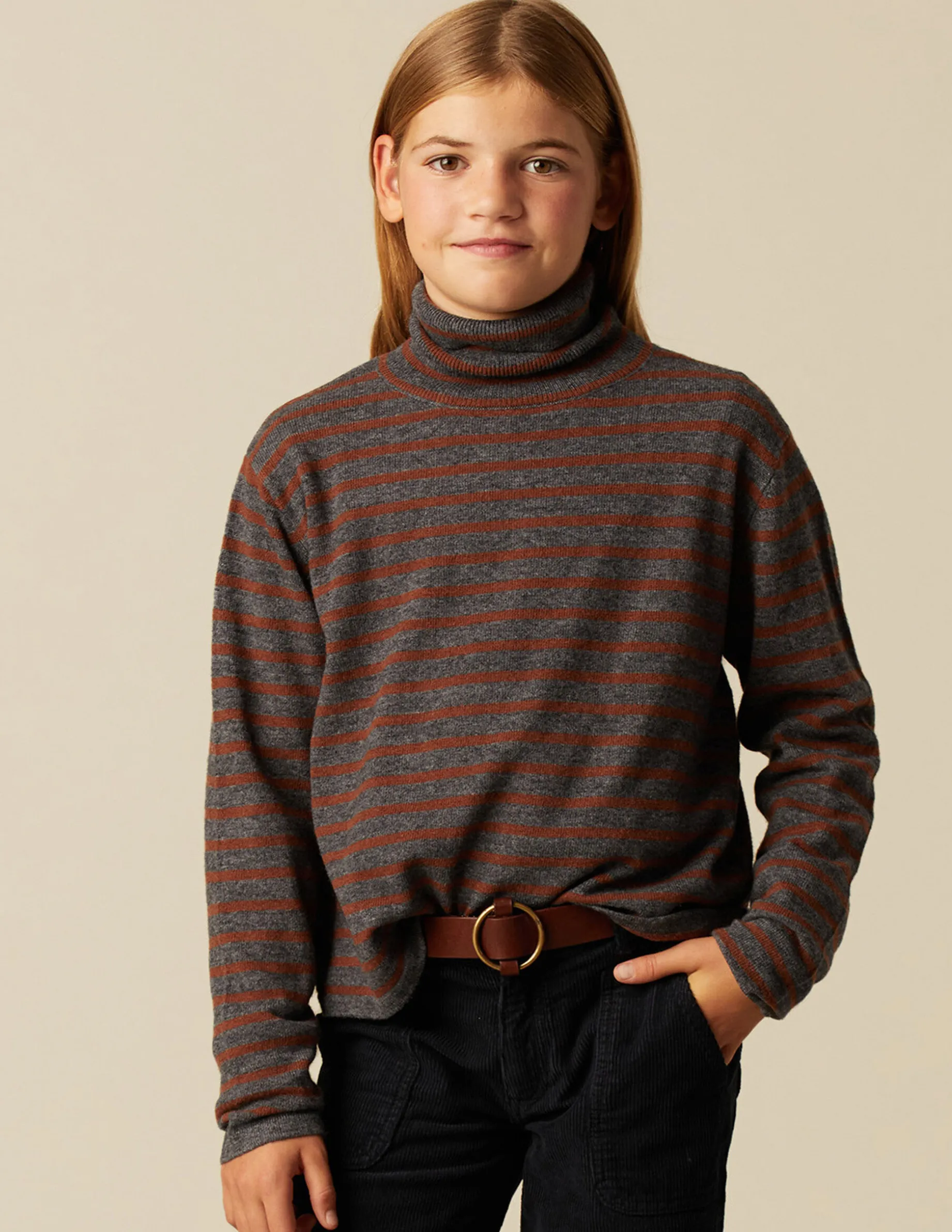 Jersey en punto de rayas en colores marrón y marengo. Patrón de cuello vuelto y manga larga.