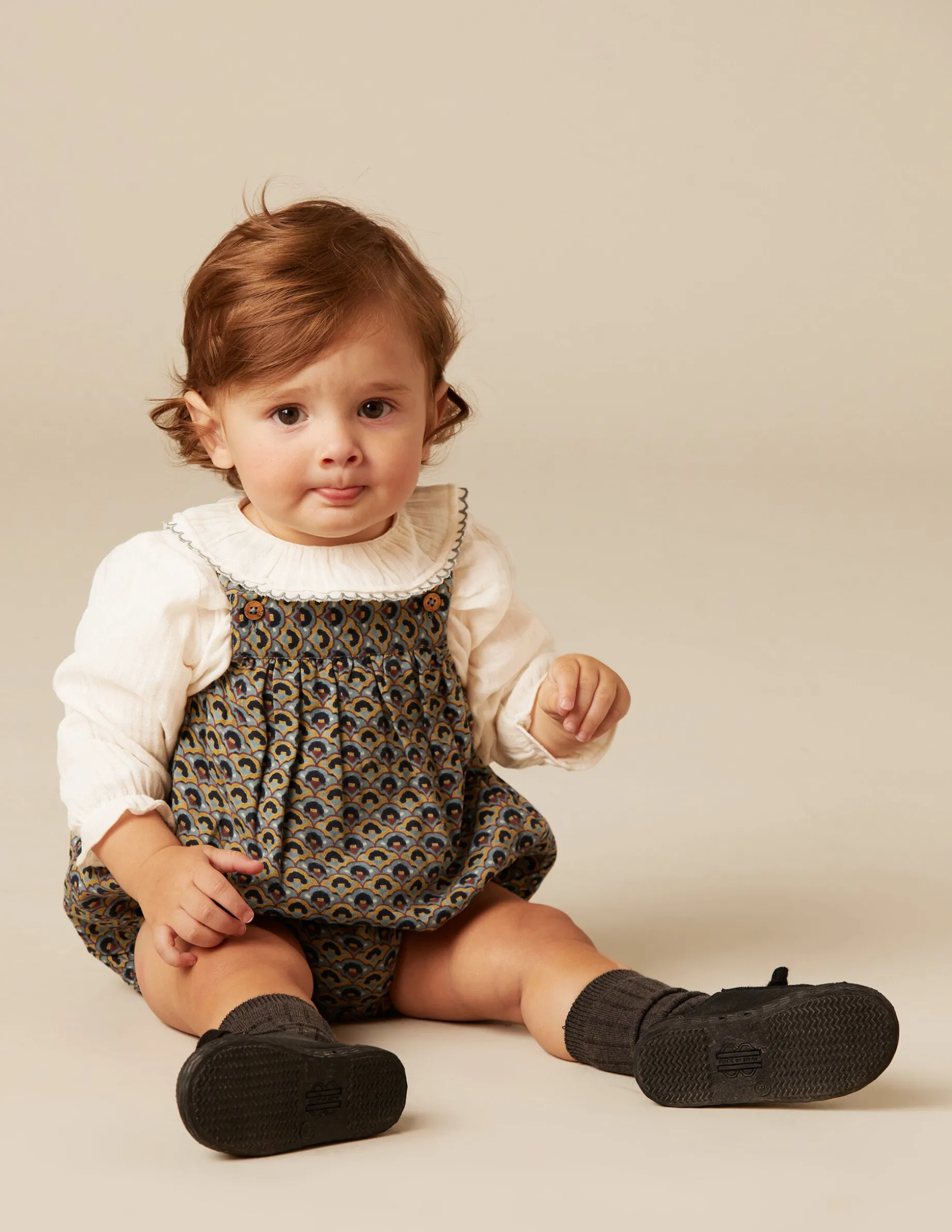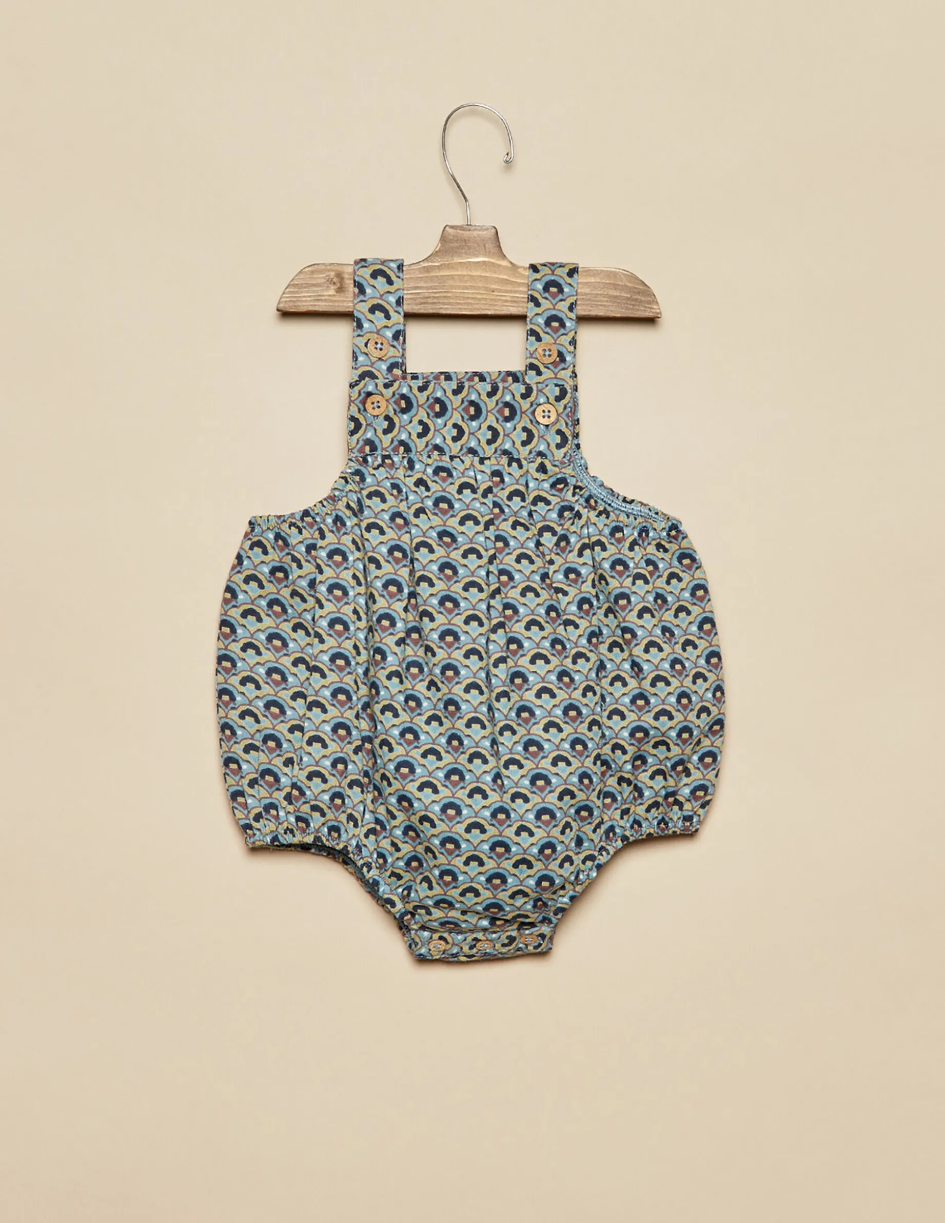 Ranita de bebé, en print de la colección. Patrón con tirantes ajustables y botón en la entrepierna.