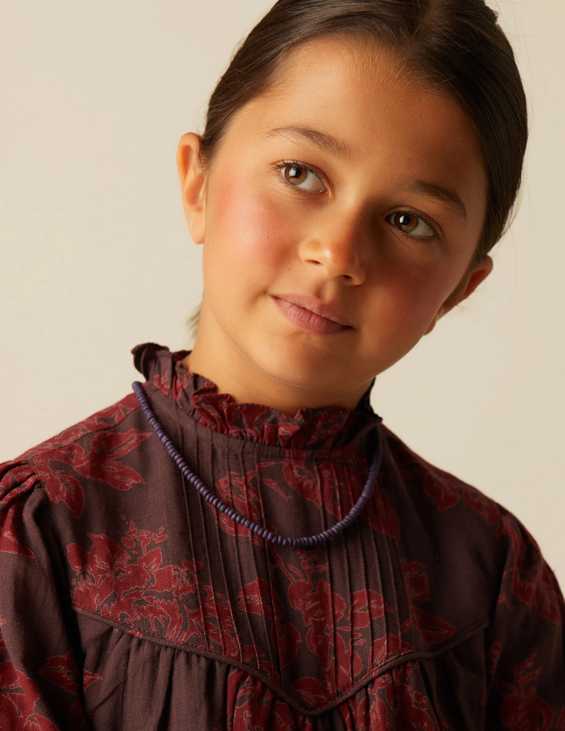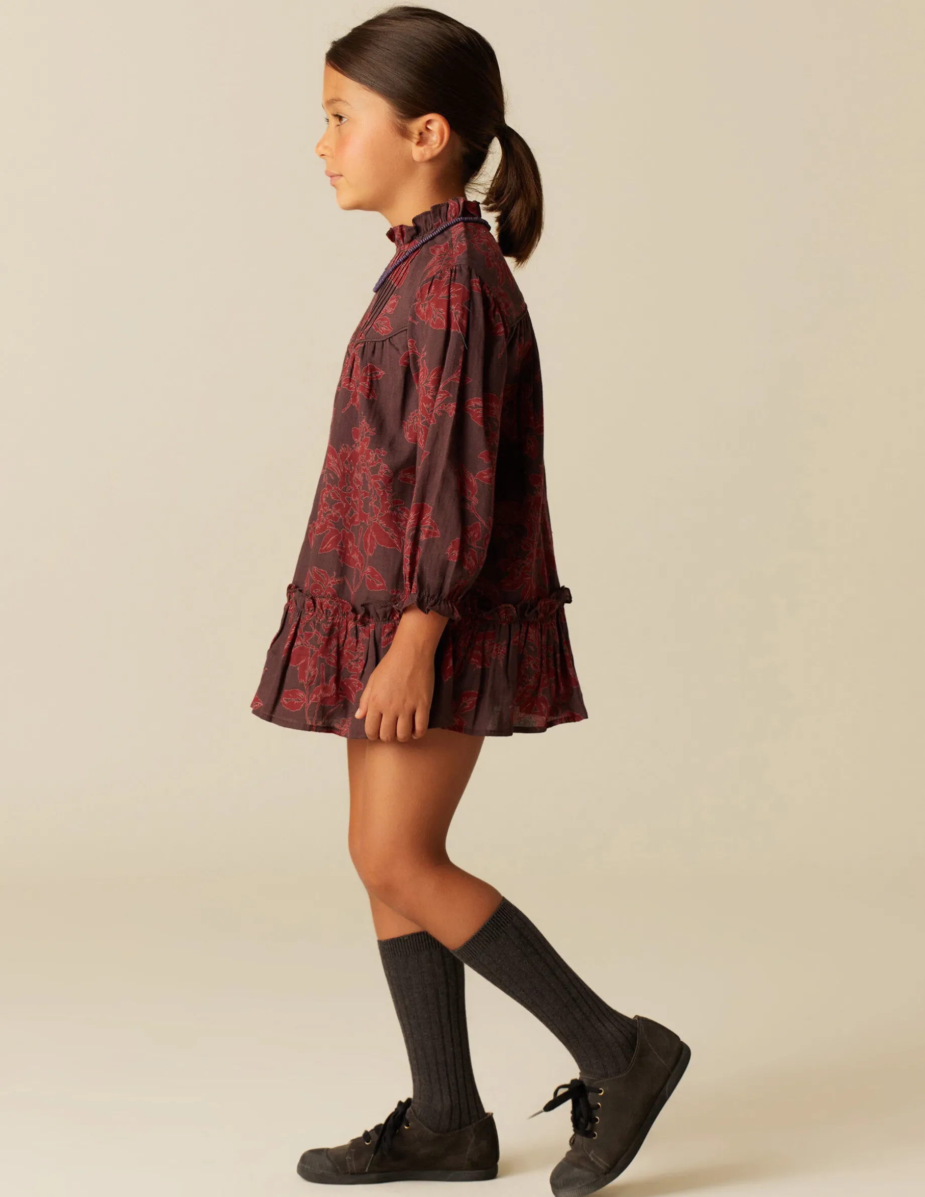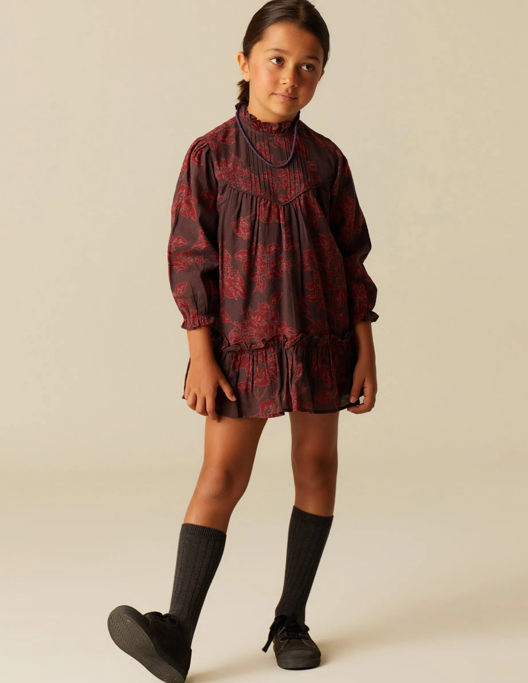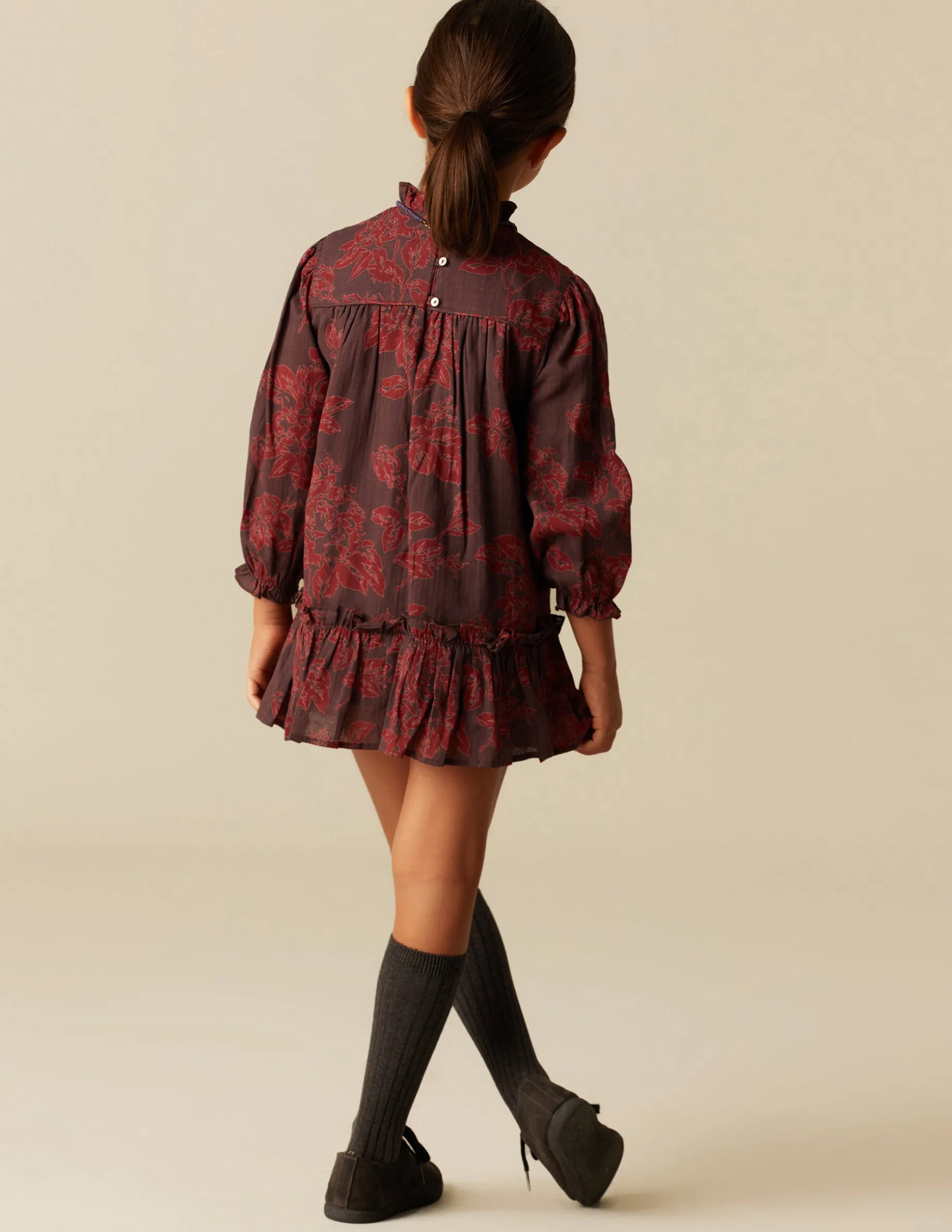 Vestido corto de niña, en estampado de la colección. Patrón con manga larga y cierre por la espalda. Disponible en dos colores.