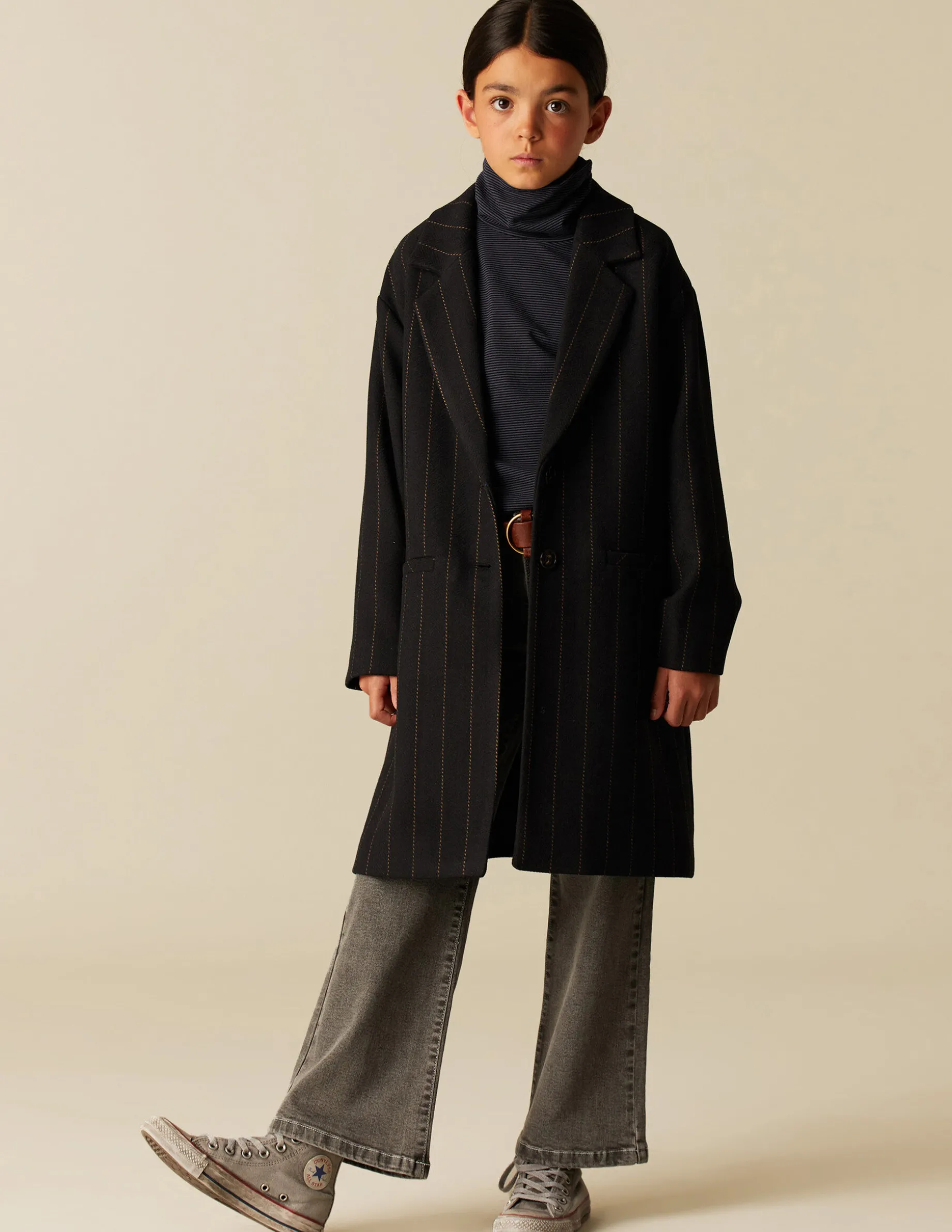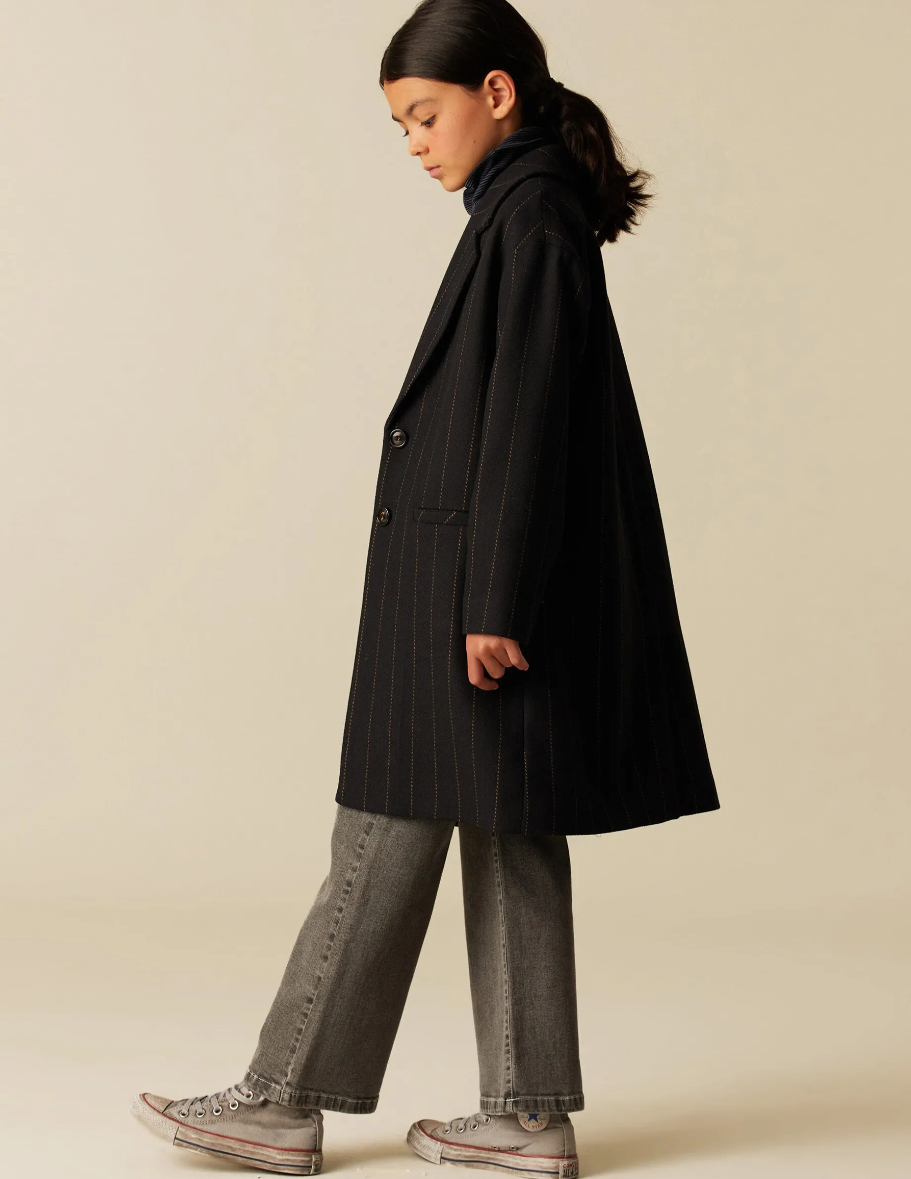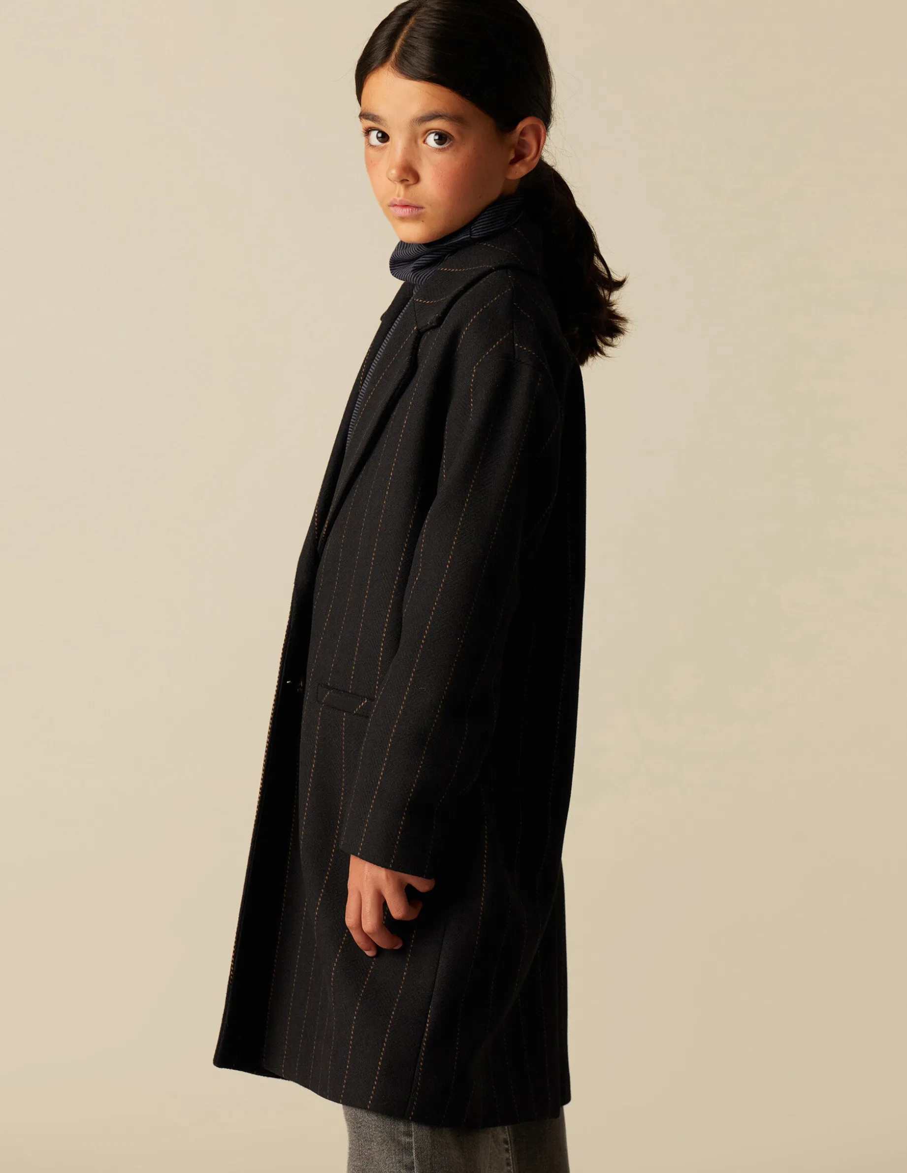 Abrigo de teen, en tejido de lana azul marino con rayas. Patrón con cuello solapa y manga ranglan.