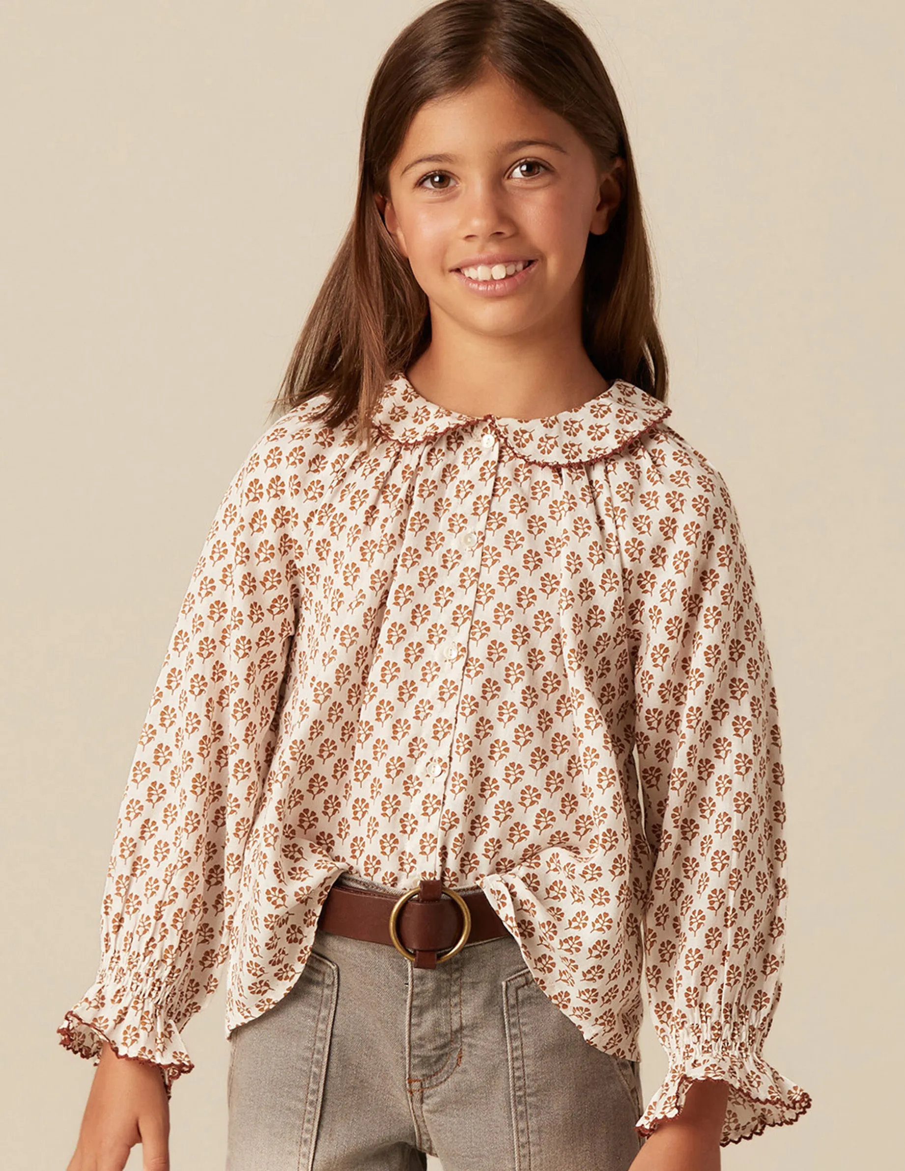 Camisa de niña, en print de la colección. Patrón con cuello lunas, con detalle de stitching a contraste. Manga larga rematada con volante. Cierre frontal.