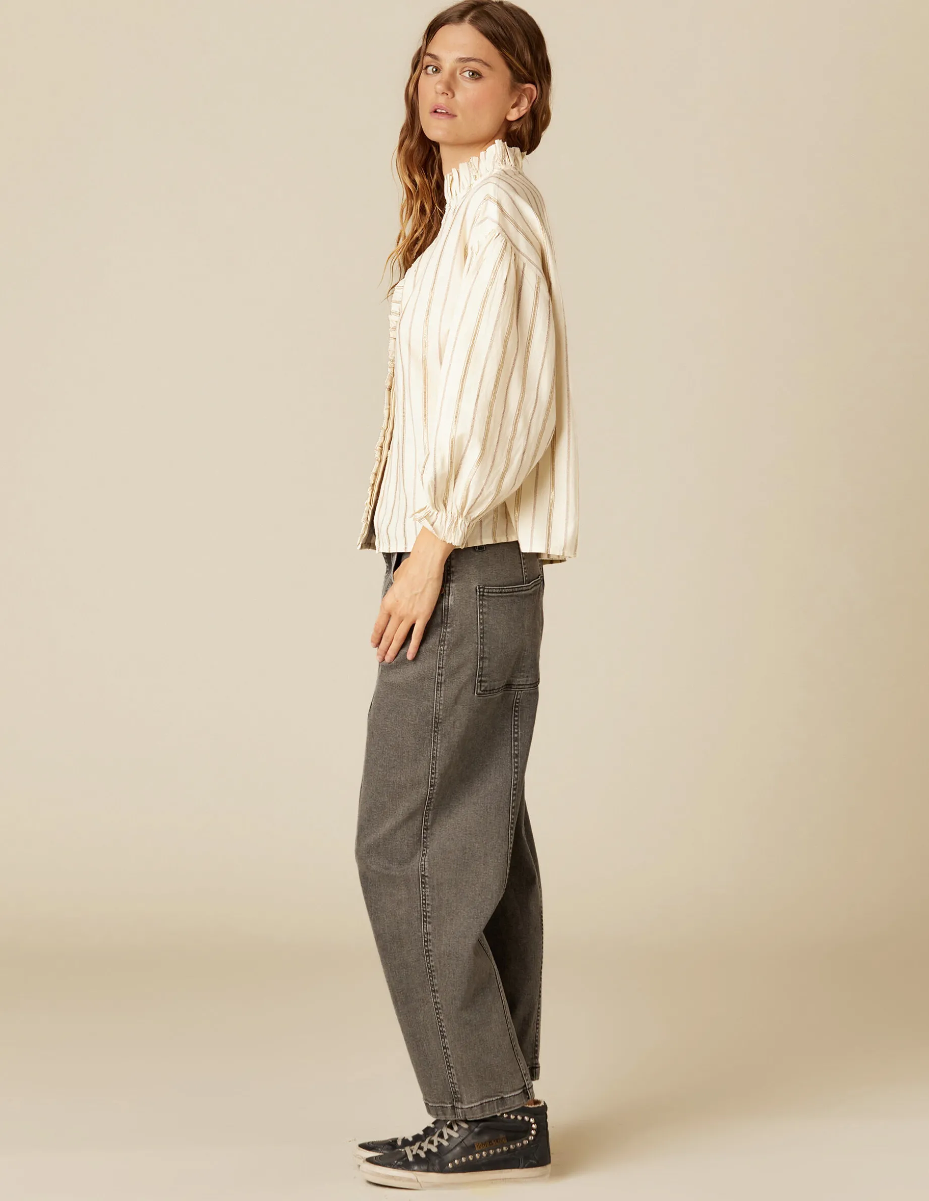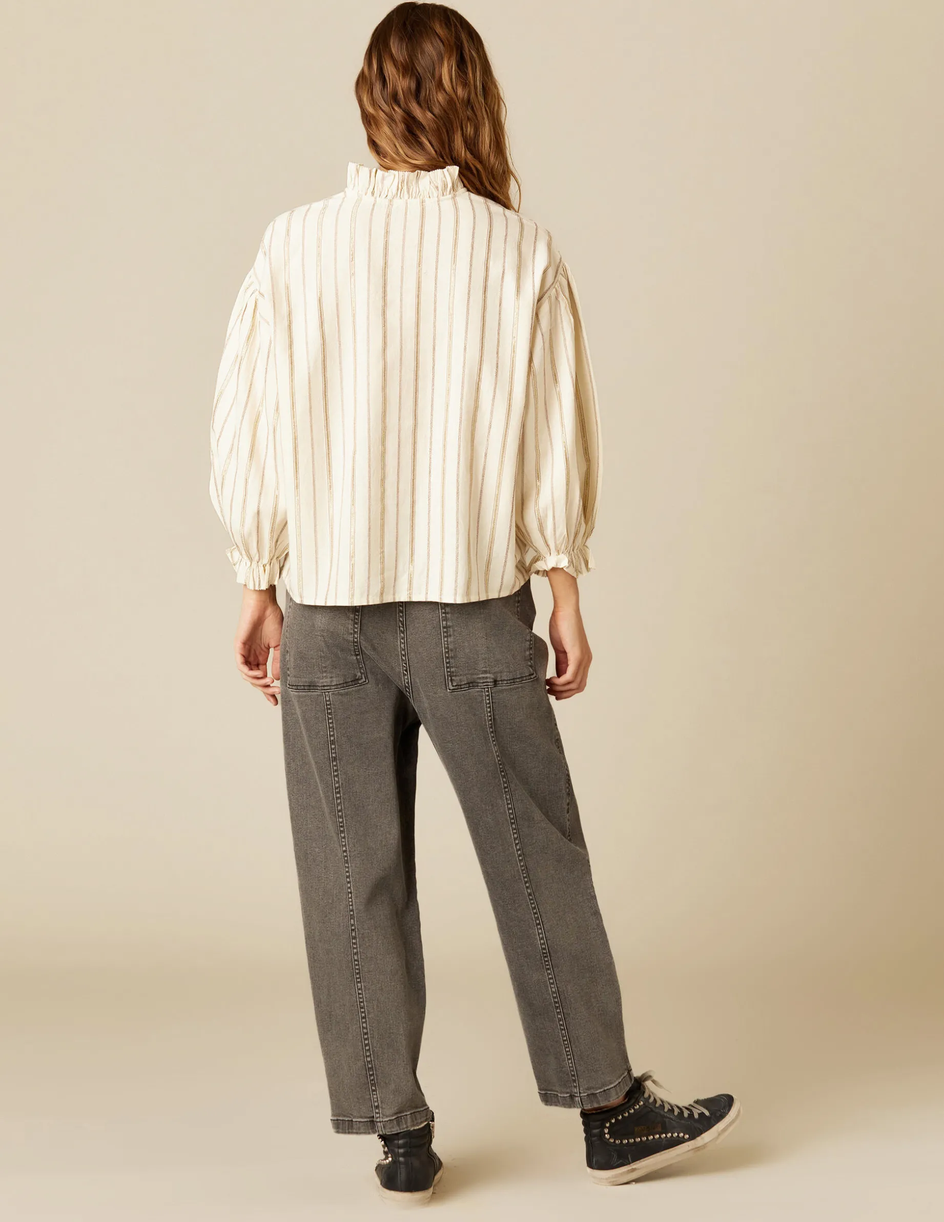 Camisa de chica, en color crudo con detalle de rayas en colorido de la colección y lurex. Patrón de manga larga, con cuello perkins rematado con un volante que pasa por toda la botonadura.