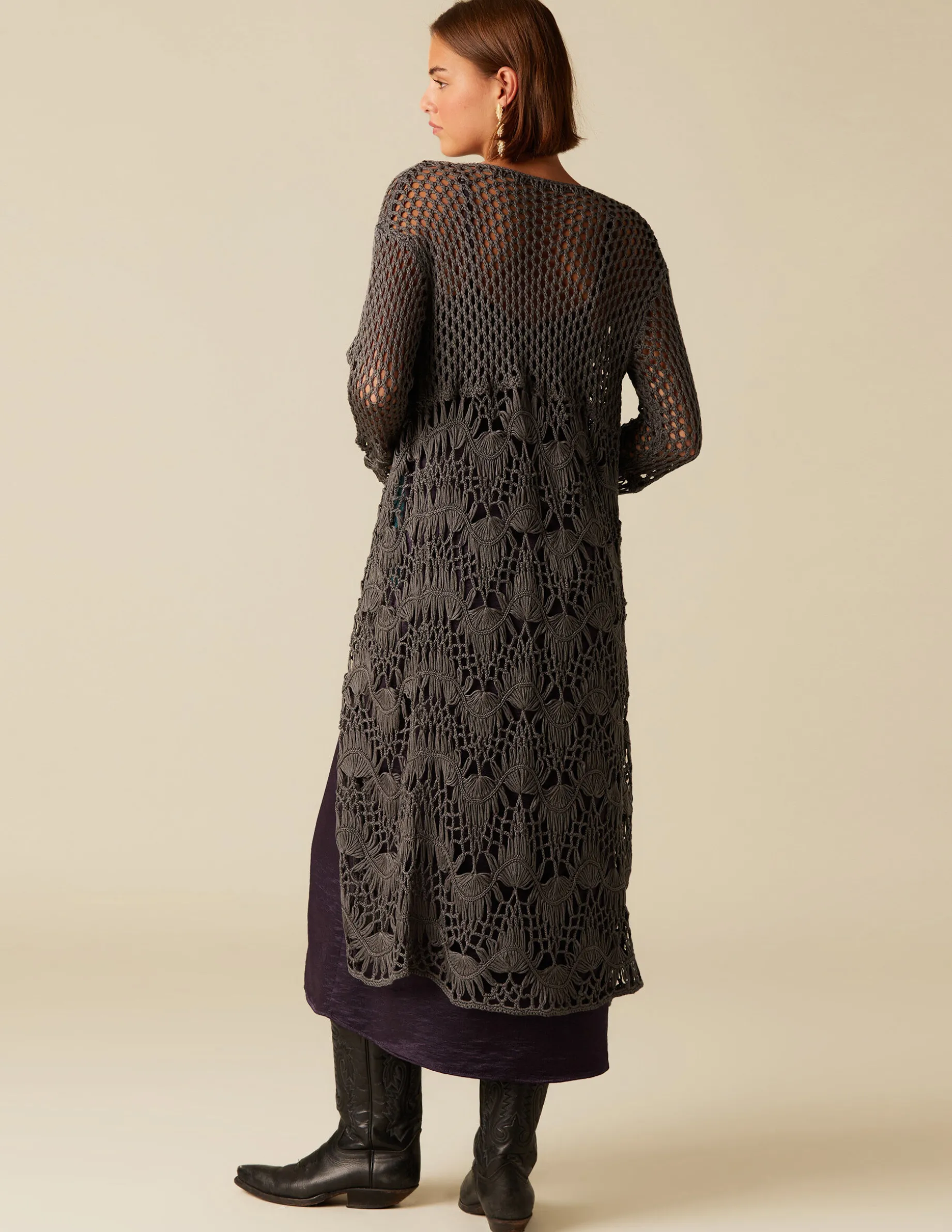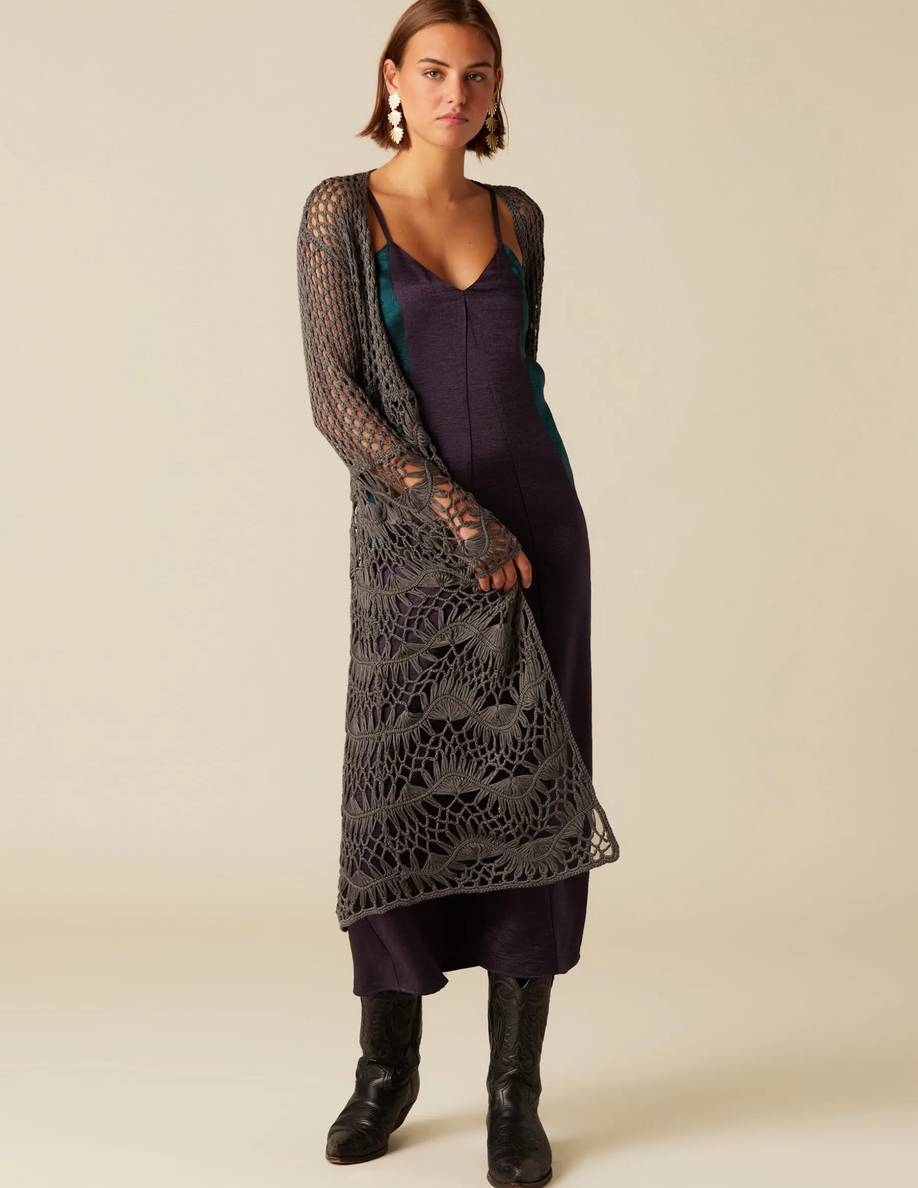 Chaqueta larga de punto con capucha. Cierre frontal con botones de madera y bolsillos delanteros.