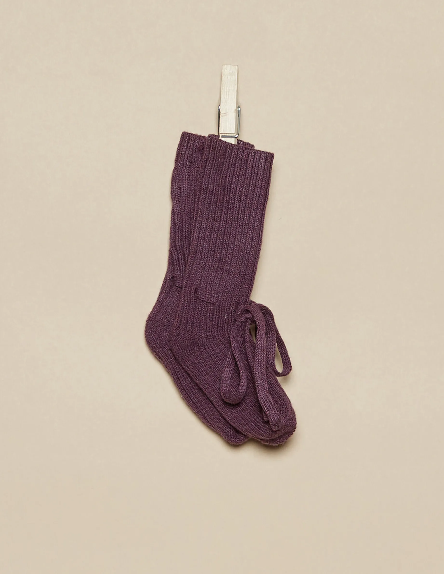 Patucos de bebé en punto, de color mora. Detalle de lazo.