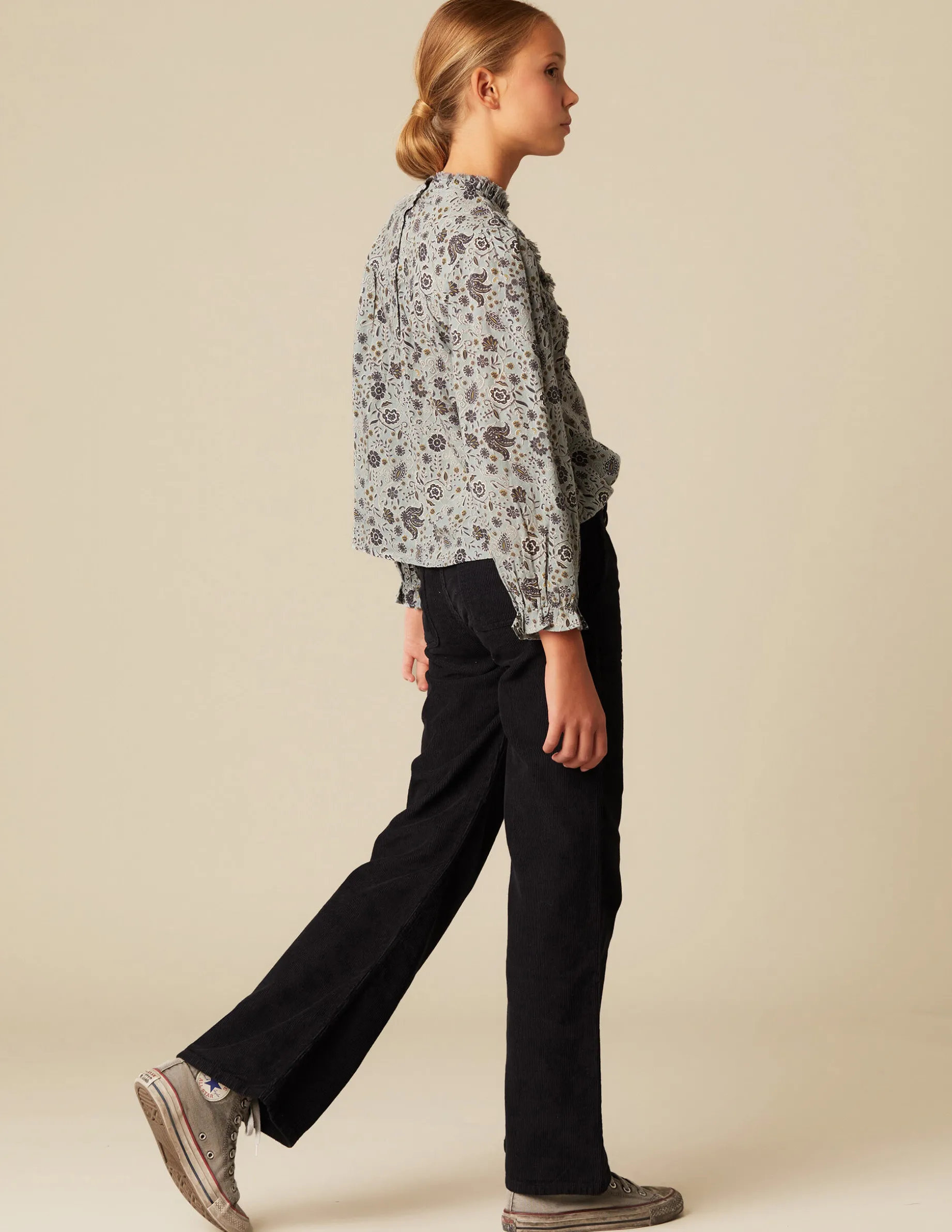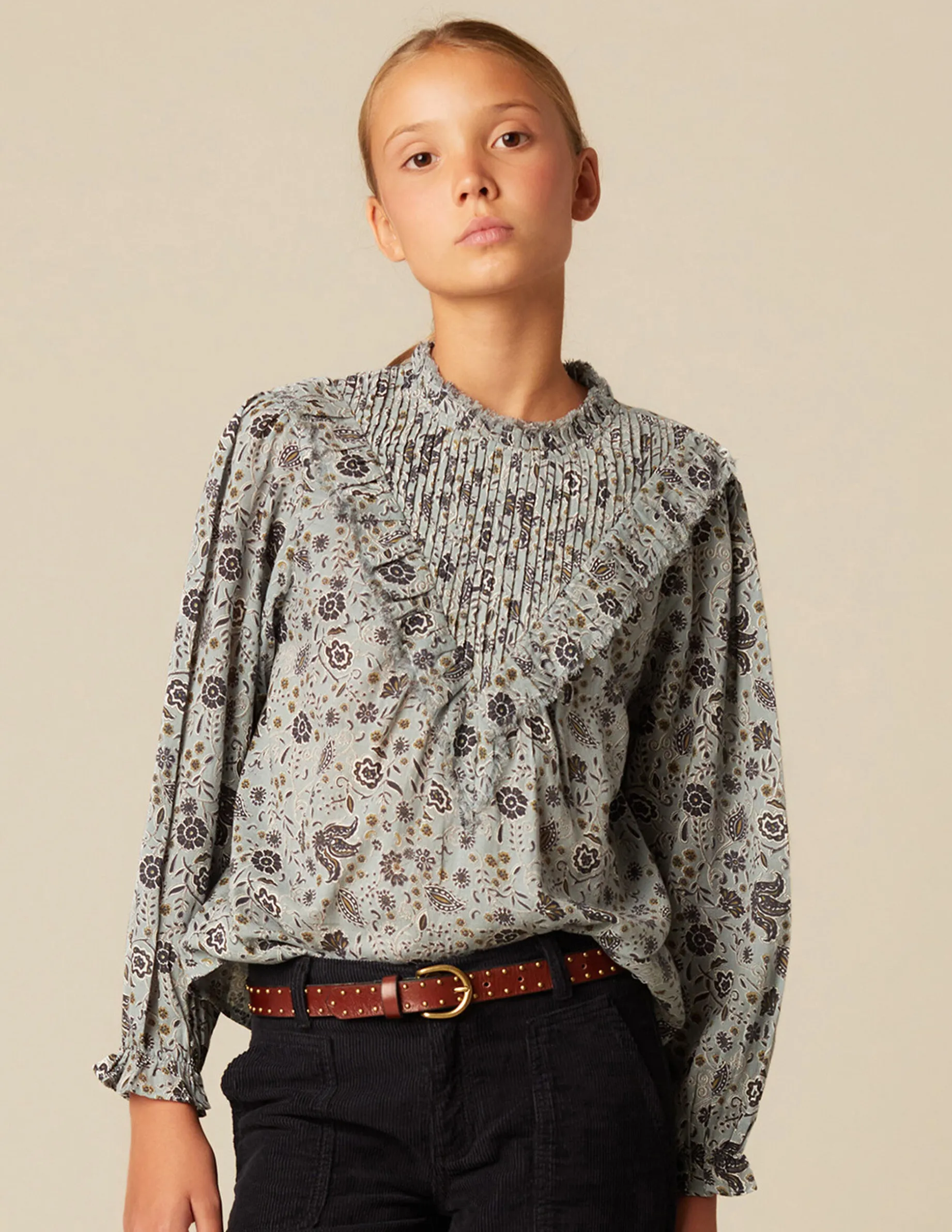 Camisa de tween, en estampado de la colección, en base de algodón. Patrón con cuello perkins, manga larga rematada en puño y detalle de jaretas en la zona del pecho.