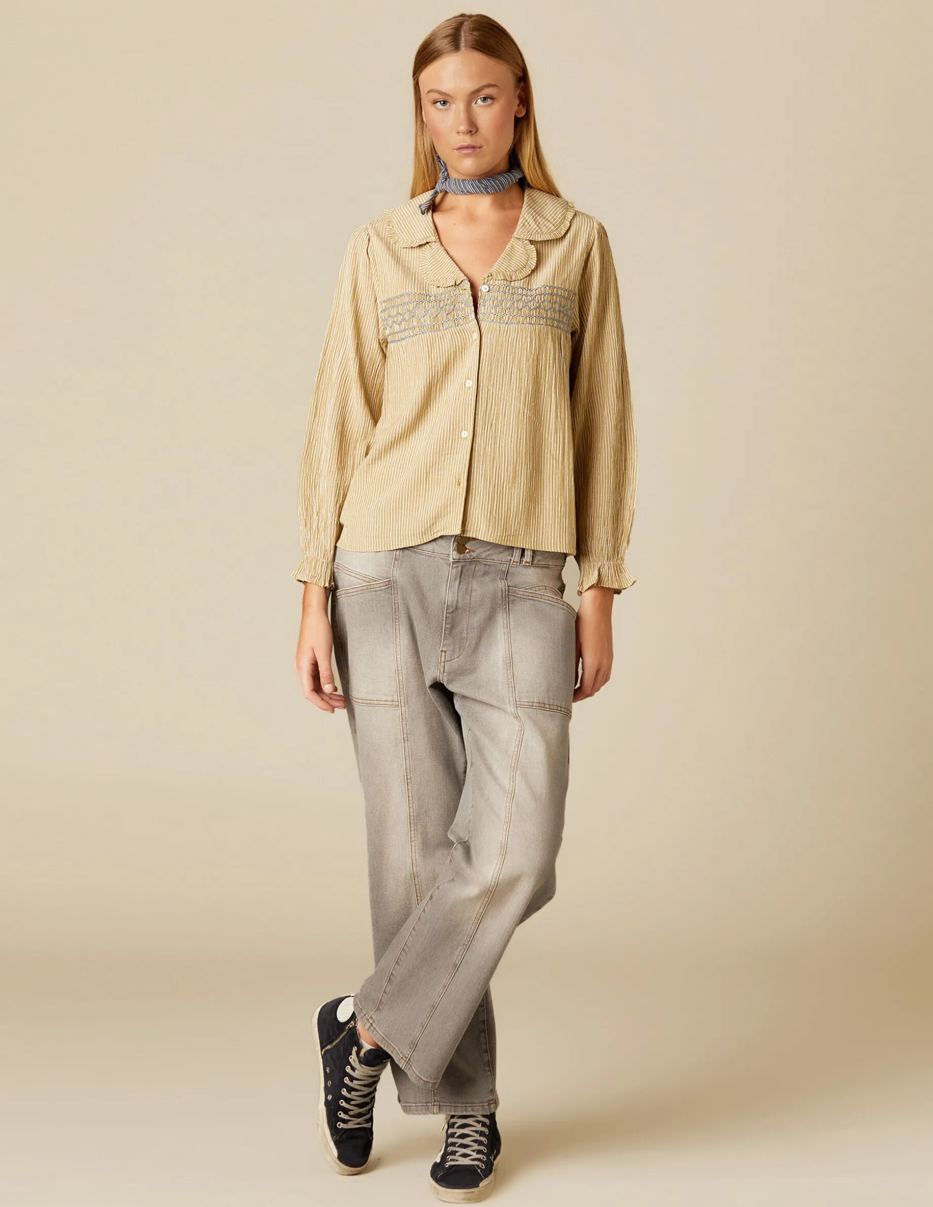 Pantalón largo vaquero lavado gris. Detalle de cortes y costuras en el delantero. Cierre con cremallera y botón.