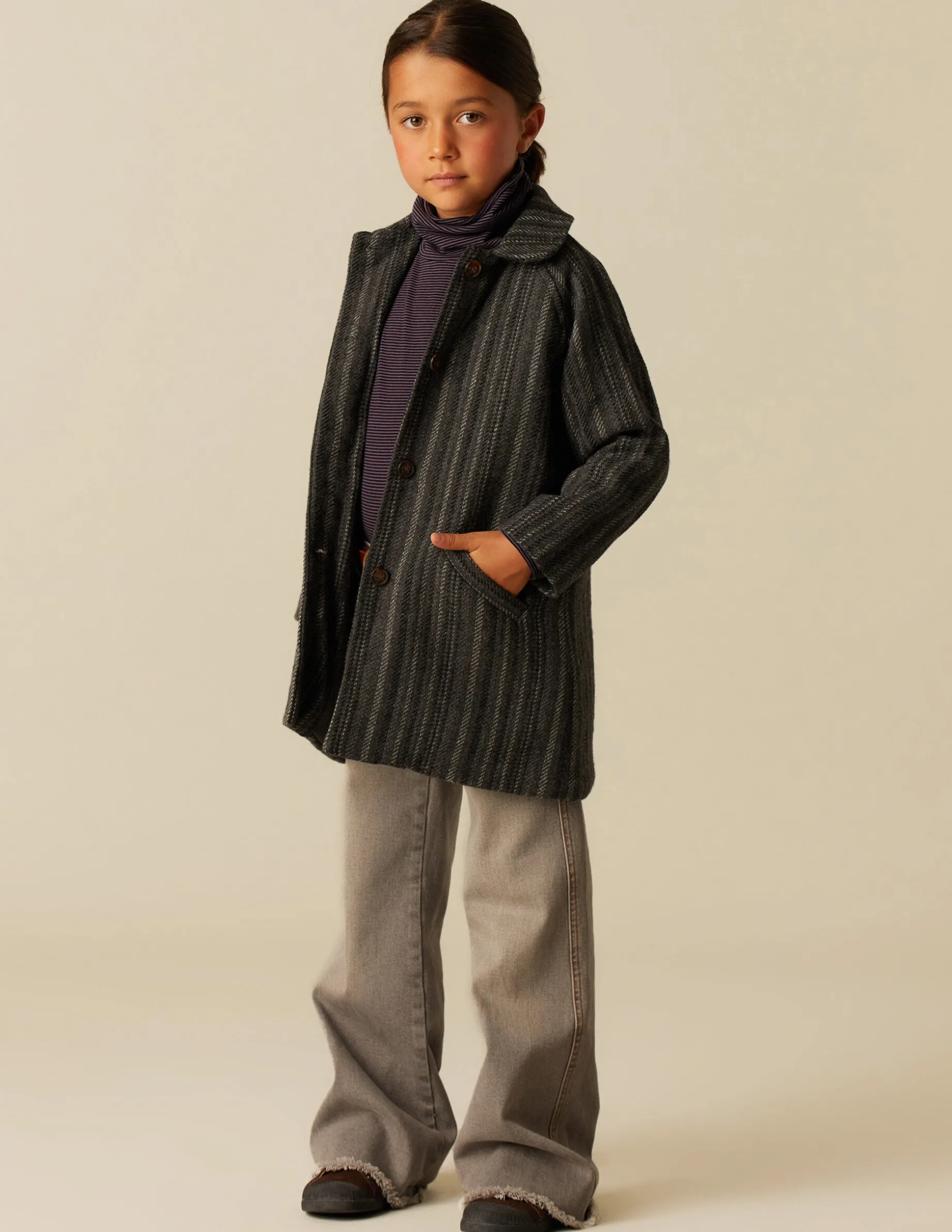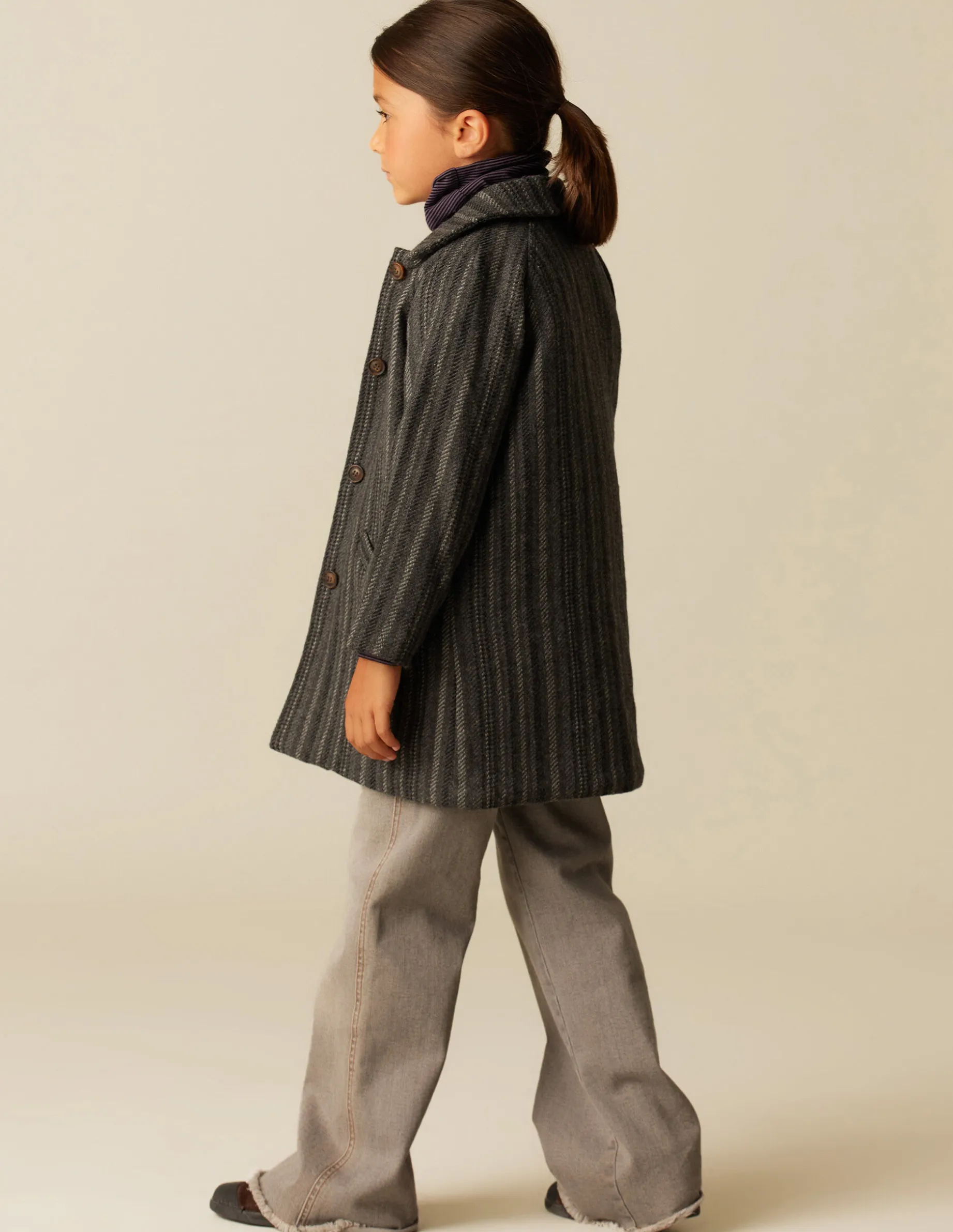Abrigo cuello redondo en tejido de rayas grises. Cierre con doble botonadura en delantero.