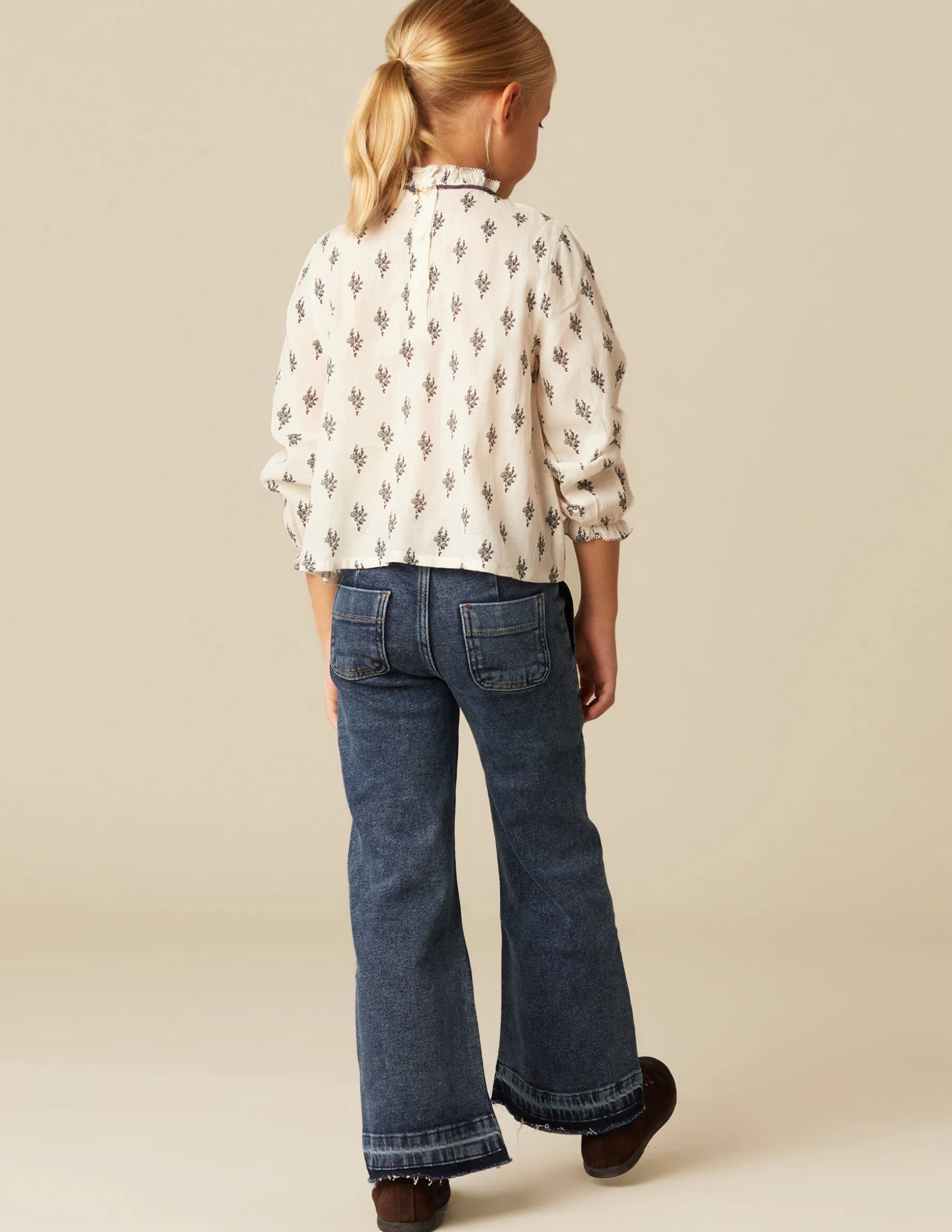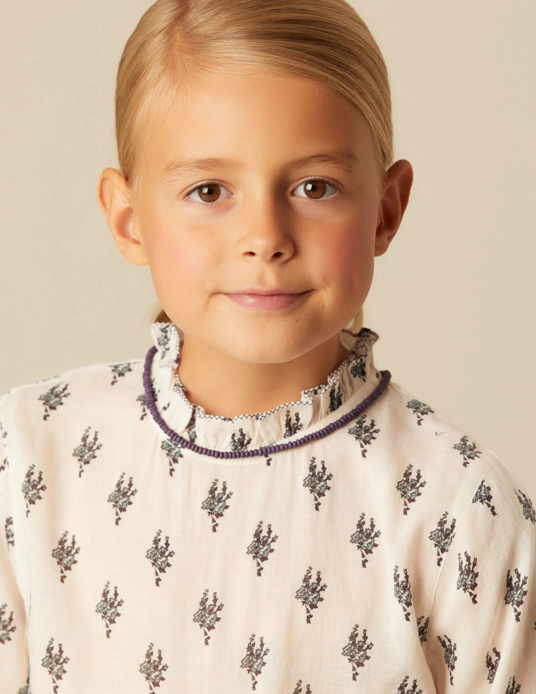 Camisa de niña, en estampado de la colección. Patrón con cuello perkins, manga larga rematada en volante y cierre por detrás con botones. Detalle de stitching a contraste en manga y cuello.