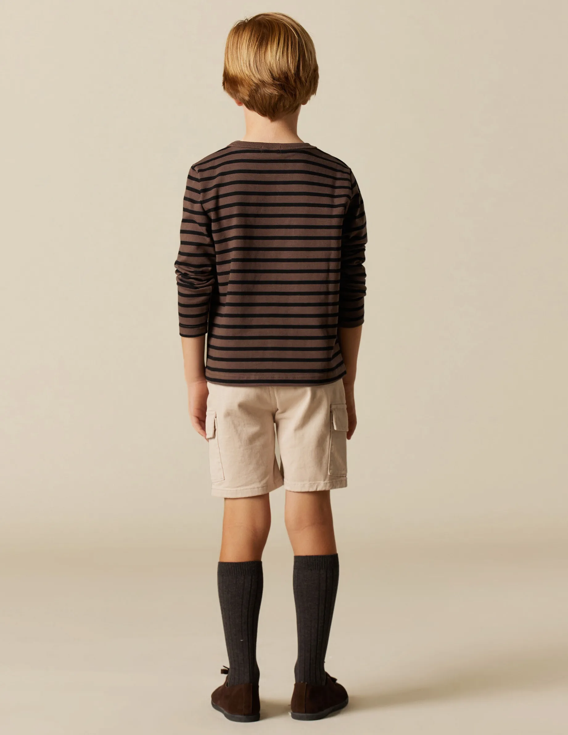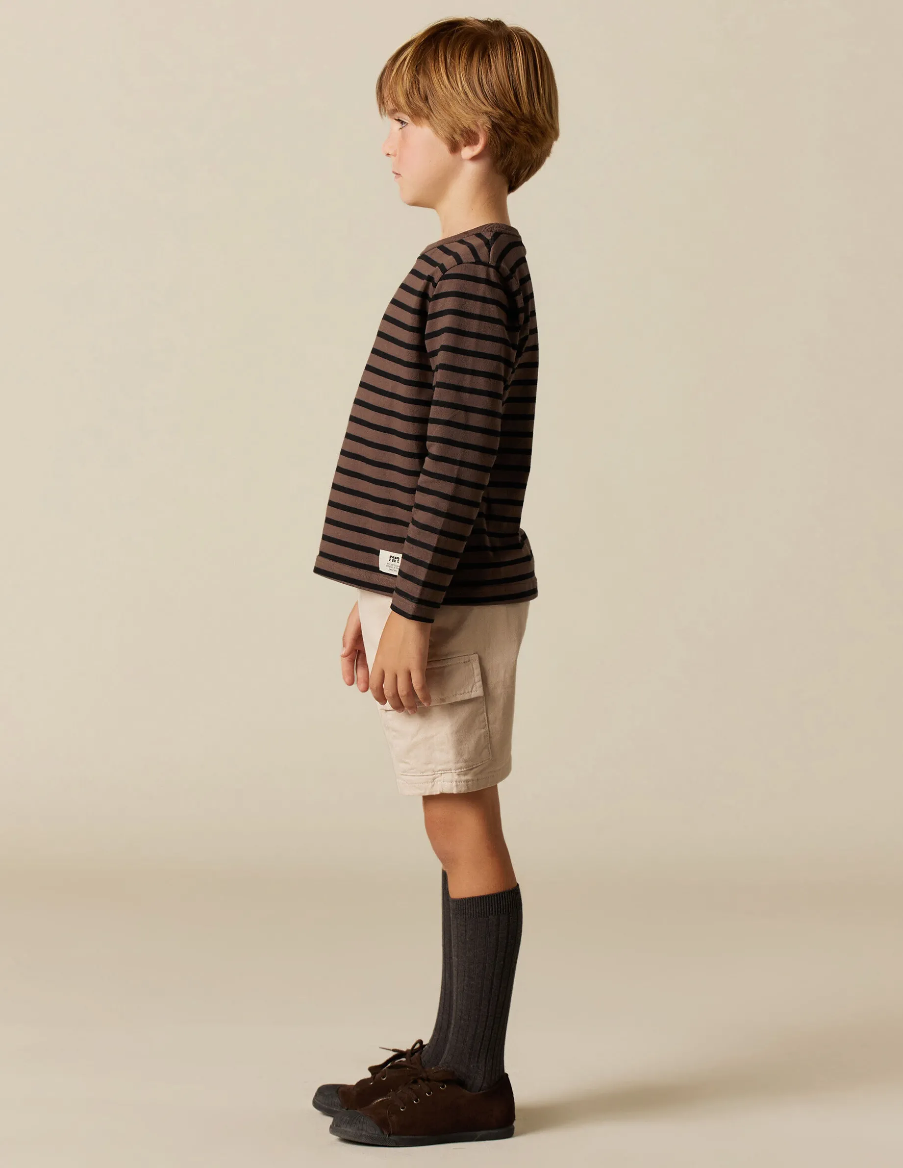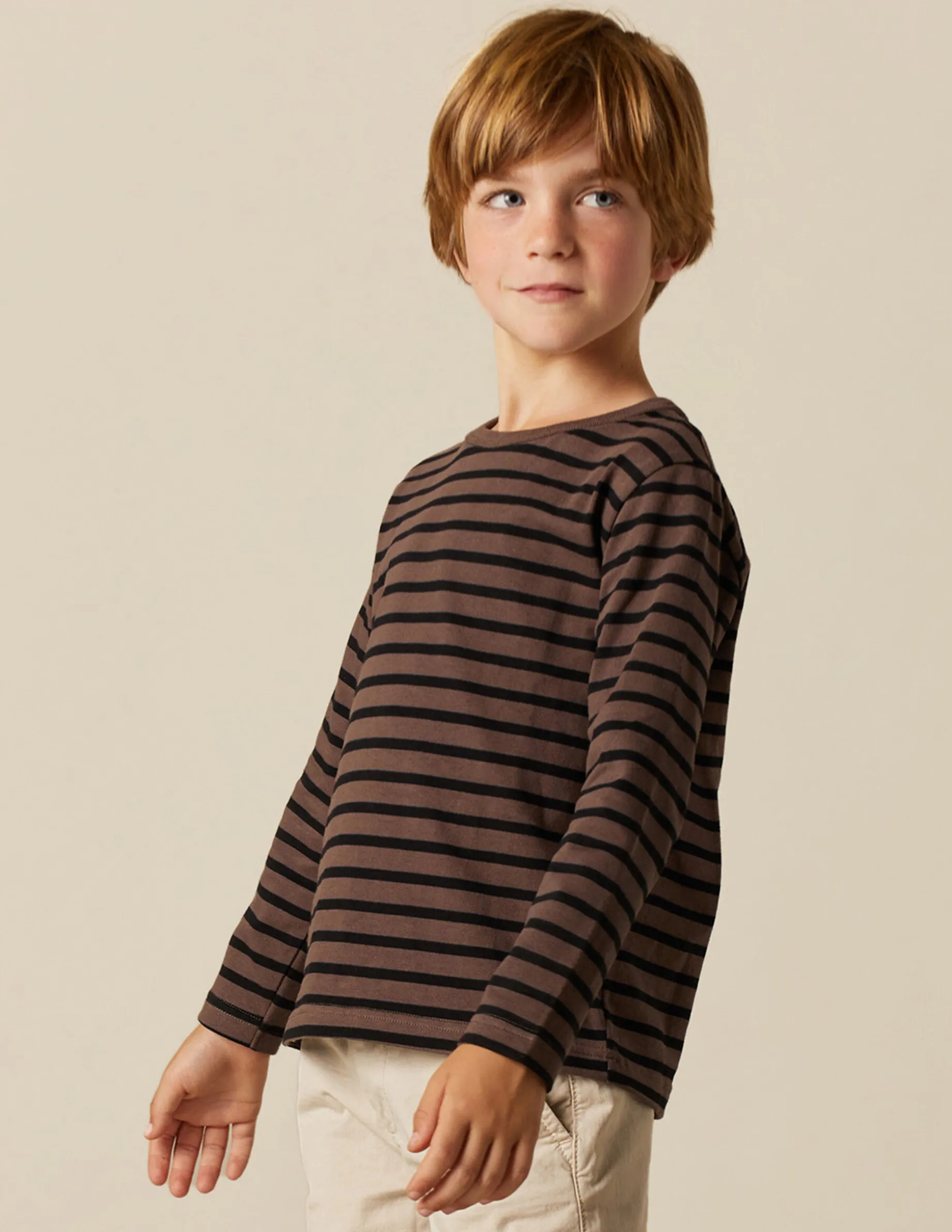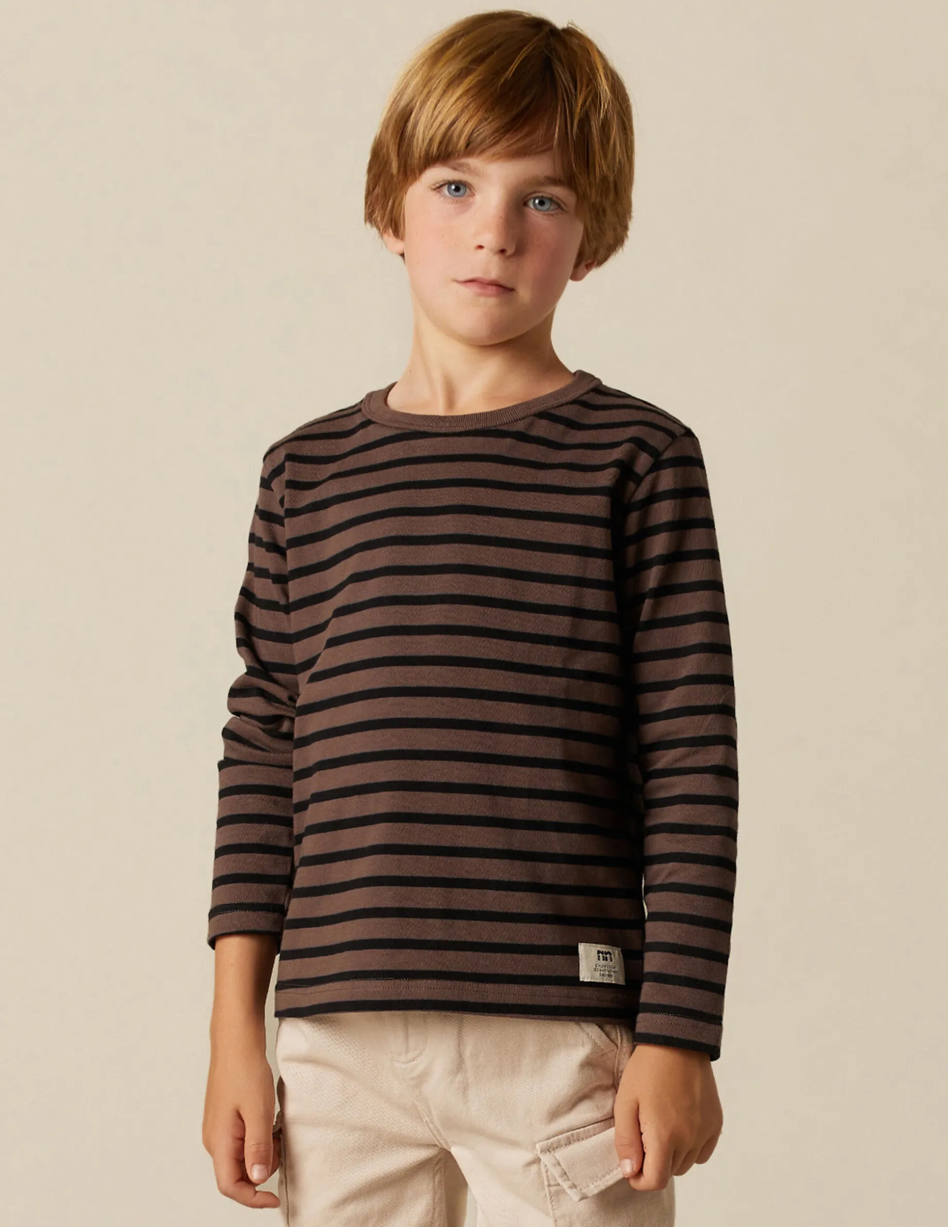 Camiseta de niño, en color de la colección con rayas grandes antracita. Patrón con cuello redondo y manga larga. Detalle de etiqueta en el bajo lateral. Parte de los beneficios recibidos se destinan a la Fundación a la Par, con la que Nícoli colabora desde hace años.
