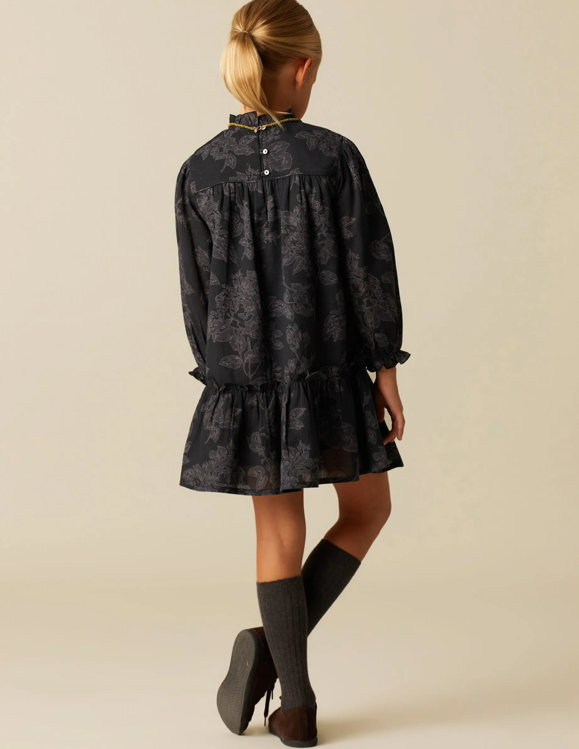 Vestido corto de niña, en estampado de la colección. Patrón con manga larga y cierre por la espalda. Disponible en dos colores.