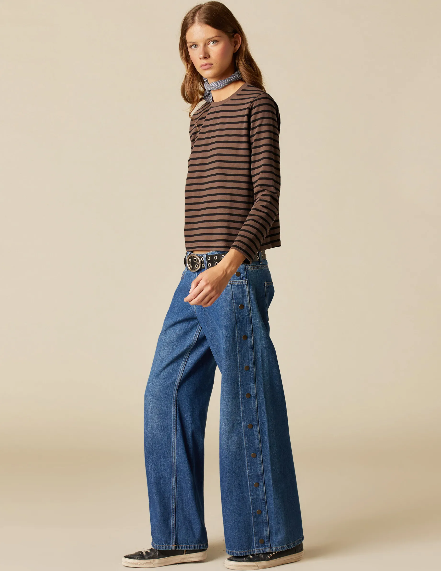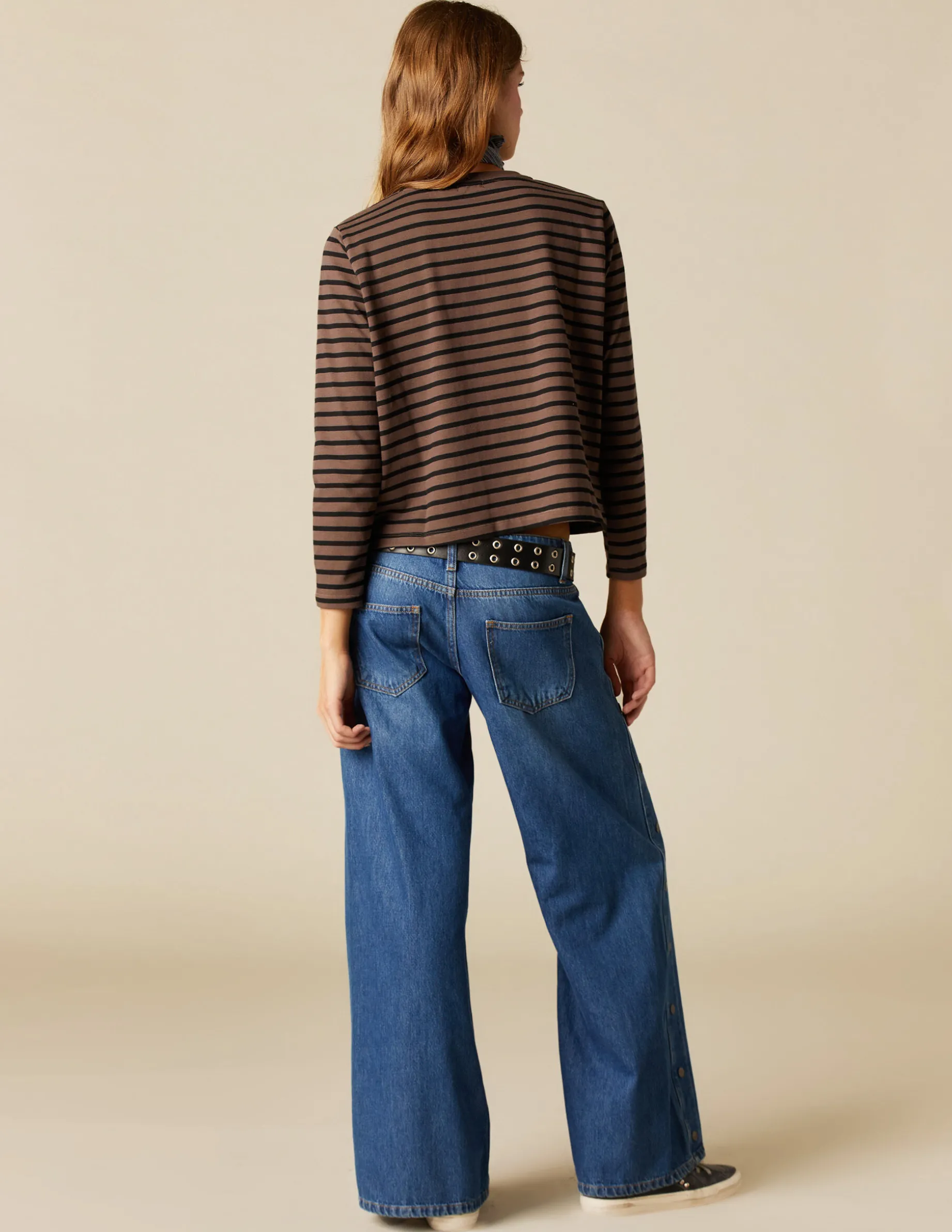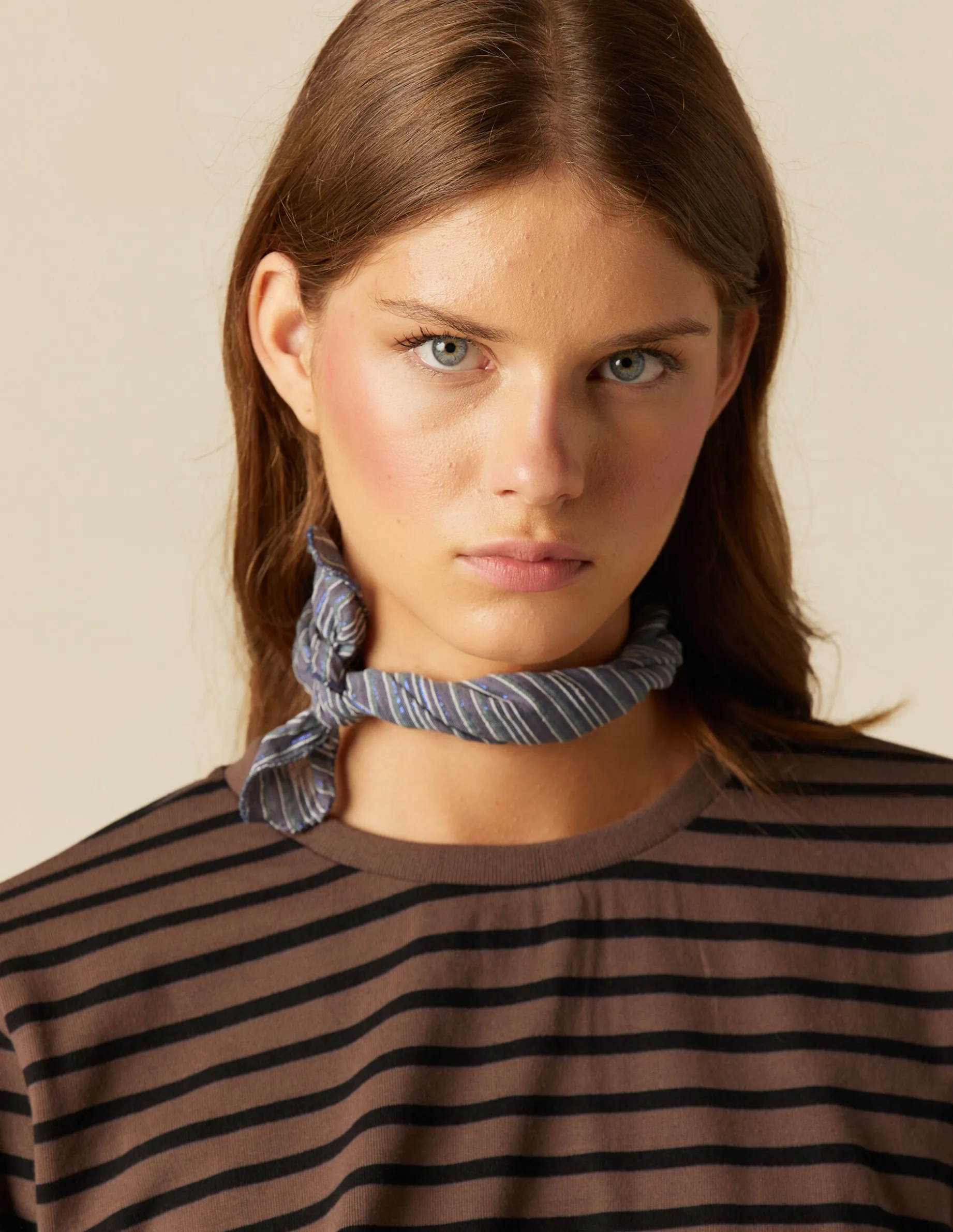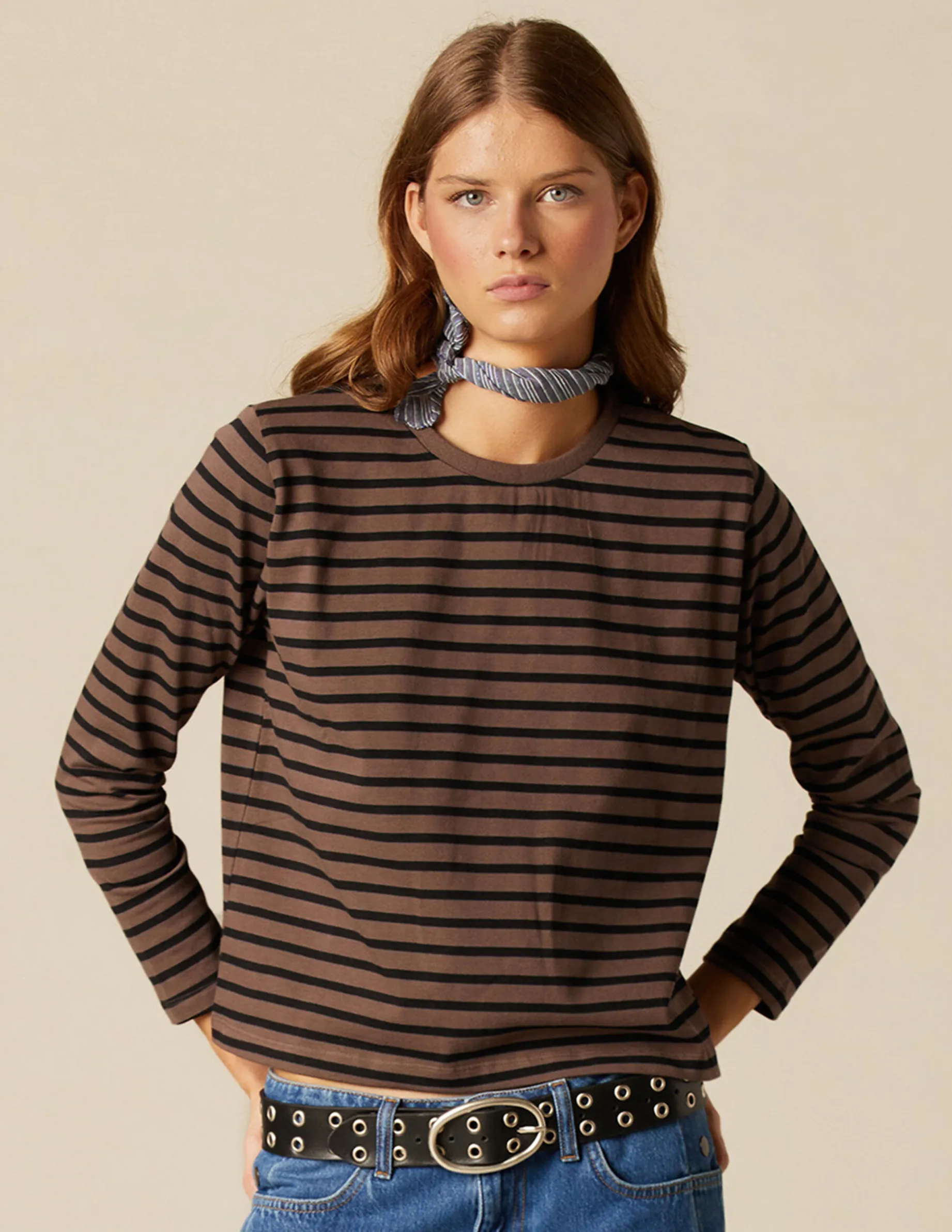 Camiseta de chica, en color de la colección con rayas grandes antracita. Patrón con cuello redondo y manga larga. Parte de los beneficios recibidos se destinan a la Fundación a la Par, con la que Nícoli colabora desde hace años.