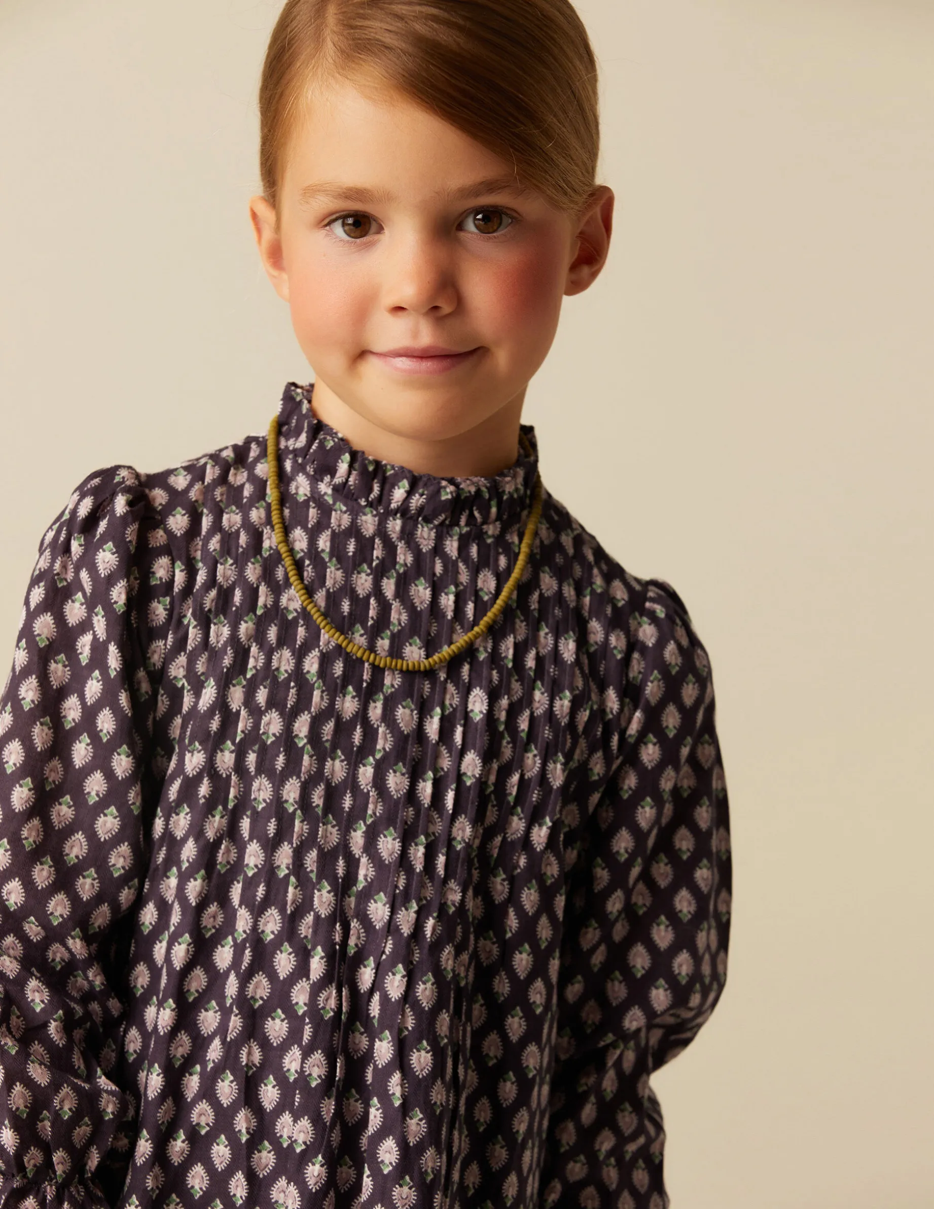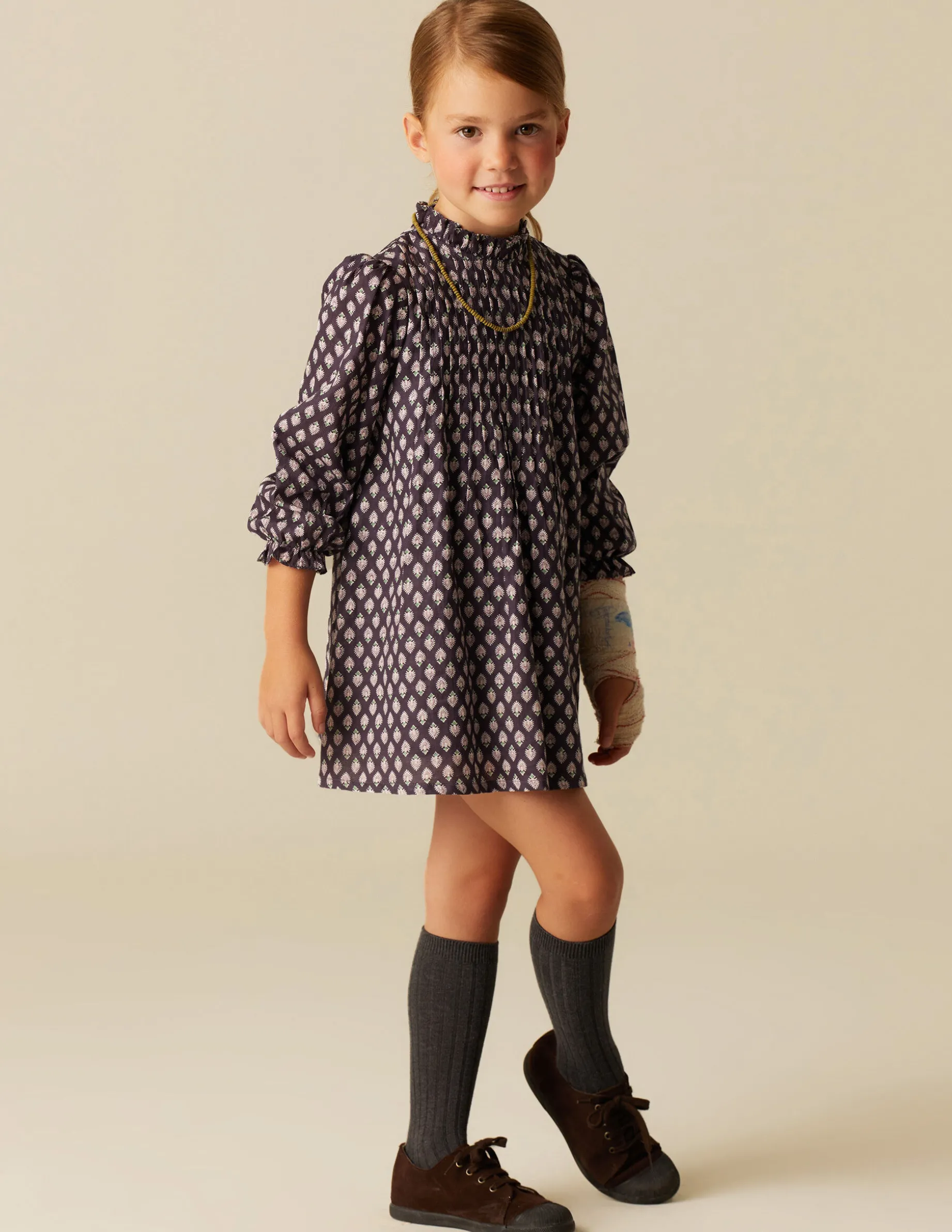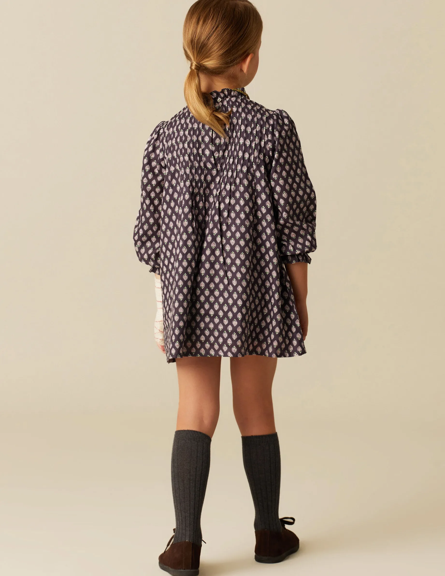 Vestido corto de niña, en print de la colección. Patrón con cuello perkins, manga larga rematada en puño volante. Cierre trasero con botones. Detalle de jaretas. Disponible en dos colores.