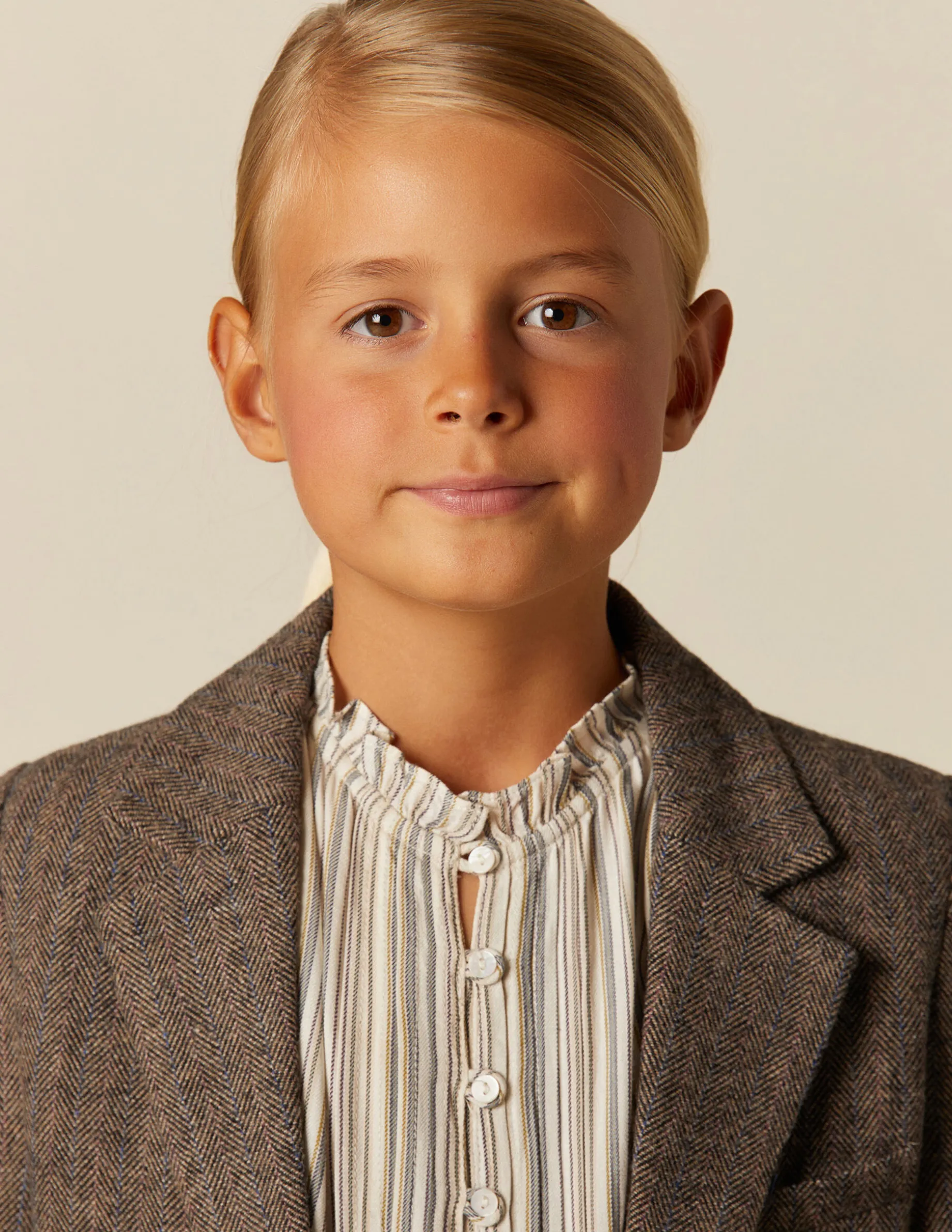 Blazer oversize espiga marrón raya azul. Cierre con botón delantero.