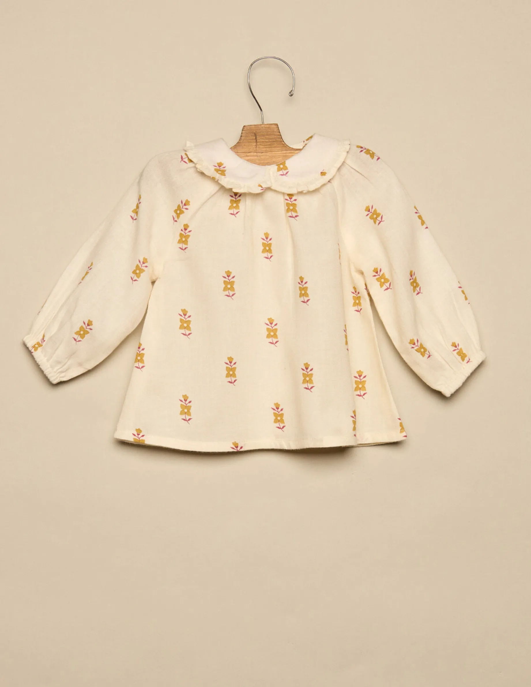 Camisa de bebé en print de la colección. Patrón con cuello lunas, rematado con un volante. Manga larga y cierre frontal.