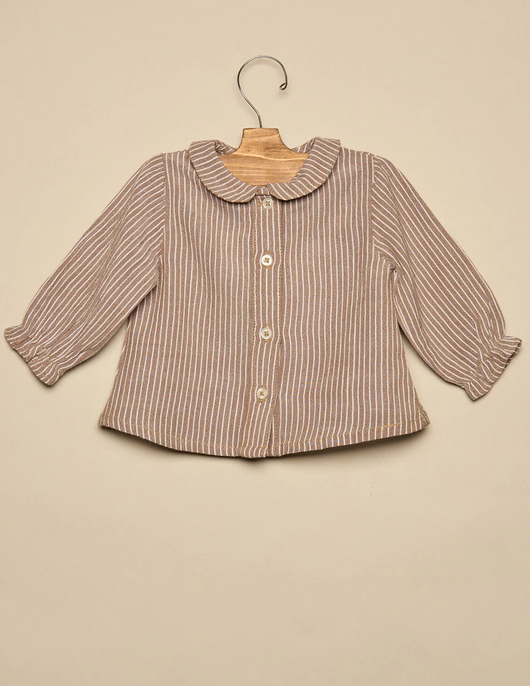 Camisa de bebé, en tejido de rayas en colores de la colección. Patrón con cuello lunas, manga larga, que se abrocha por delante.