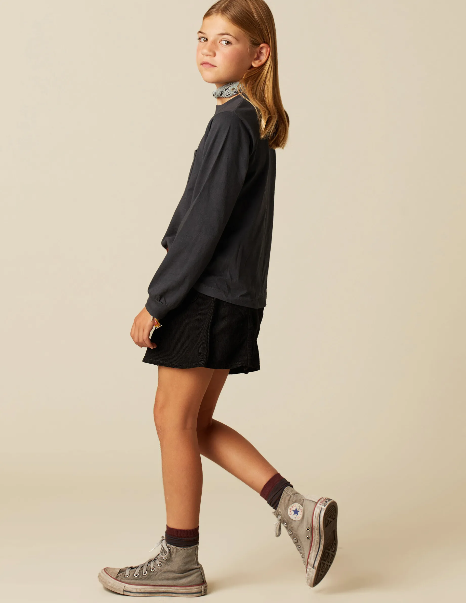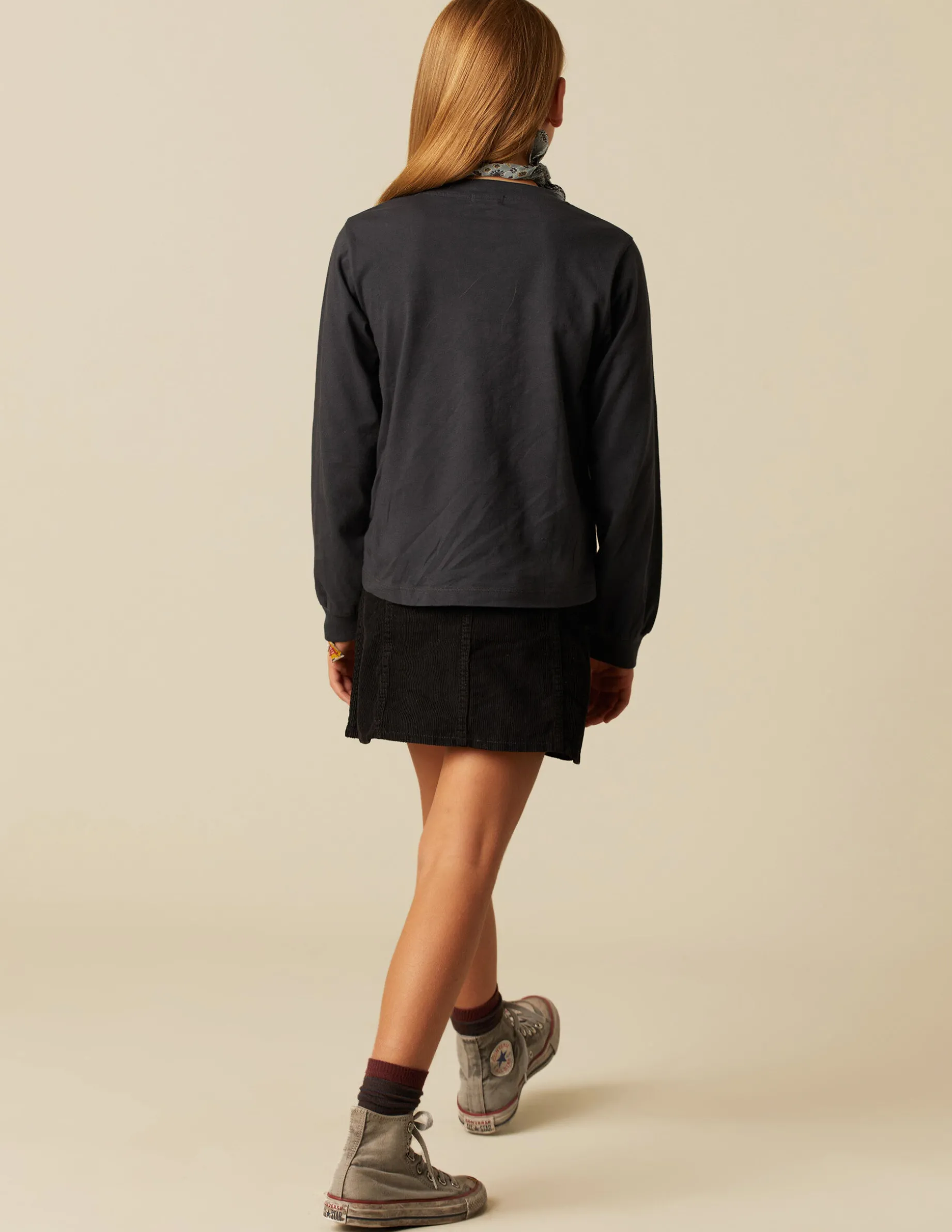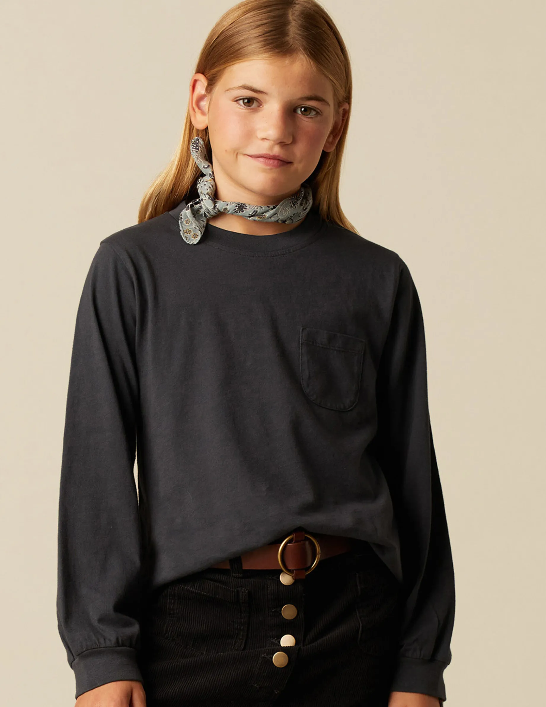 Camiseta básica de chica, patrón con cuello redondo y manga larga. Detalle de logo bordado en el bajo.