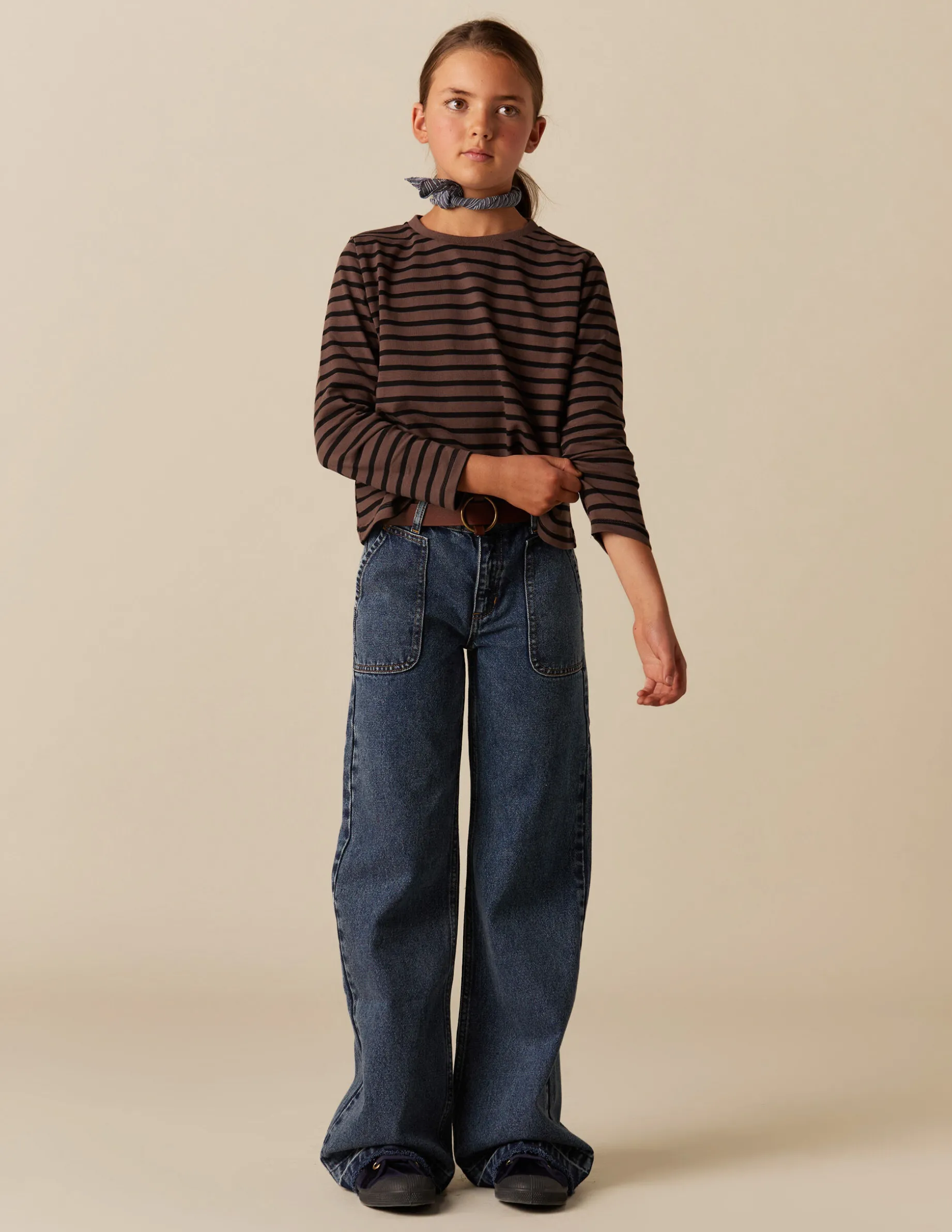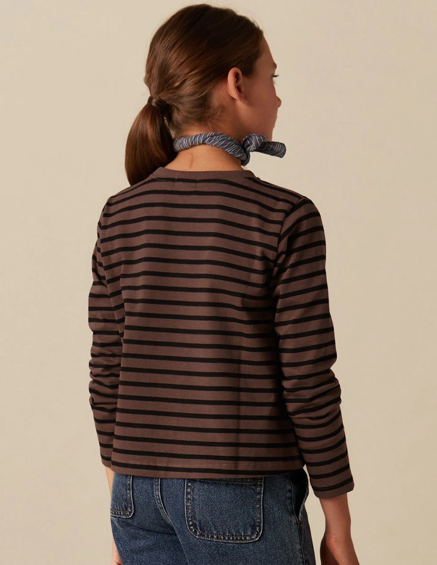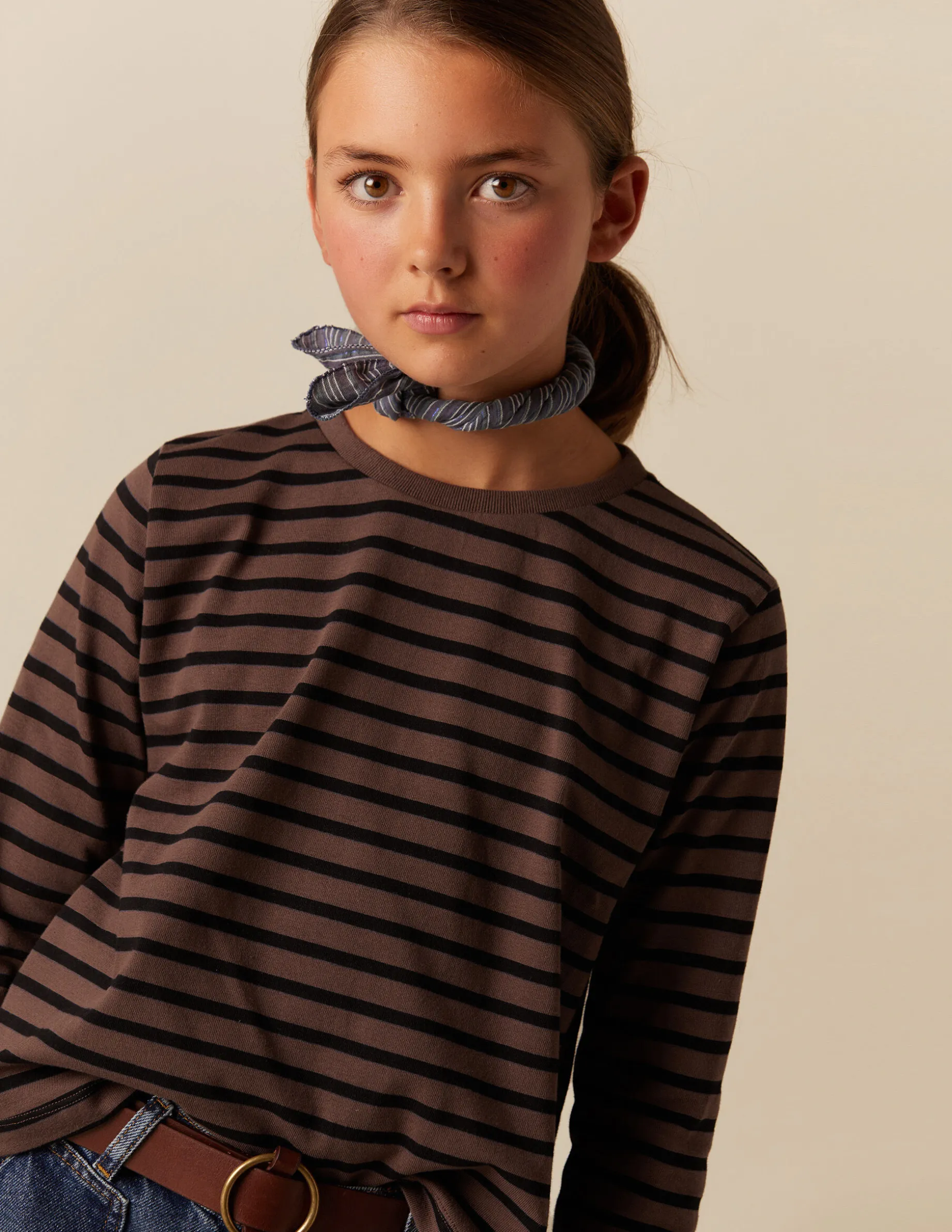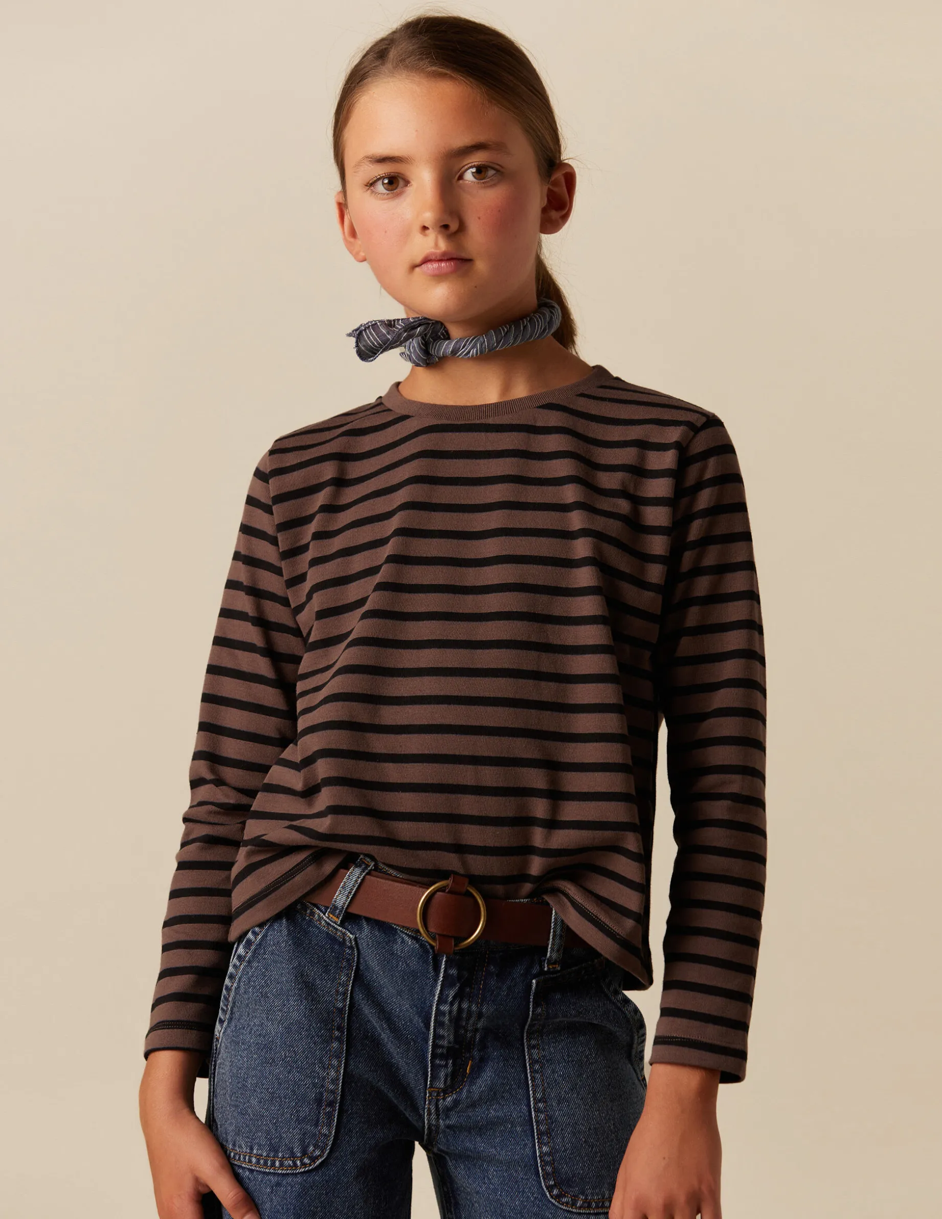 Camiseta de teen, en color de la colección con rayas grandes antracita. Patrón con cuello redondo y manga larga. Parte de los beneficios recibidos se destinan a la Fundación a la Par, con la que Nícoli colabora desde hace años.