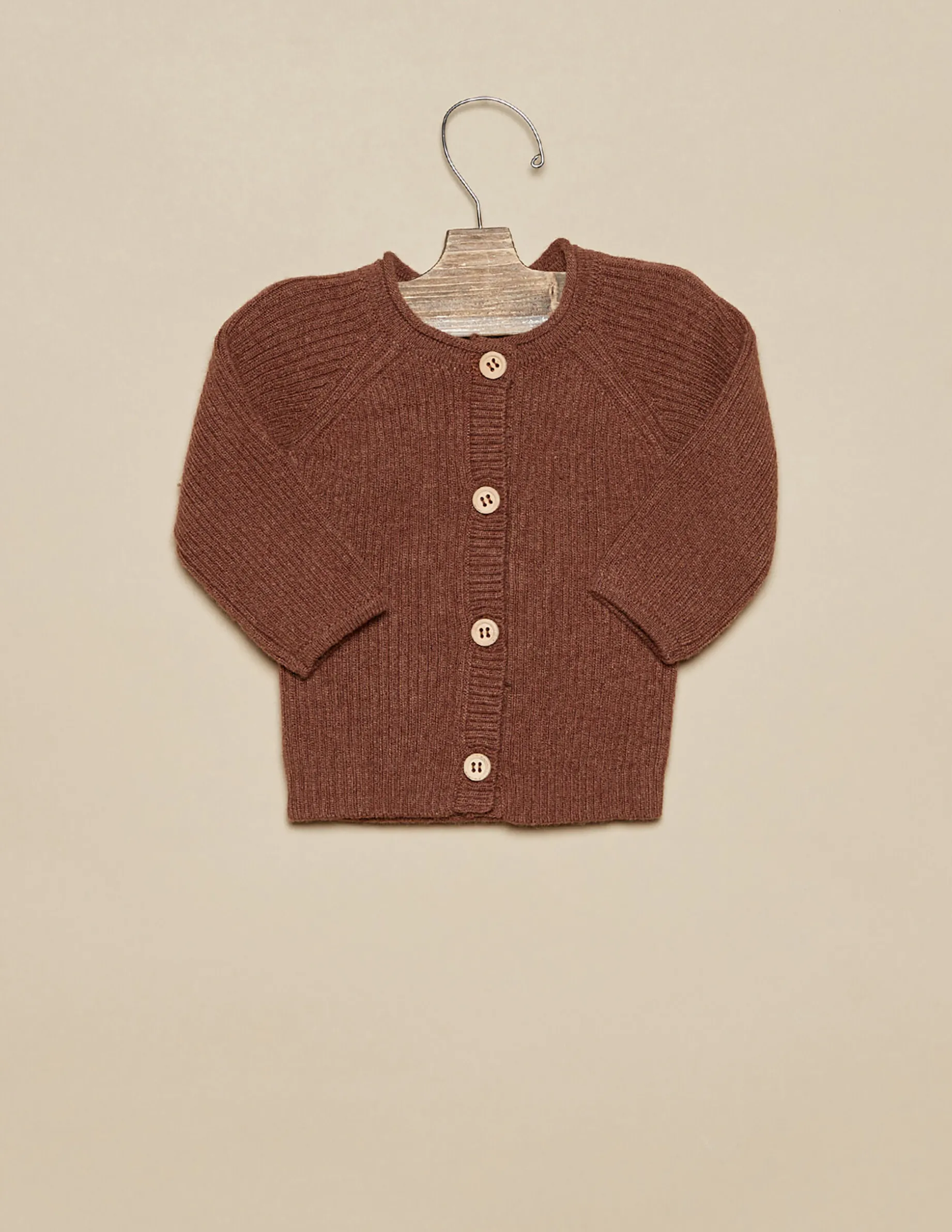 Chaqueta de bebé en punto de color marrón, con botones de madera.
