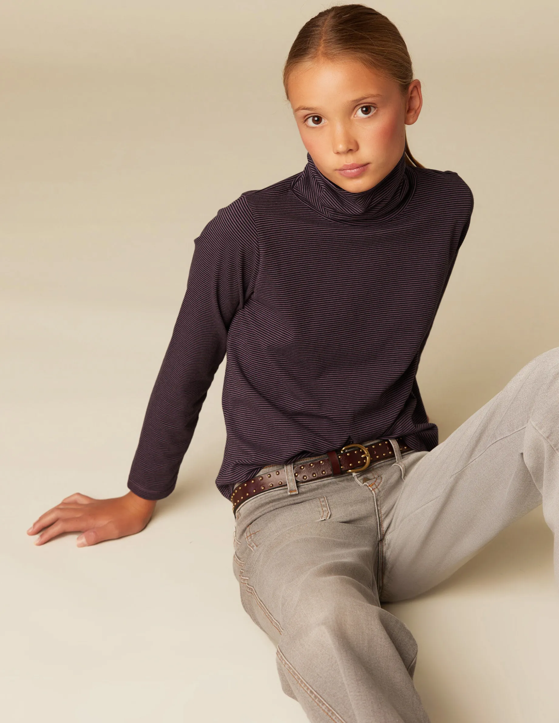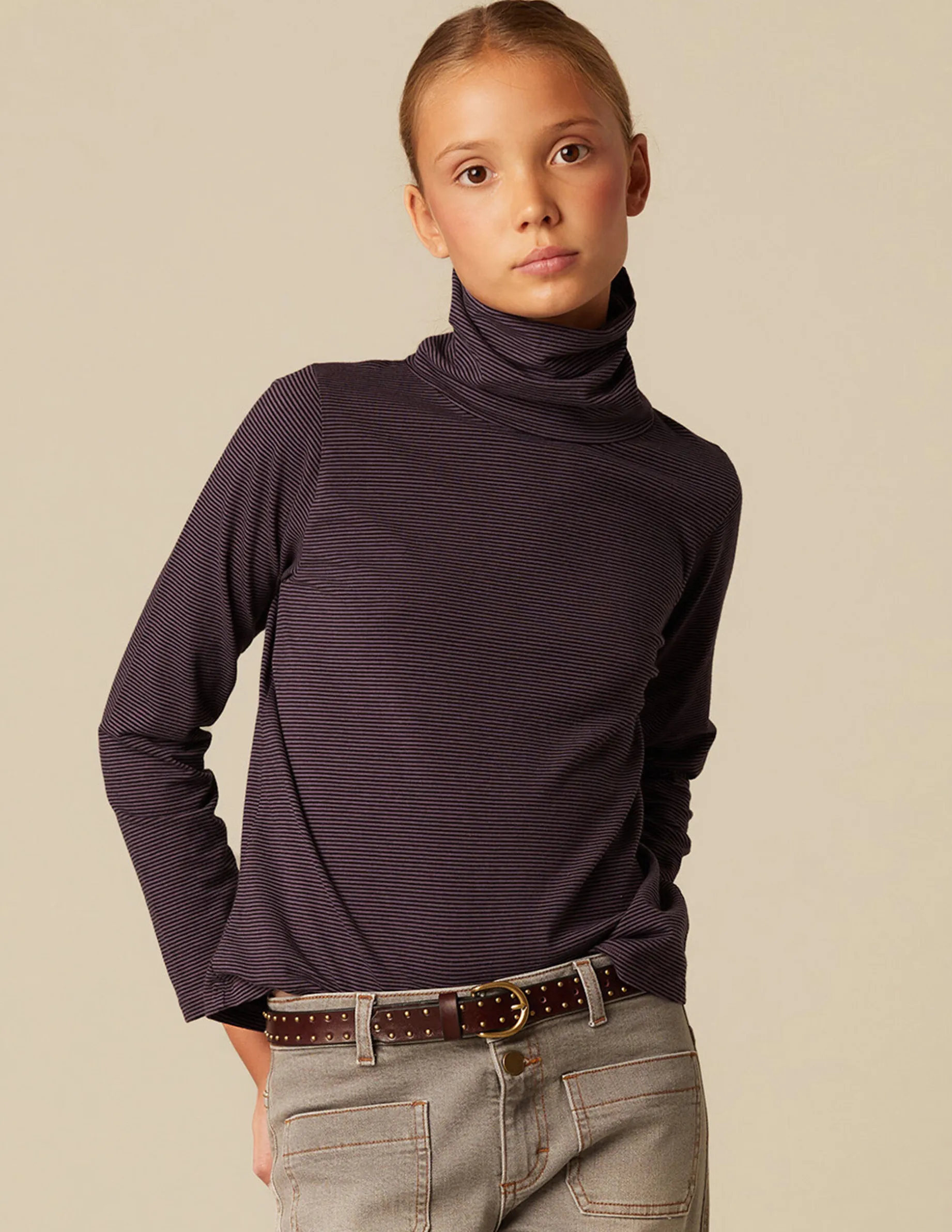 Camiseta benéfica de rayas, de teen. Patrón con cuello vuelto y manga larga.
