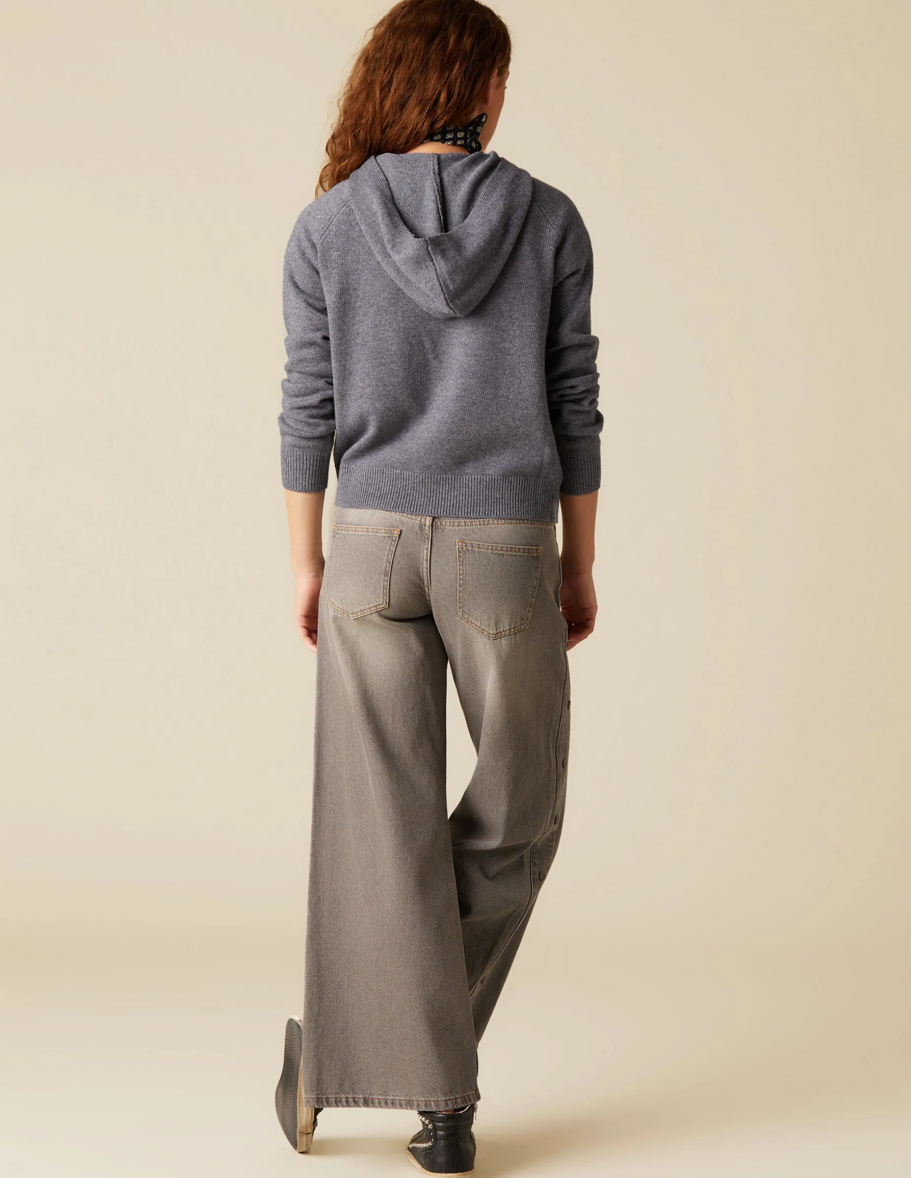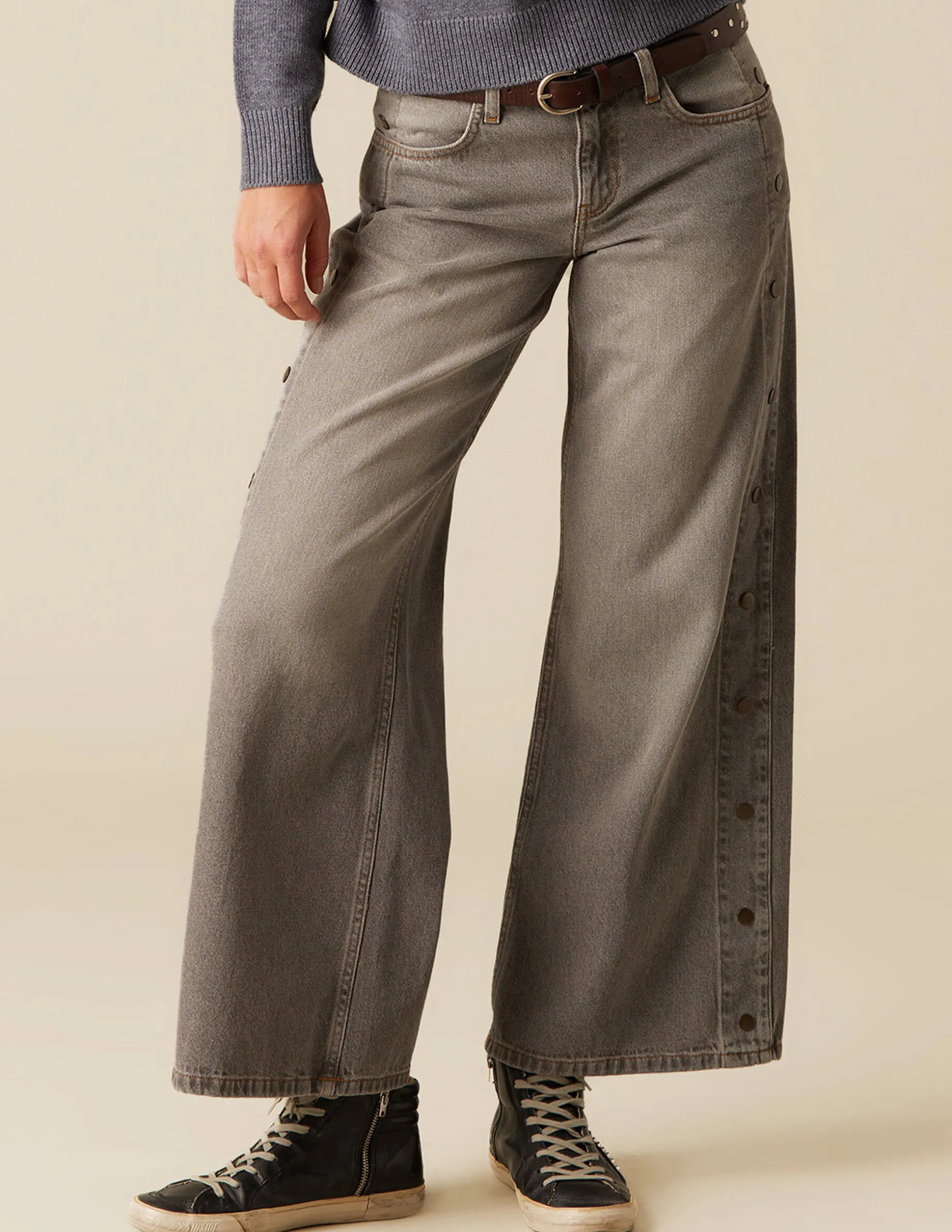 Pantalón largo vaquero lavado. Detalle botones laterales. Cierre con cremallera y botón.