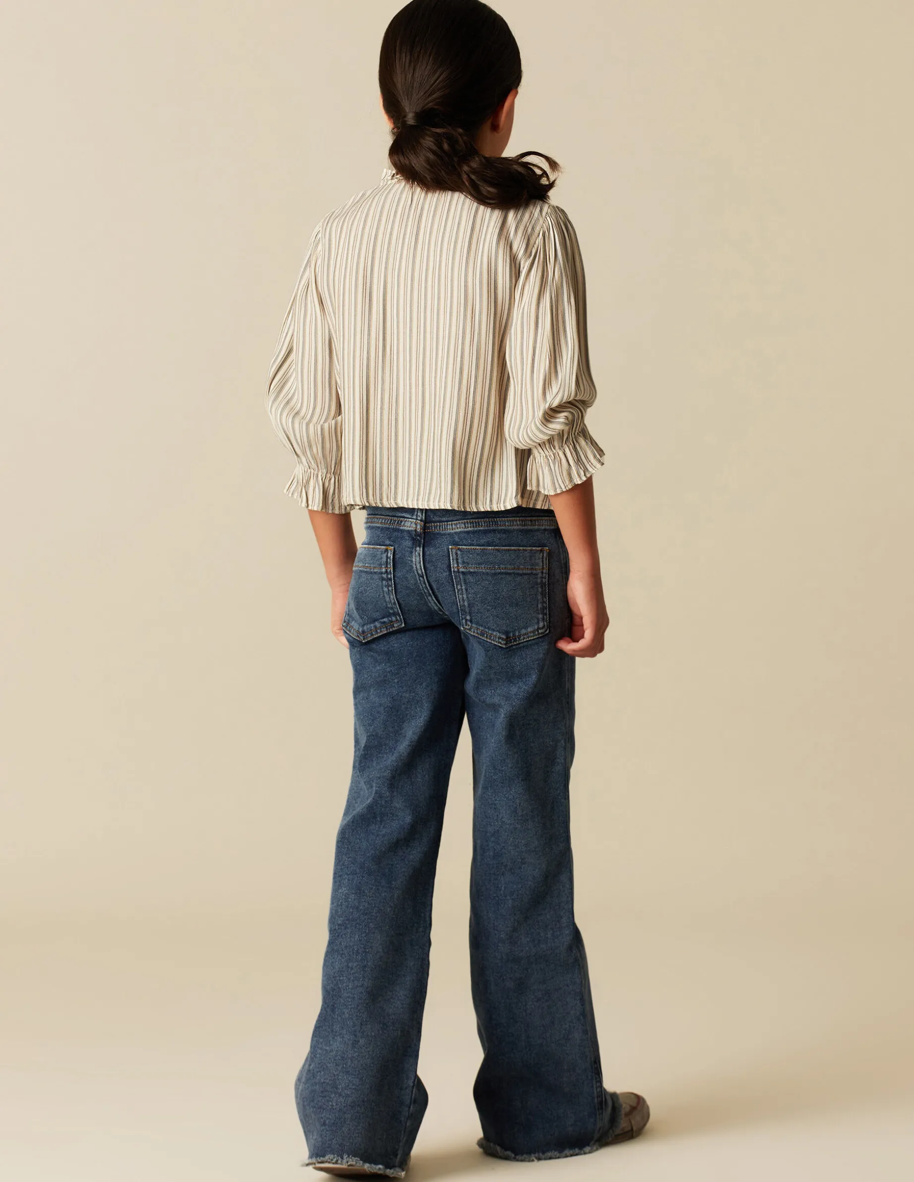 Camisa cruda de teen, con rayas en colorido de la colección. Patrón con cuello perkins, jaretas y botones hasta la altura del pecho. Manga larga.