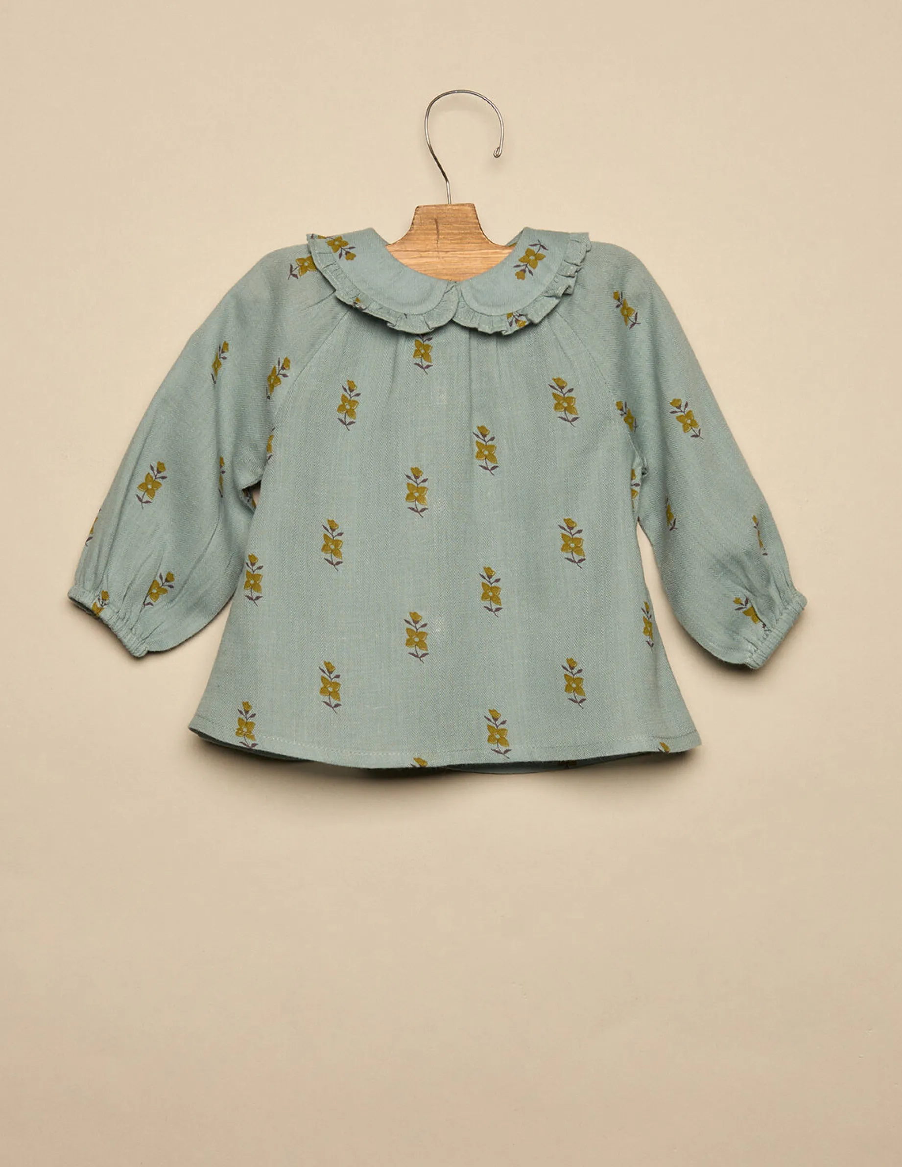 Camisa de bebé en print de la colección. Patrón con cuello lunas, rematado con un volante. Manga larga y cierre frontal.