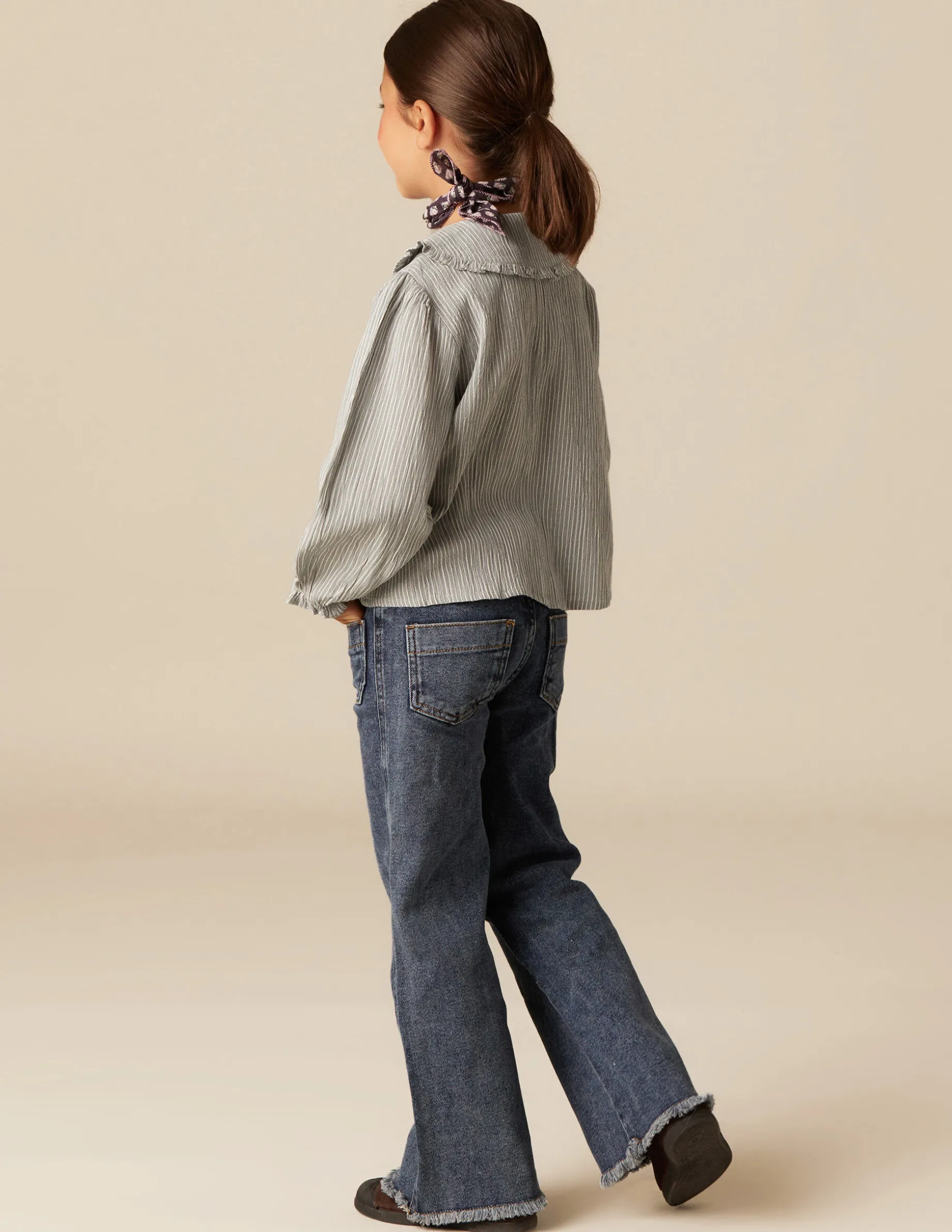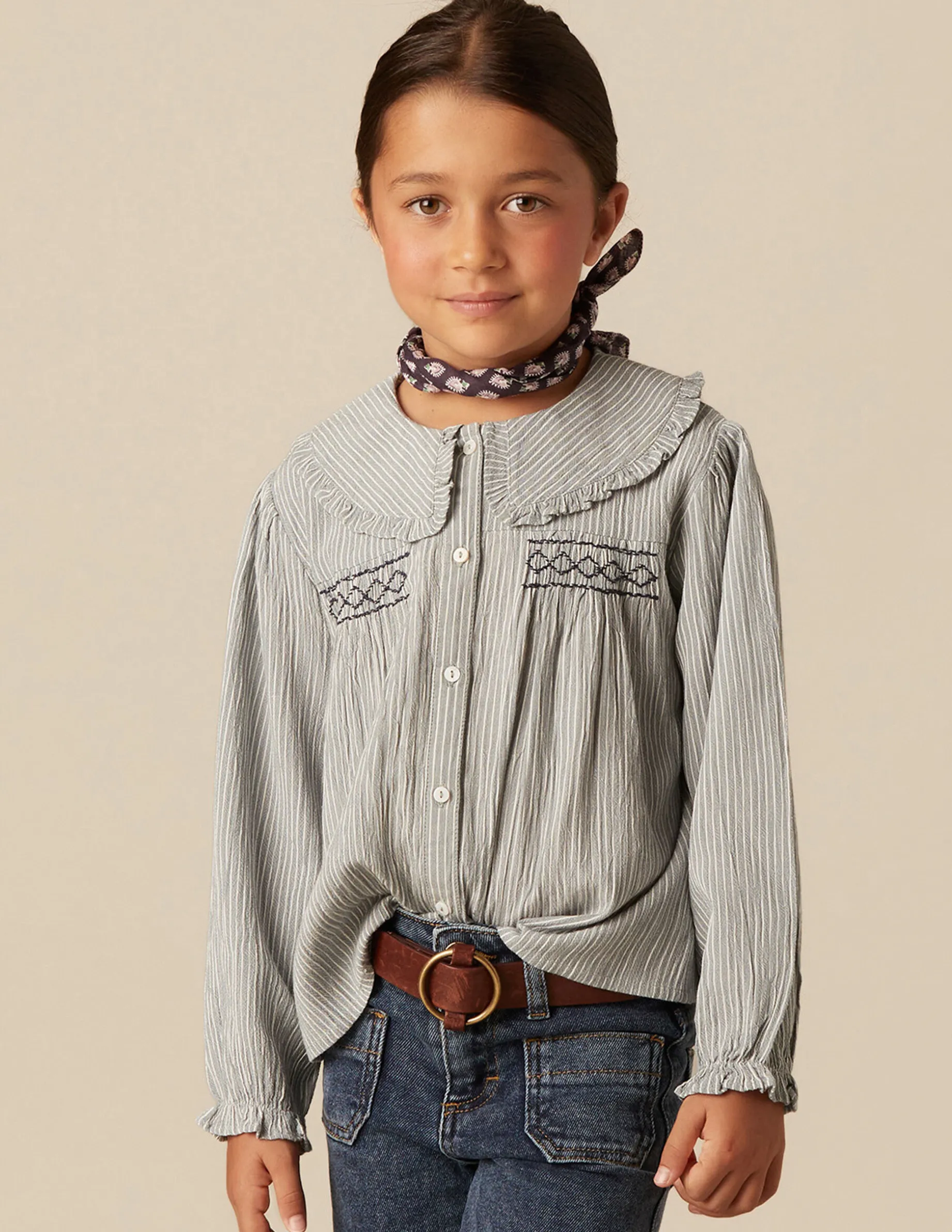 Camisa de niña en tejido de rallas de algodón. Patrón con cuello grande, manga larga y cierre delantero con botones. Detalle de nidos en la zona del peco.