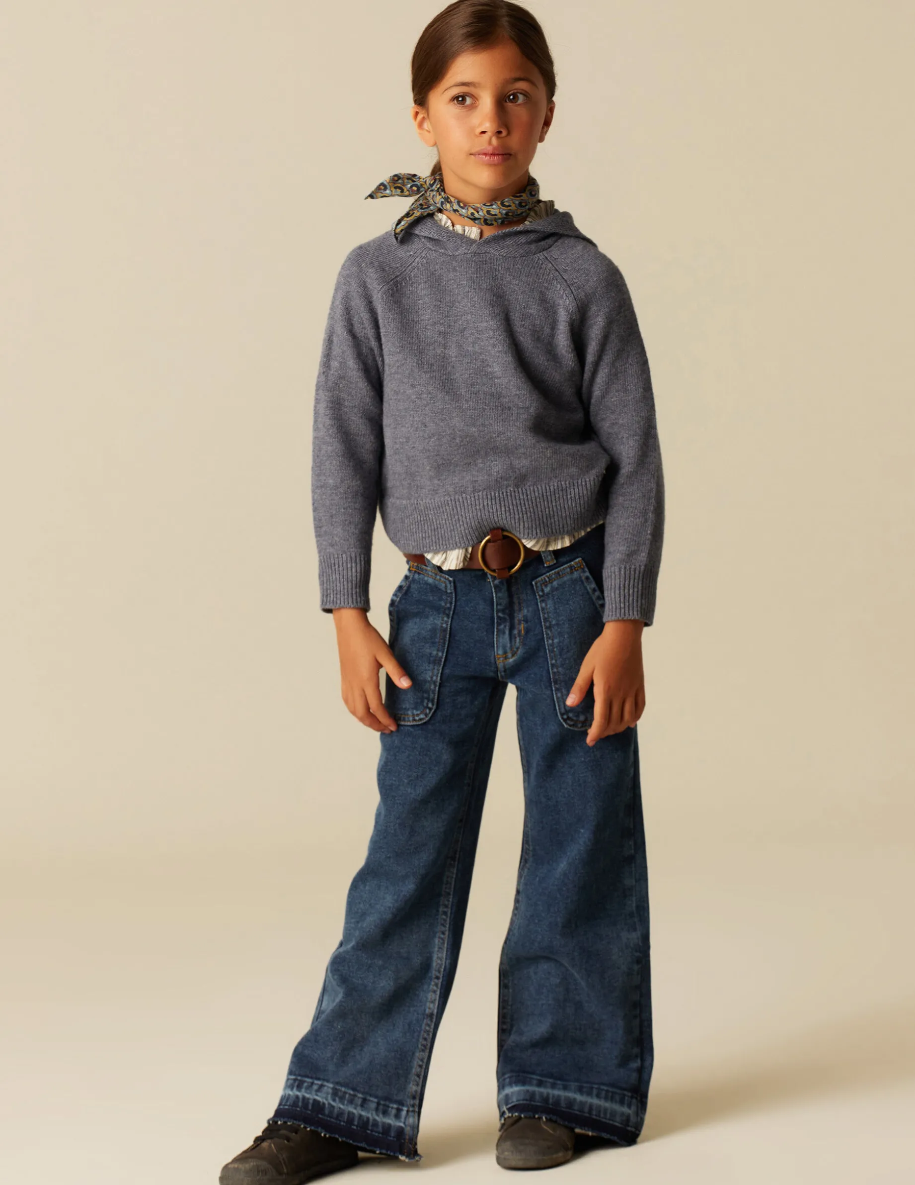Jersey azul jaspeado con cuello cerrado. Detalle capucha.