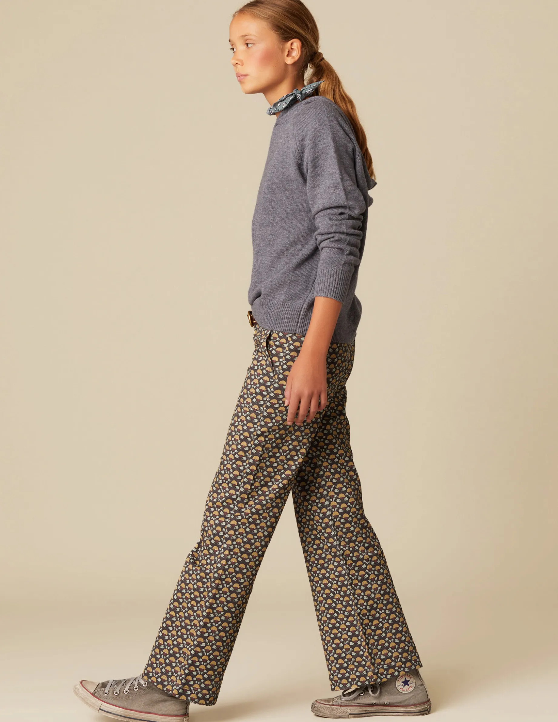 Pantalón wide leg estampado con bolsillos. Cierre con botón metálico y cremallera.