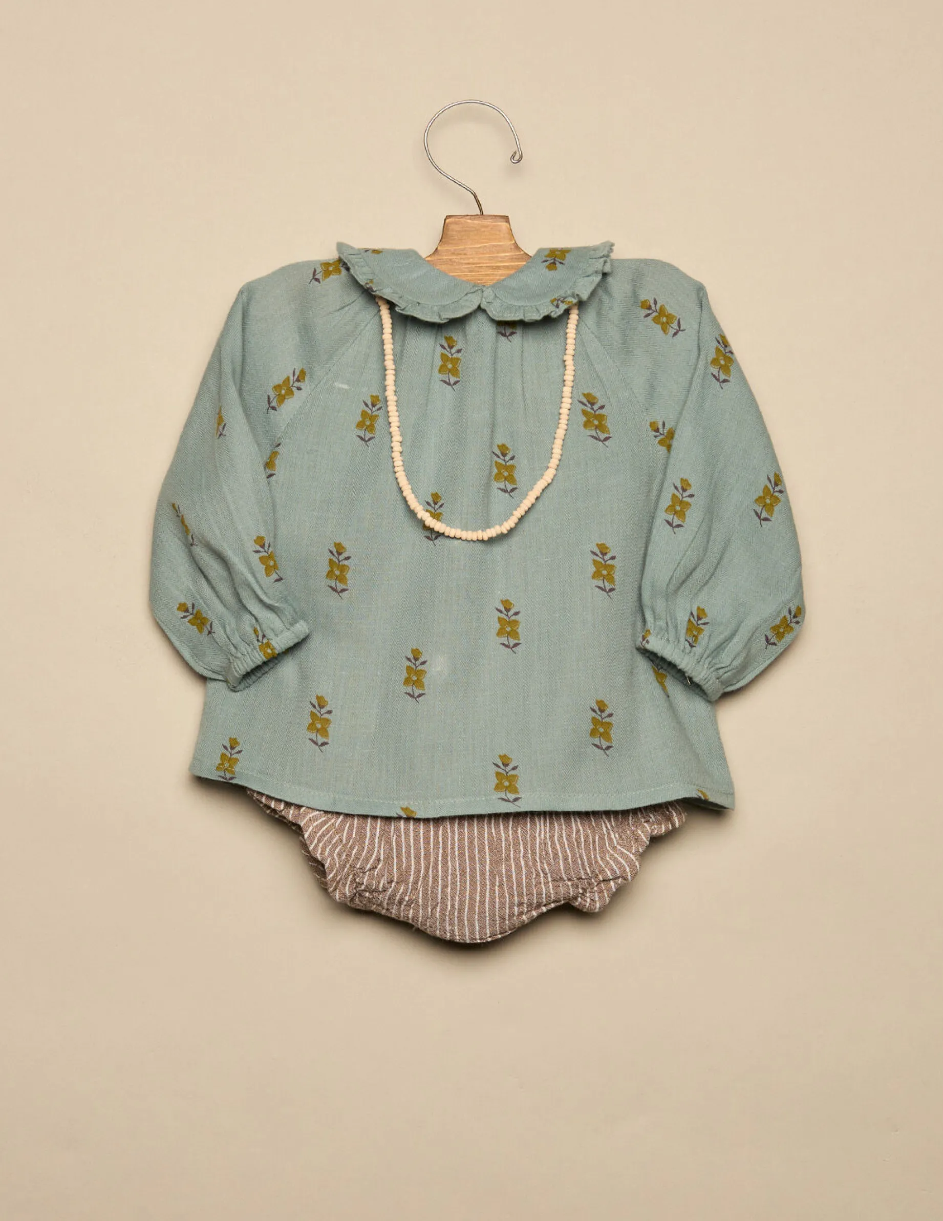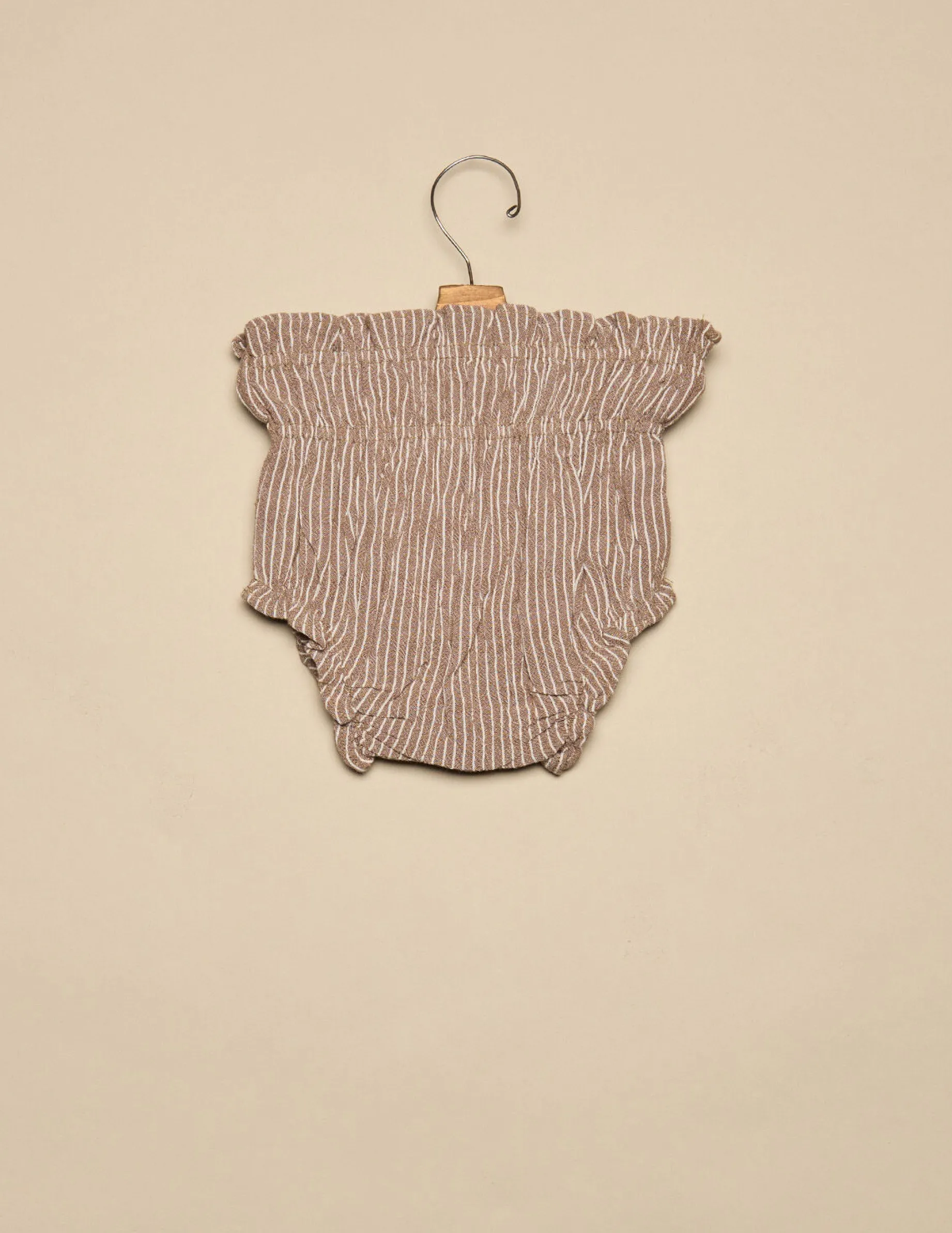 Pololo de bebé en tejido de rayas en colores de la colección. Patrón con gomitas en cinturilla y piernas.