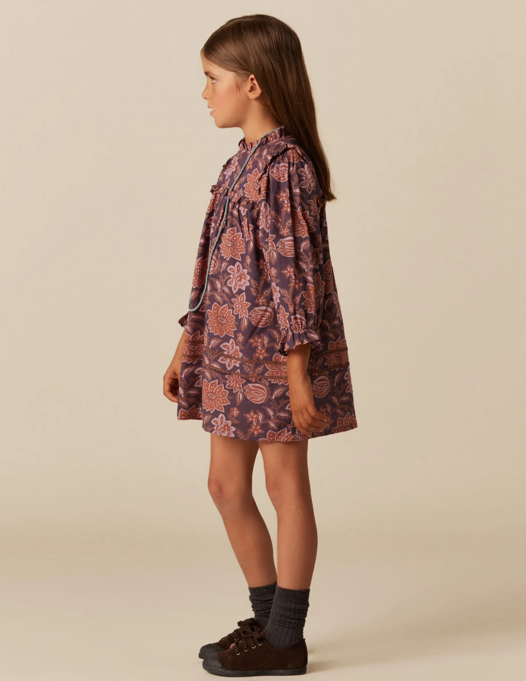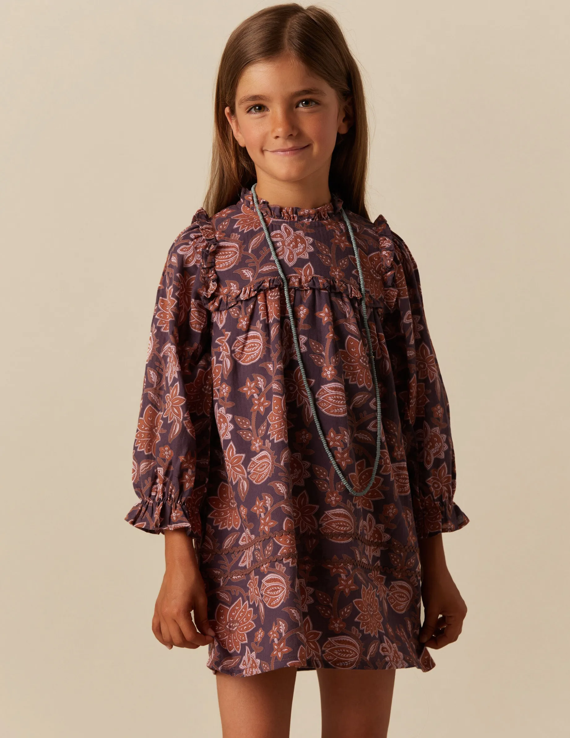 Vestido corto de niña en print de la colección. Patrón con cuello perkins, manga larga y detalle de jaretas en la zona del pecho. Se abrocha por la espalda con botones.