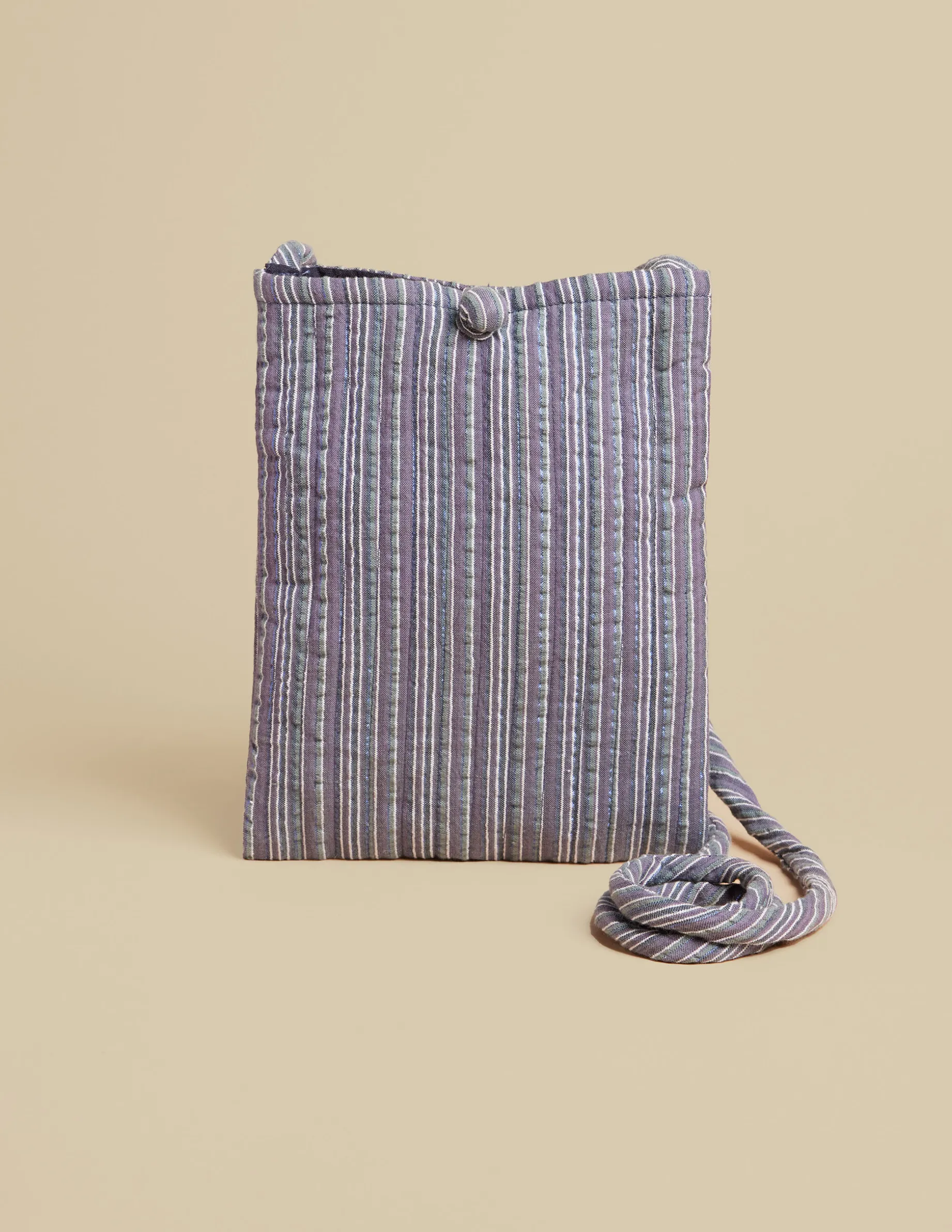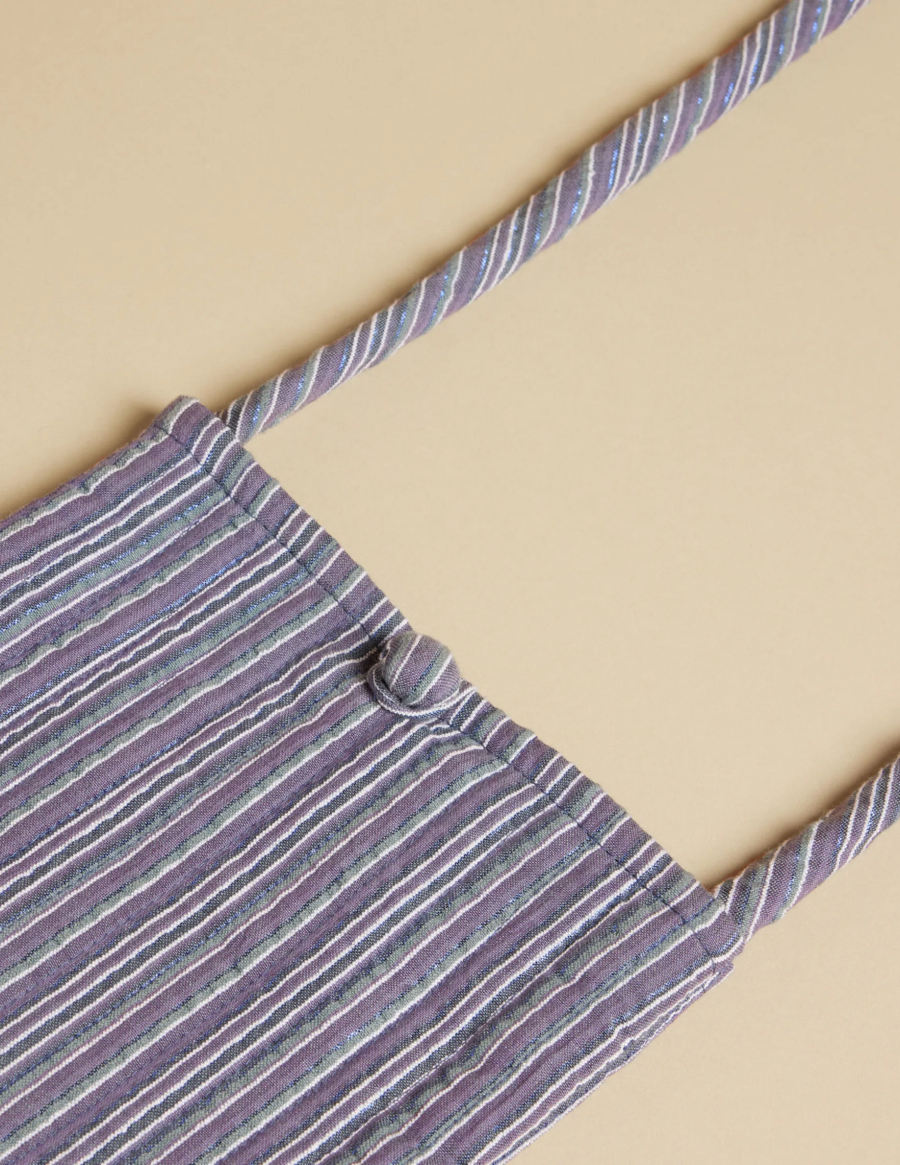 Bandolera en tejido de algodón de rayas, con detalle de lurex. Cierre con botón forrado. Medidas: 22cm de alto x 17,5cm de ancho. Alto del asa 65cm.