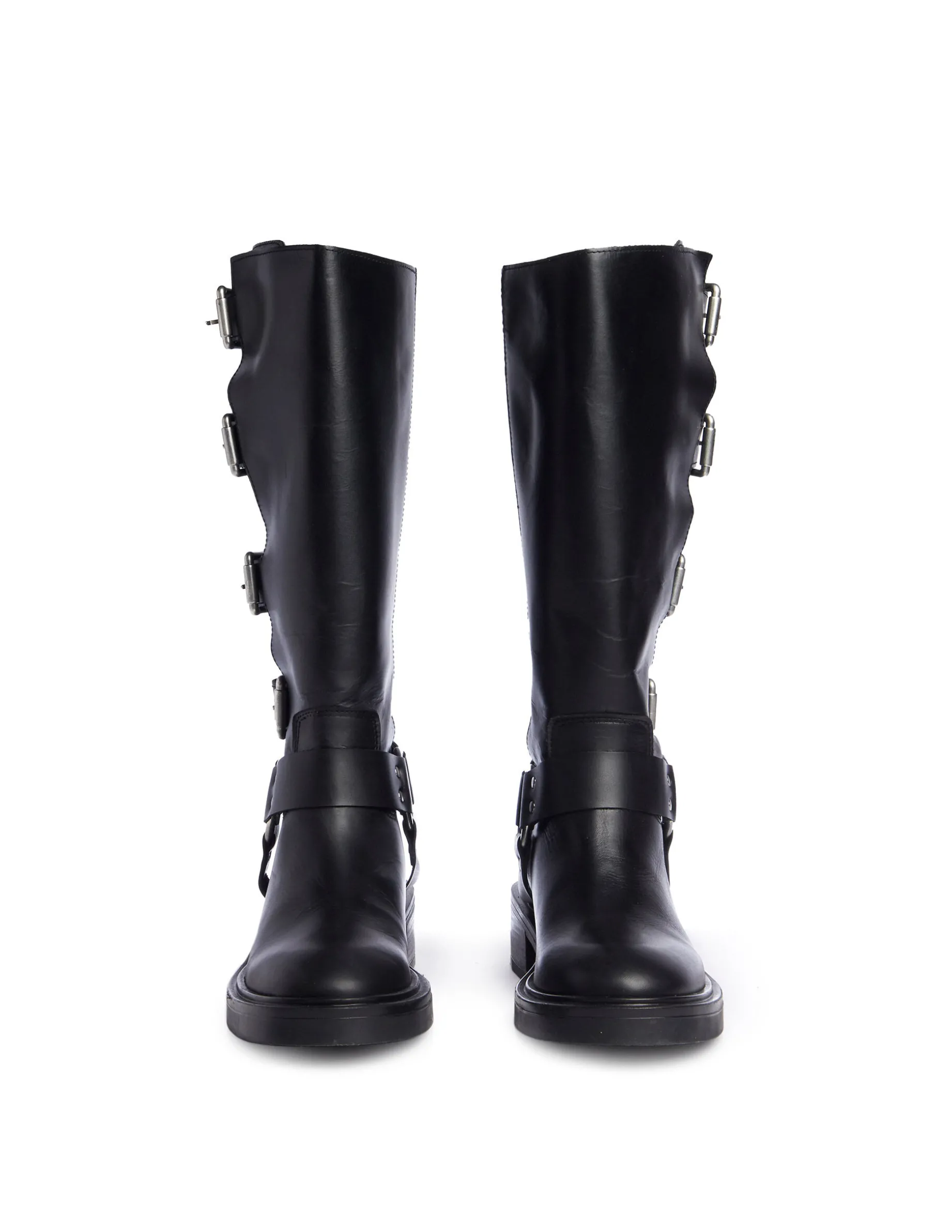 Bota negra alta. Cierre con hebillas en baño plateado.