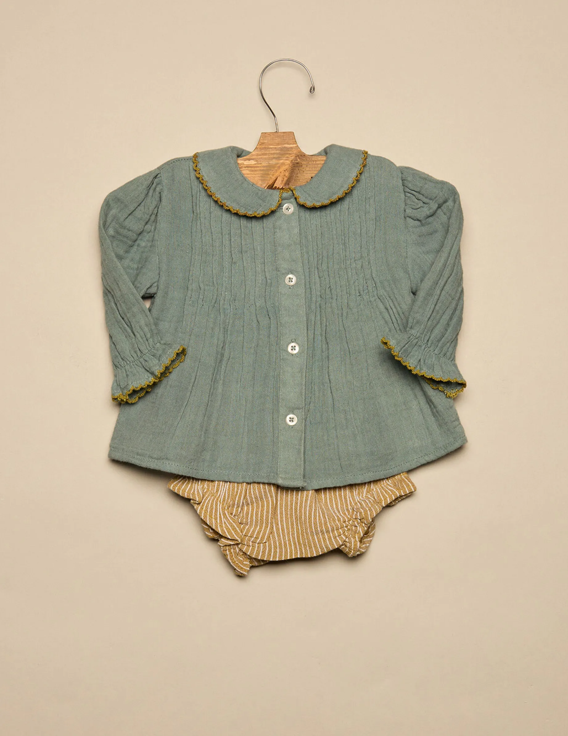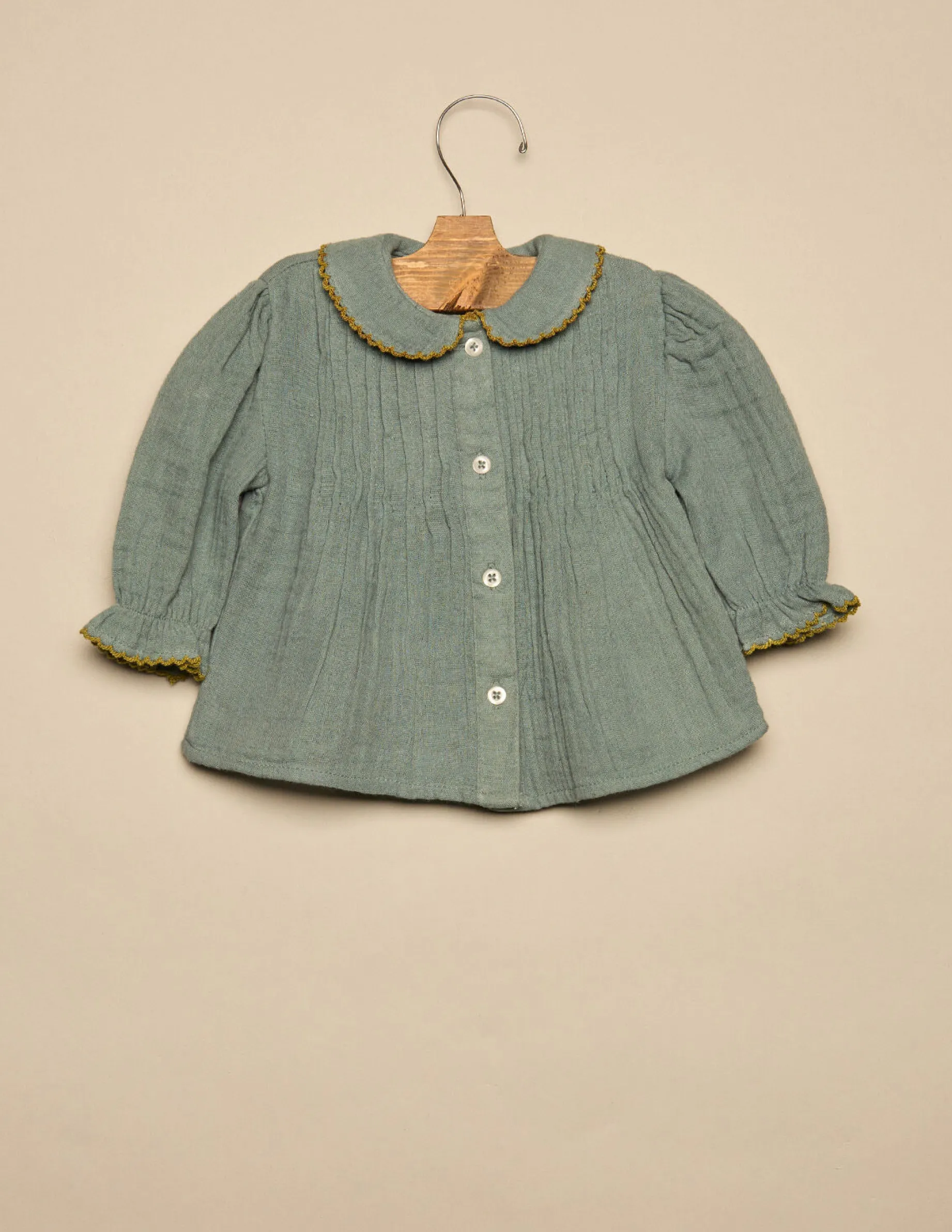 Camisa de bebé, en color liso de la colección, con detalle de pespunte a contraste en cuello y mangas. Patrón con cuello bebé, manga larga rematada con volante, y jaretas en la zona delantera.