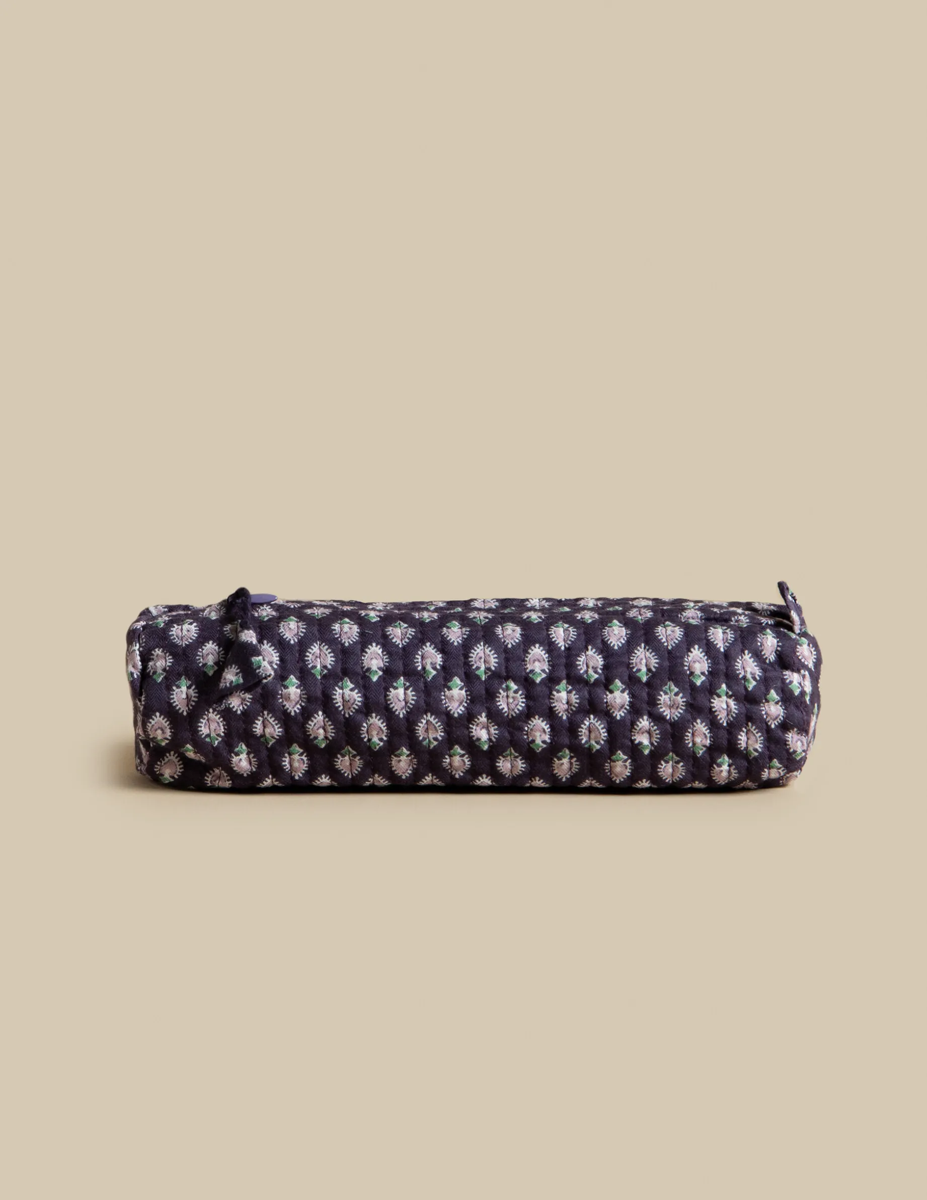 Estuche guateado, en print de la colección. Cierre con cremallera, rematada con un tirador de hilo. Forma cilíndrica: Largo 24cm x 6,5cm de alto. Disponible en dos colores.
