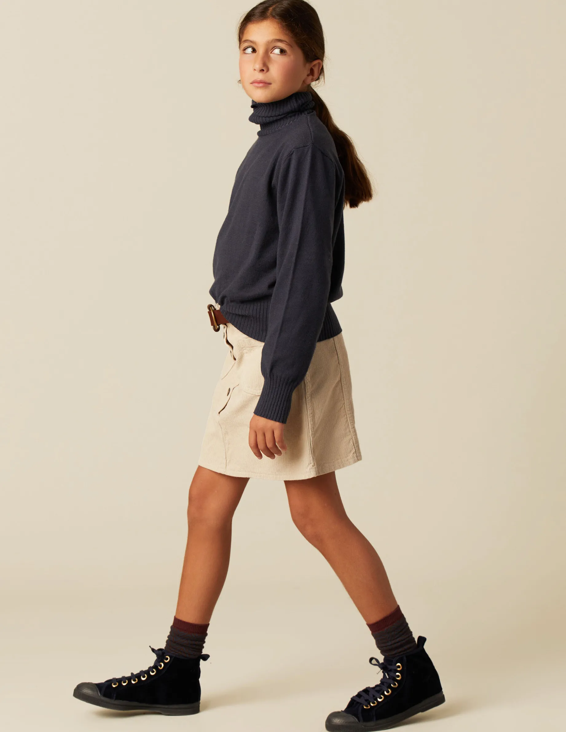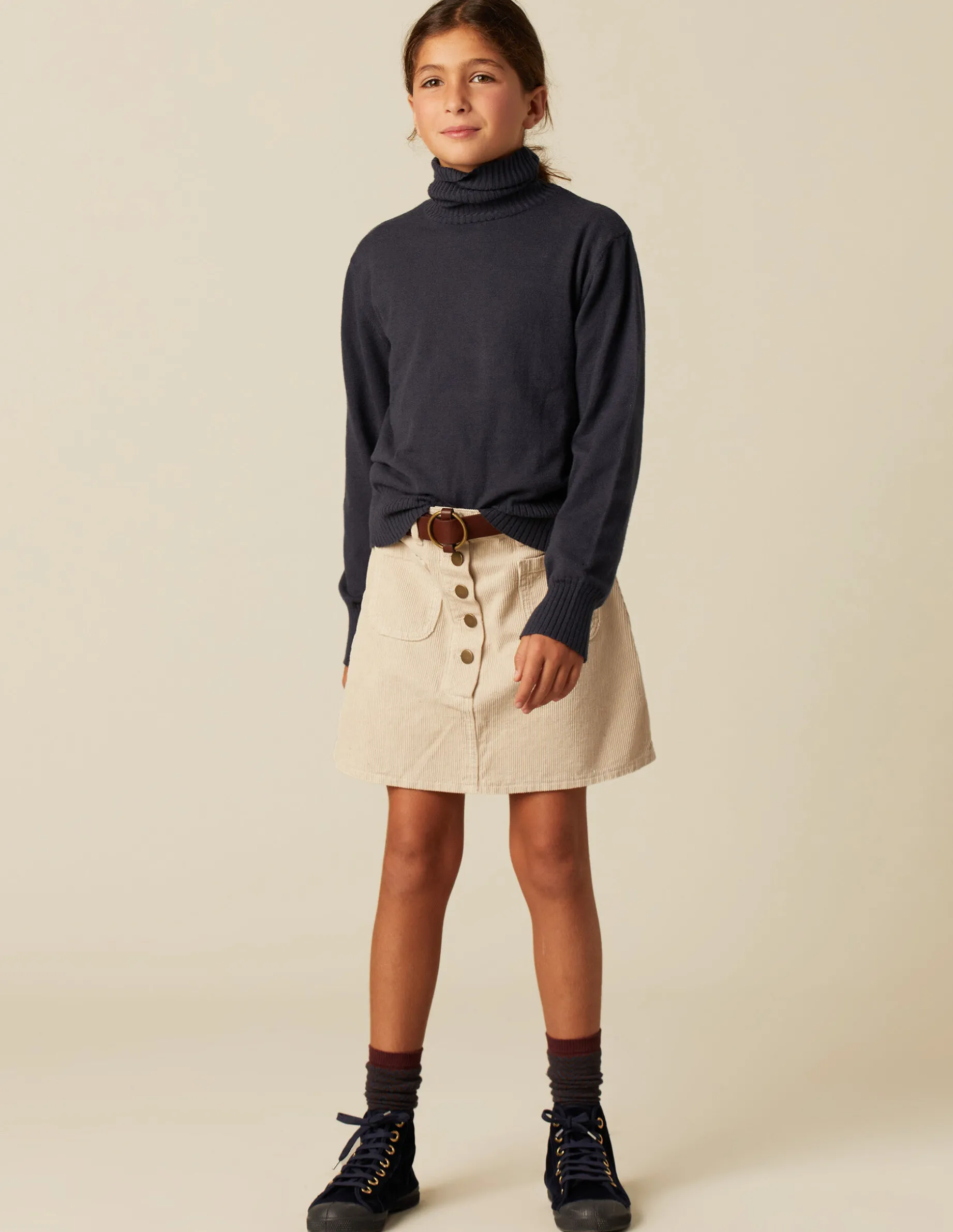 Minifalda de pana con bolsillos y lavado. Cierre frontal con botones.