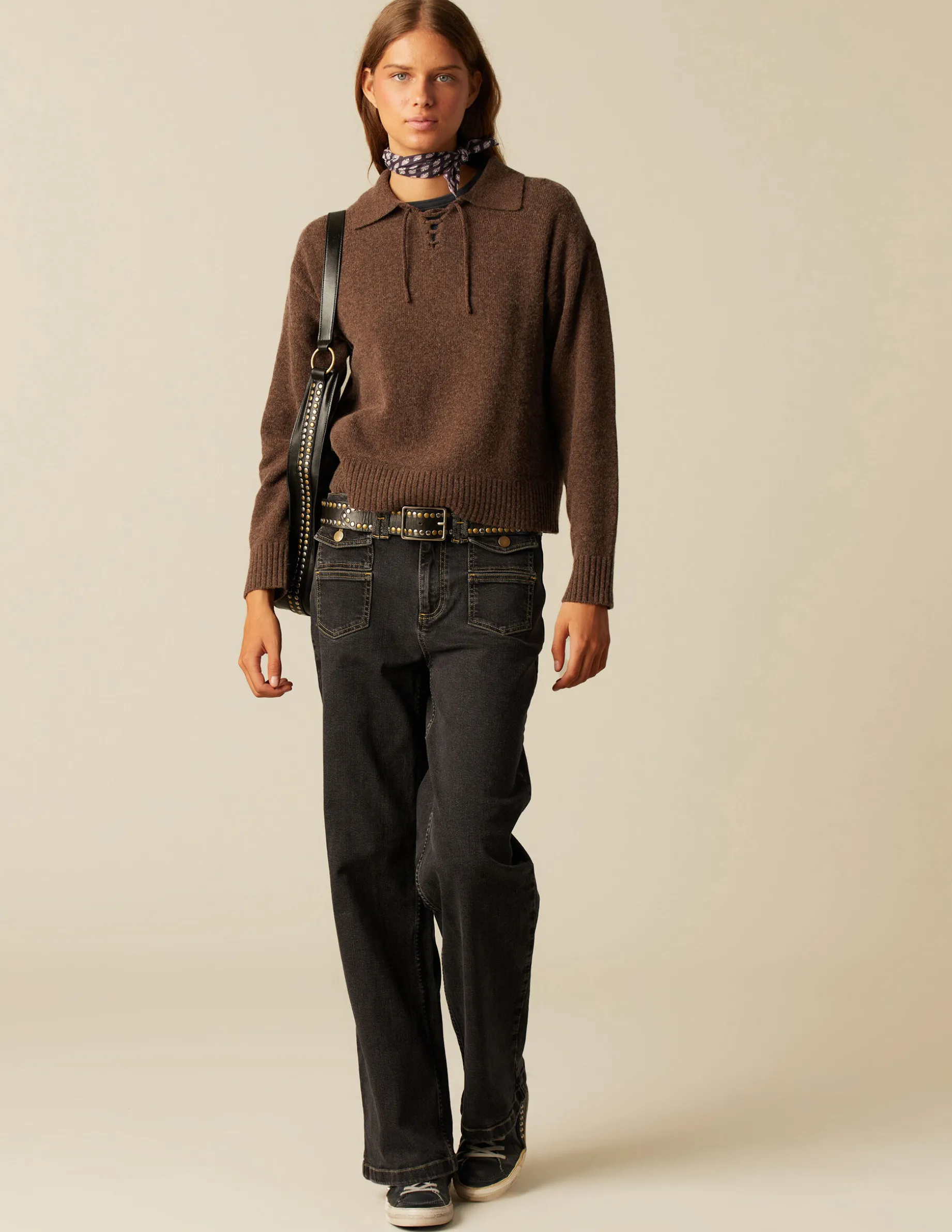 Jersey marrón jaspeado y cuello solapa con detalle de lazo.